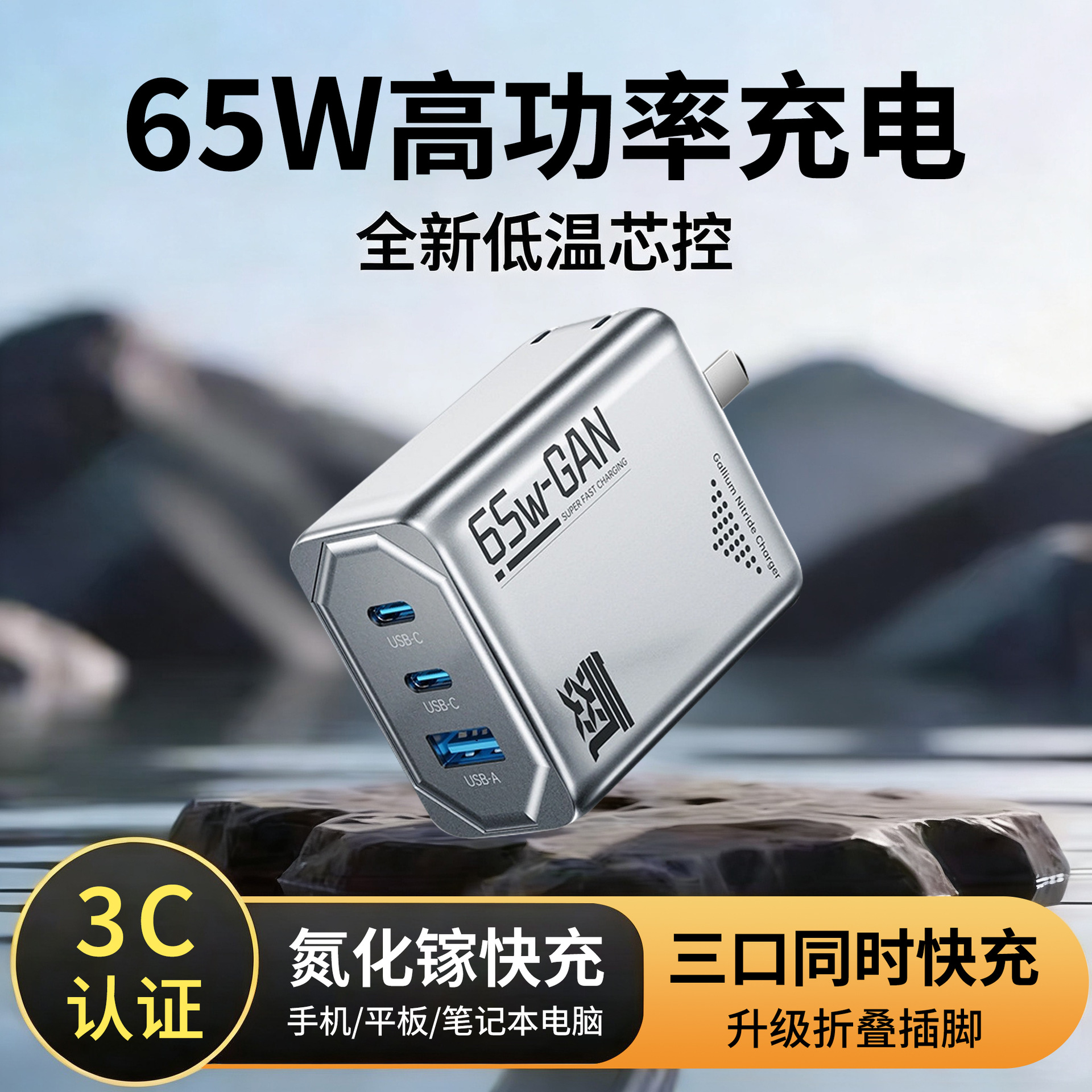 新品氮化镓快充65W便携三口充电器适用于苹果安卓手机笔记本电脑
