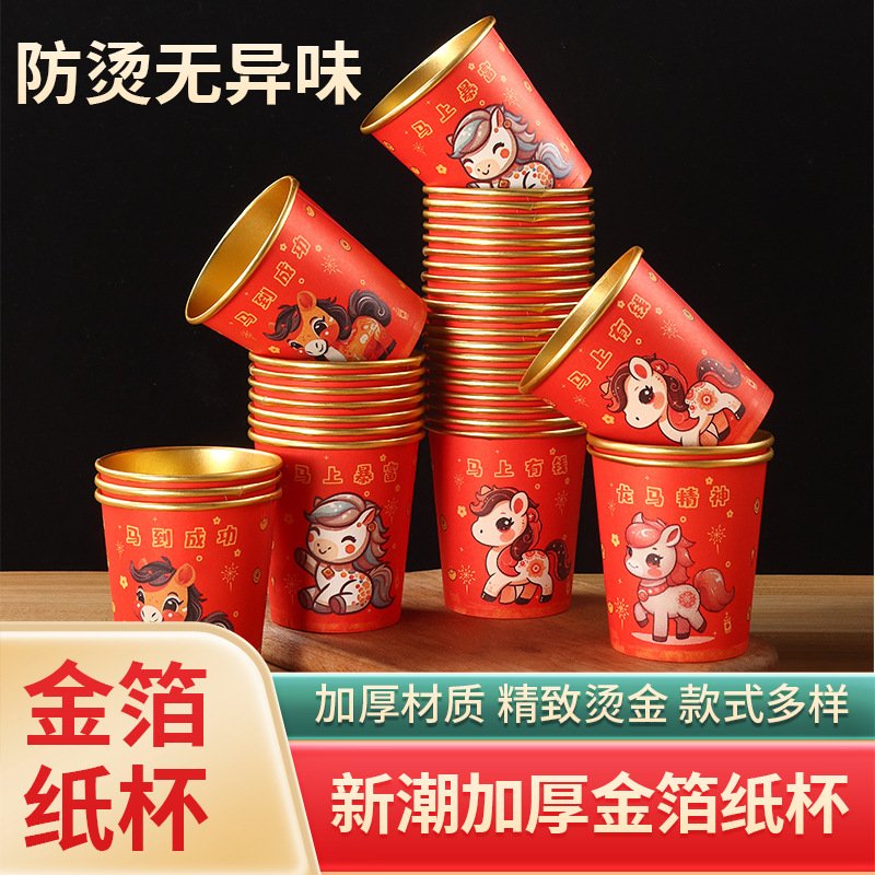 2026马年金箔纸杯一次性红色杯子加厚防烫耐高温家用春节新年贺岁