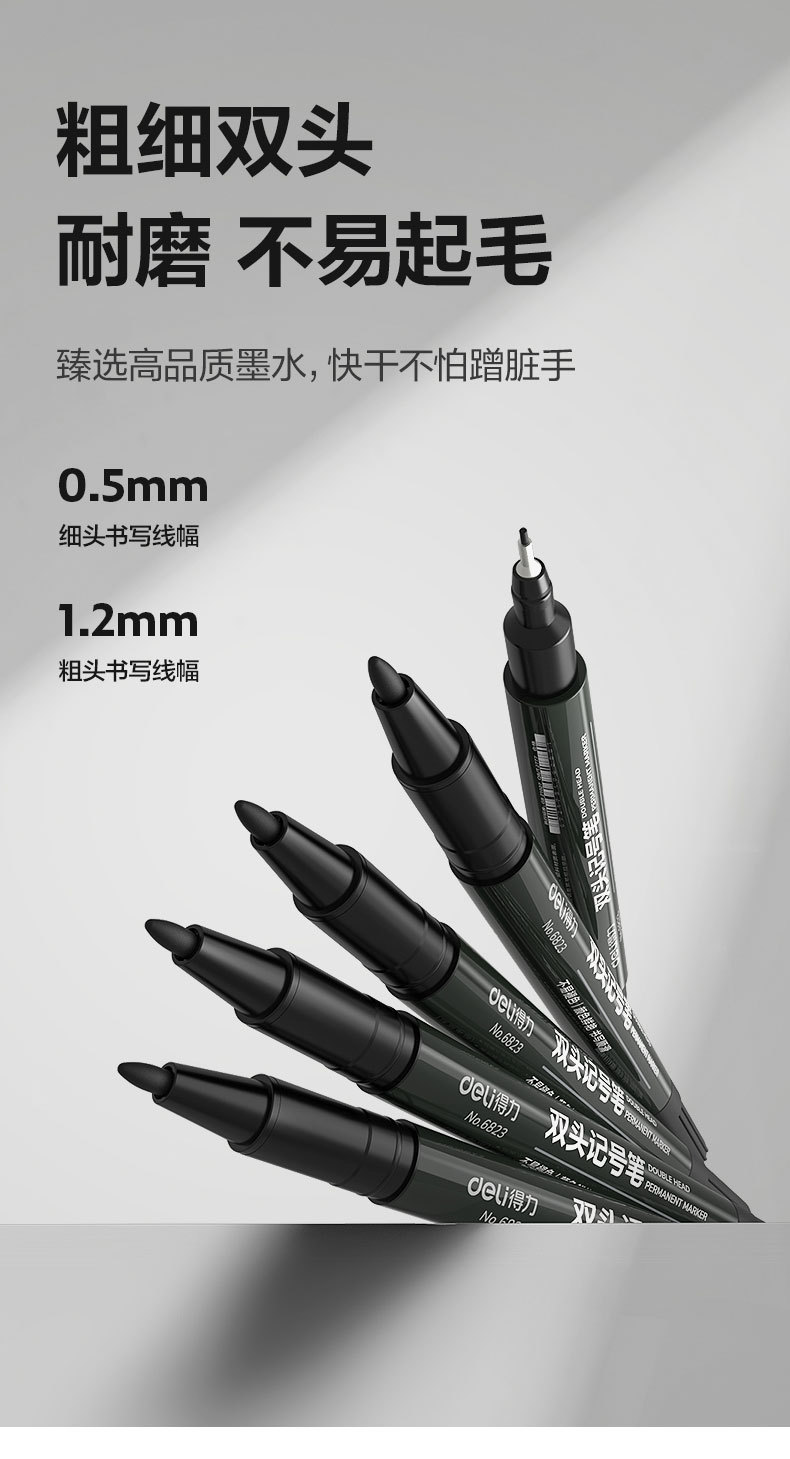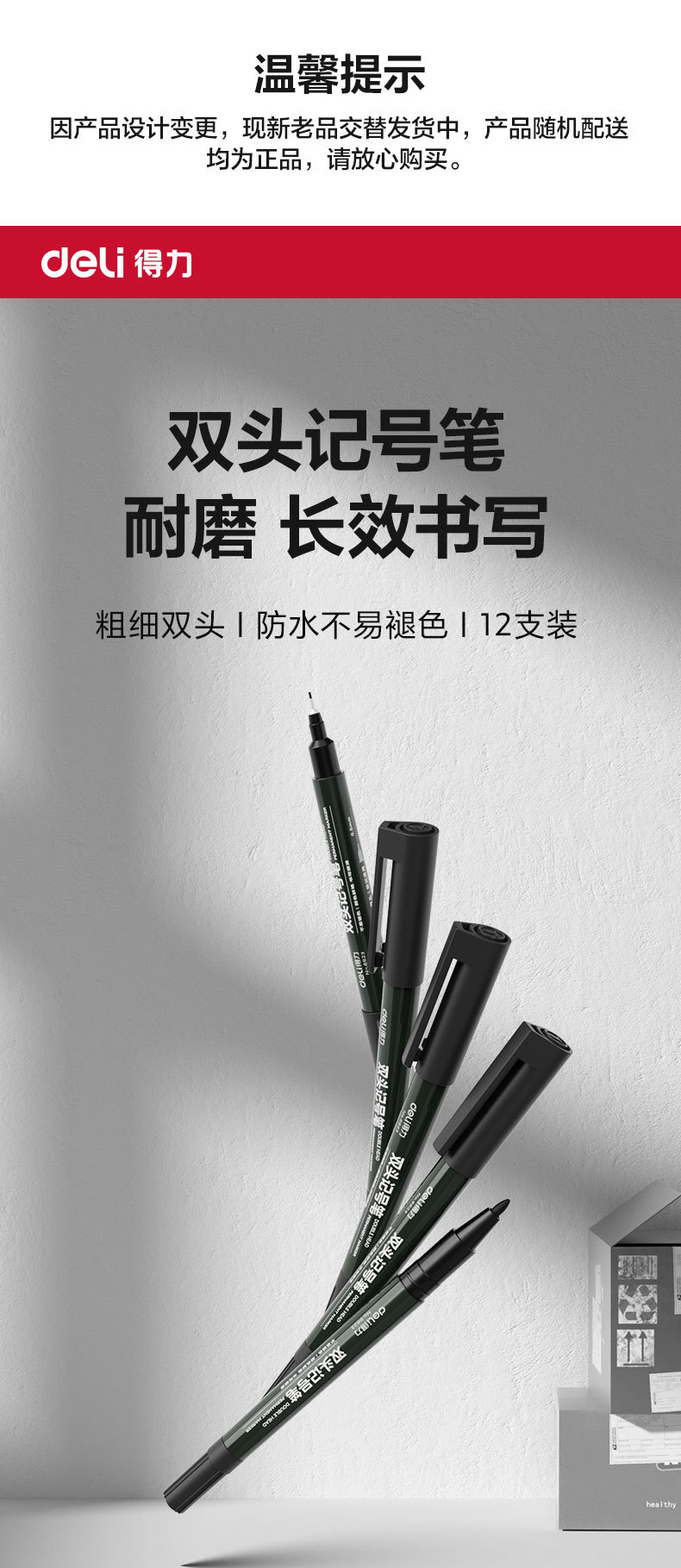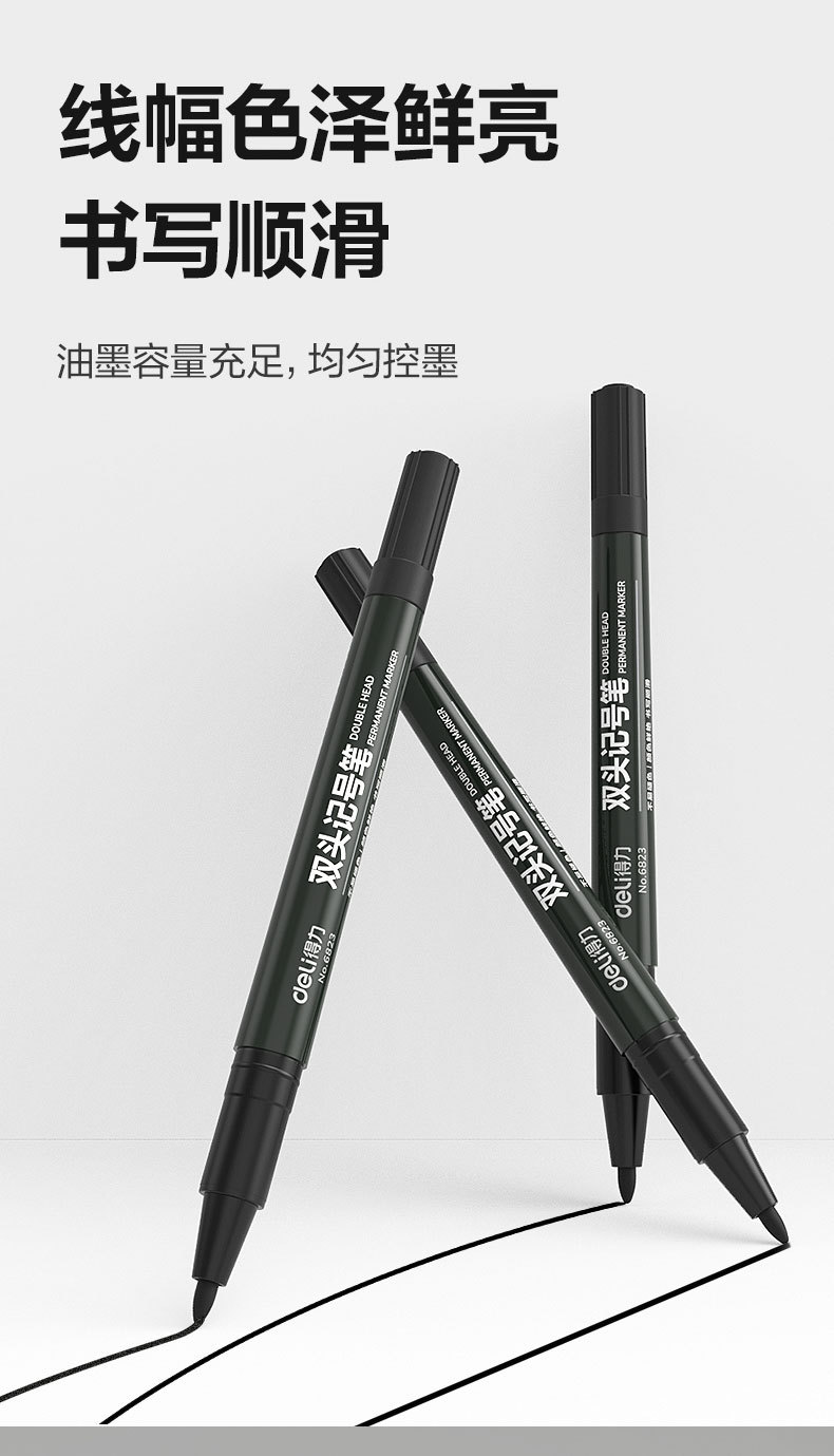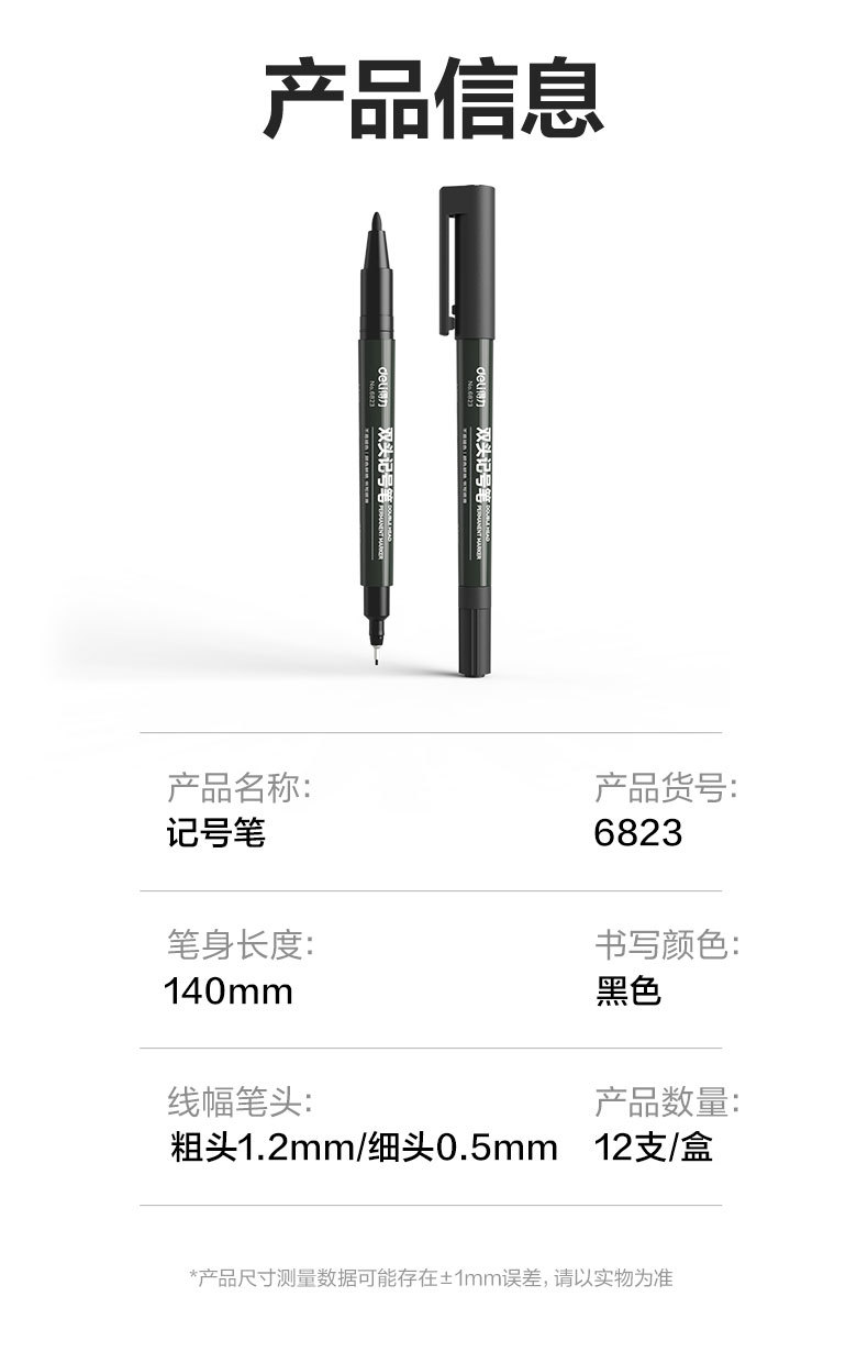 得力6823双头记号笔勾线笔黑色防水防油不掉色学生安全无毒油性笔