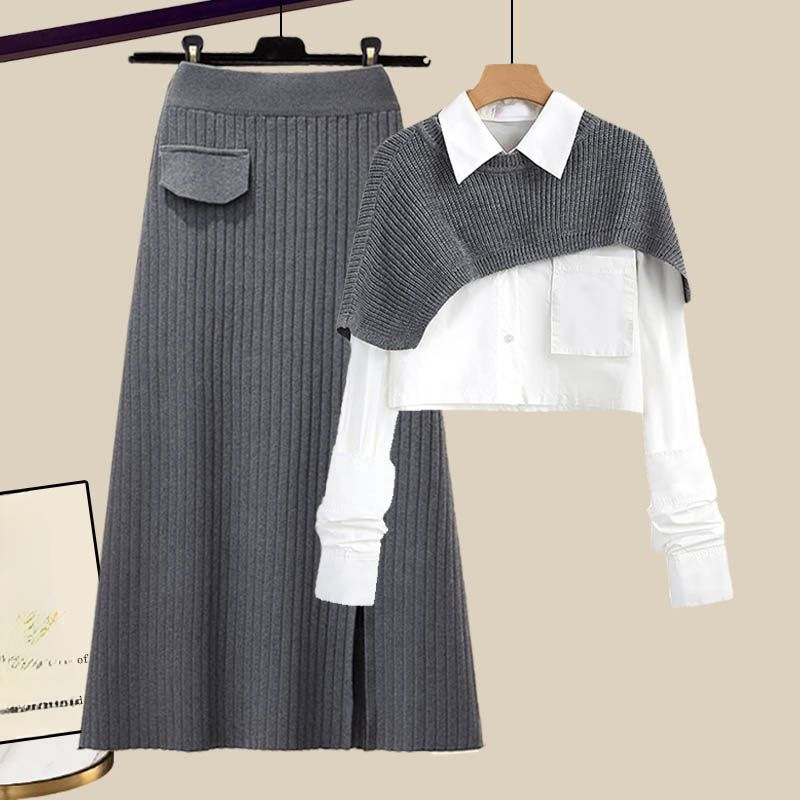 潮秋季套装女三件套2025披肩大码女装新款针织半身裙高腰宽松衬衫