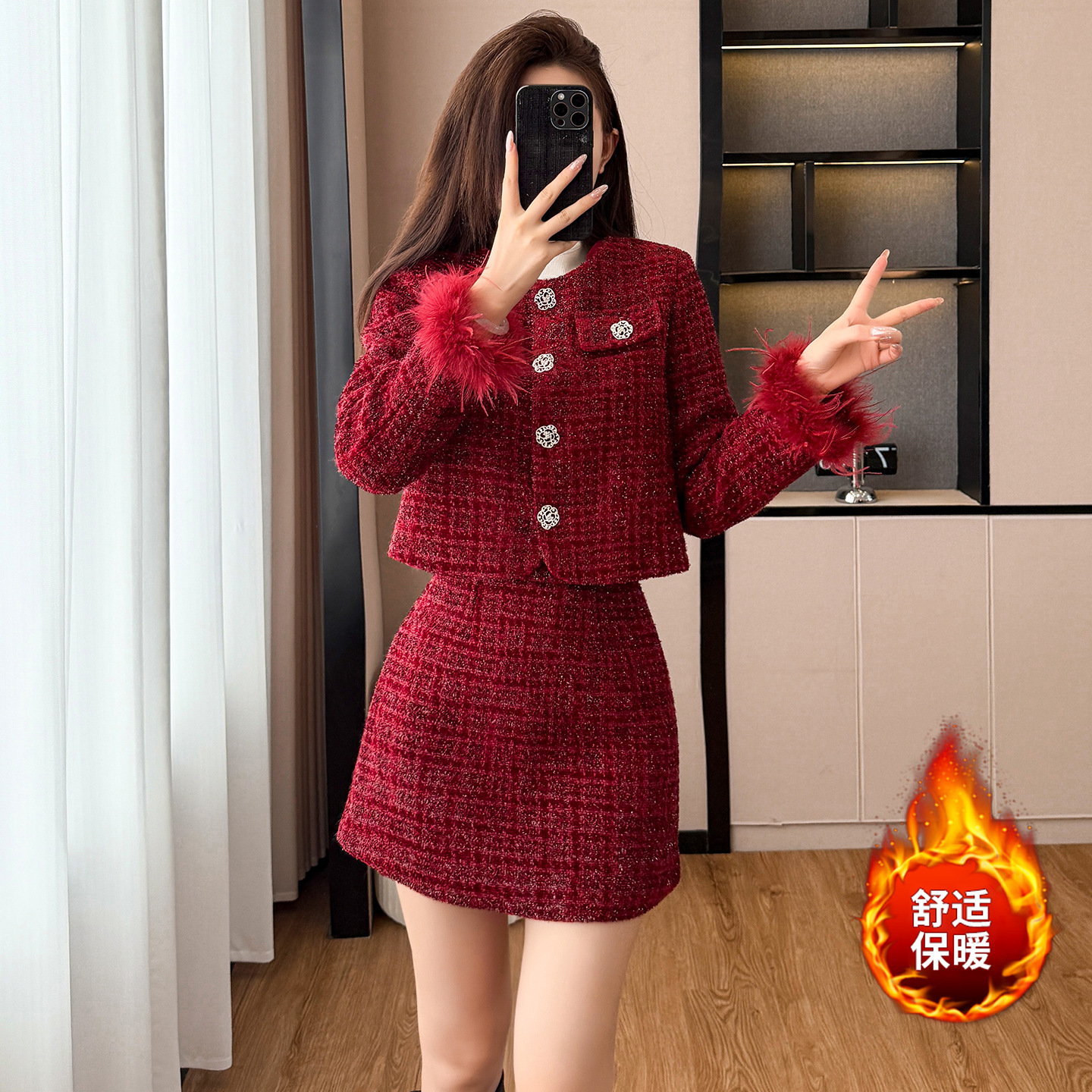 2025富家千金秋冬新款安哥拉红名媛风重工毛毛袖小香风高级感套装