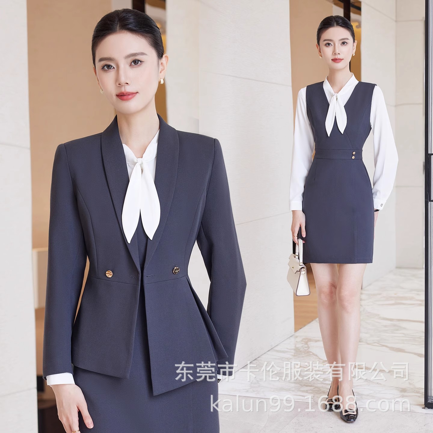 灰色西装套装女秋季新款酒店工作服正装连衣裙两件套职业西服外套