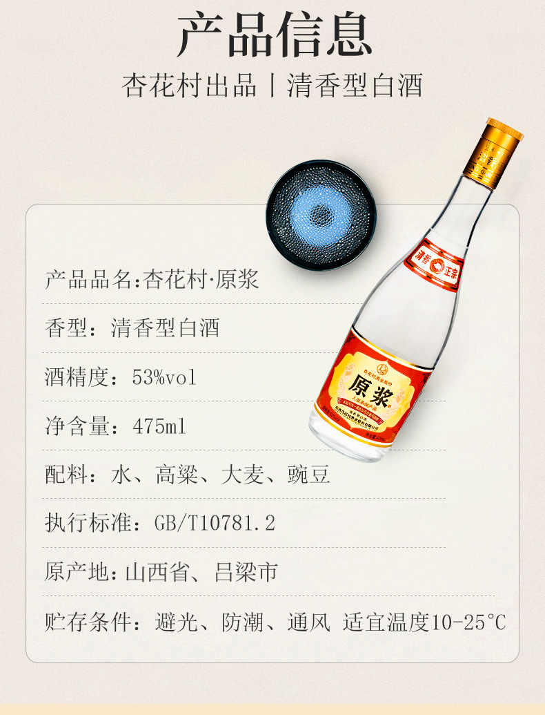 杏花村山西53度黄盖汾475ml清香型玻璃瓶白酒