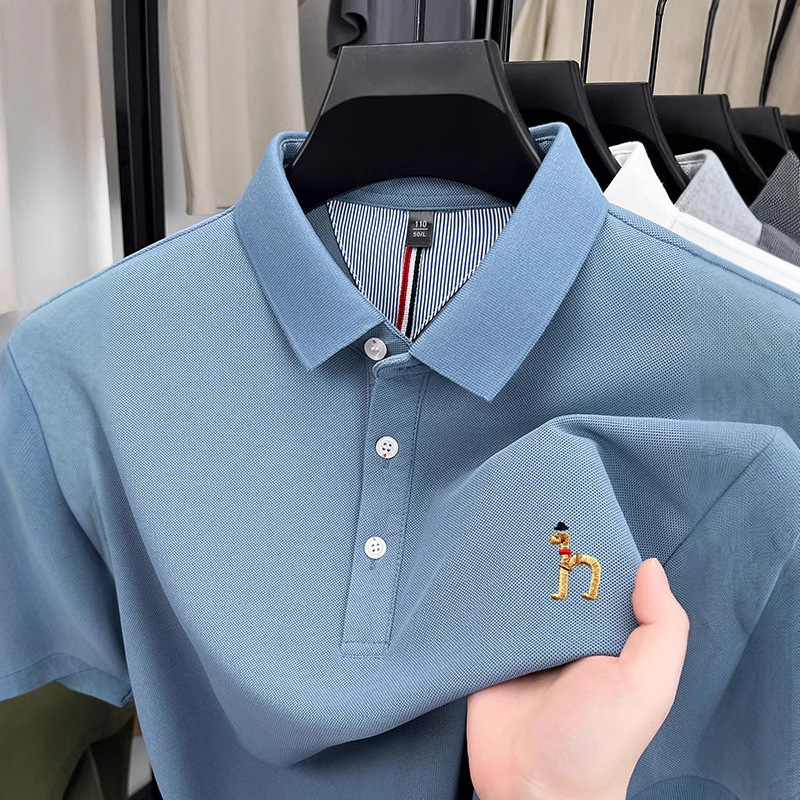 2025 メンズ新刺繍半袖 Tシャツ夏薄いカジュアル多用途無地ラペル通気性ポロシャツ男性用