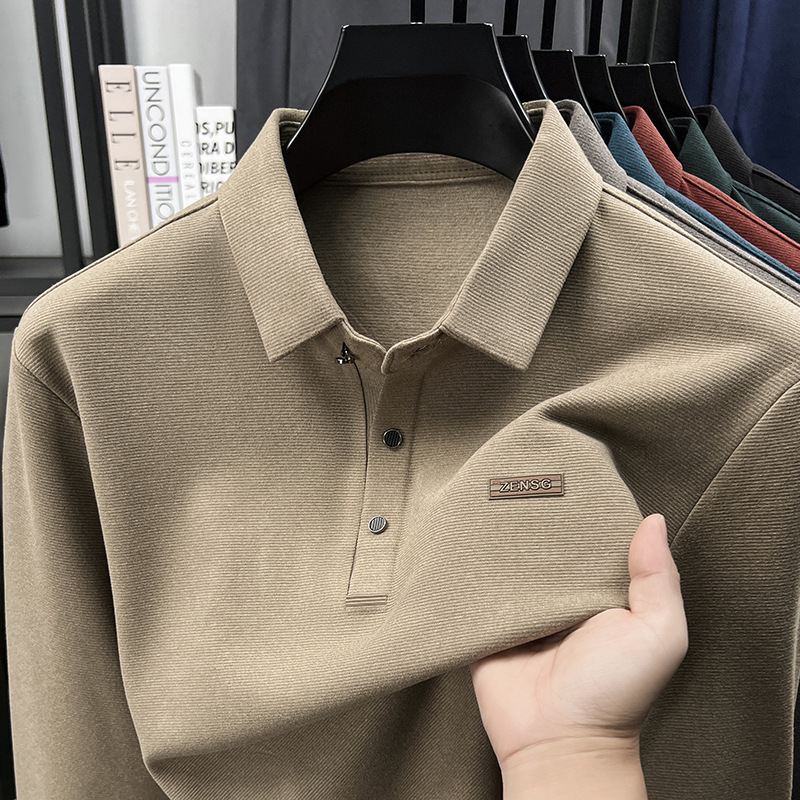 2025秋冬メンズ長袖Tシャツ裏起毛刺繍ポロシャツメンズ折り返し襟ビジネスカジュアル無地Tシャツ卸売