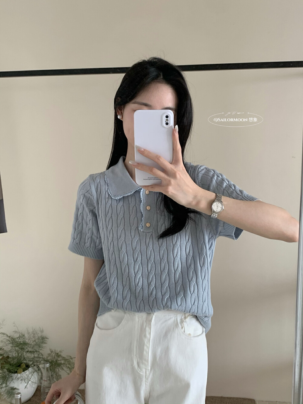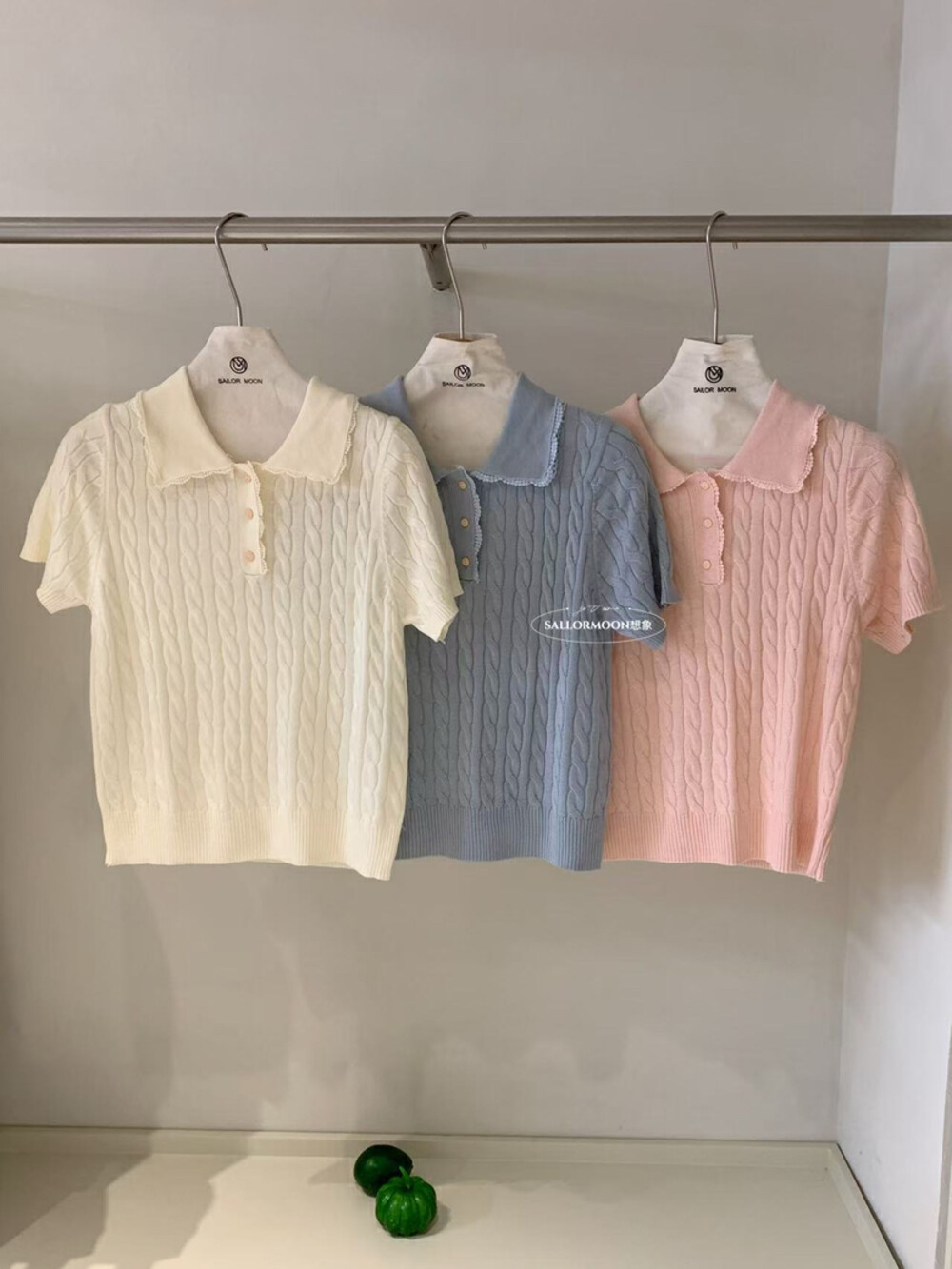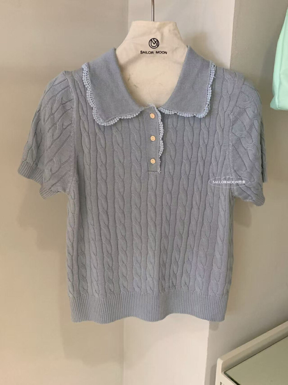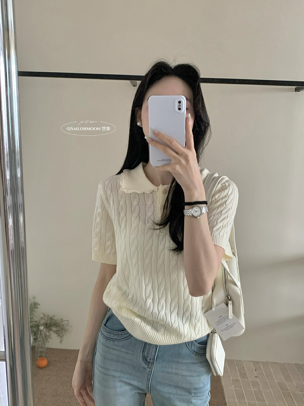 2025年夏季新款韩版设计感翻领蕾丝边拼接麻花针织百搭短袖上衣女