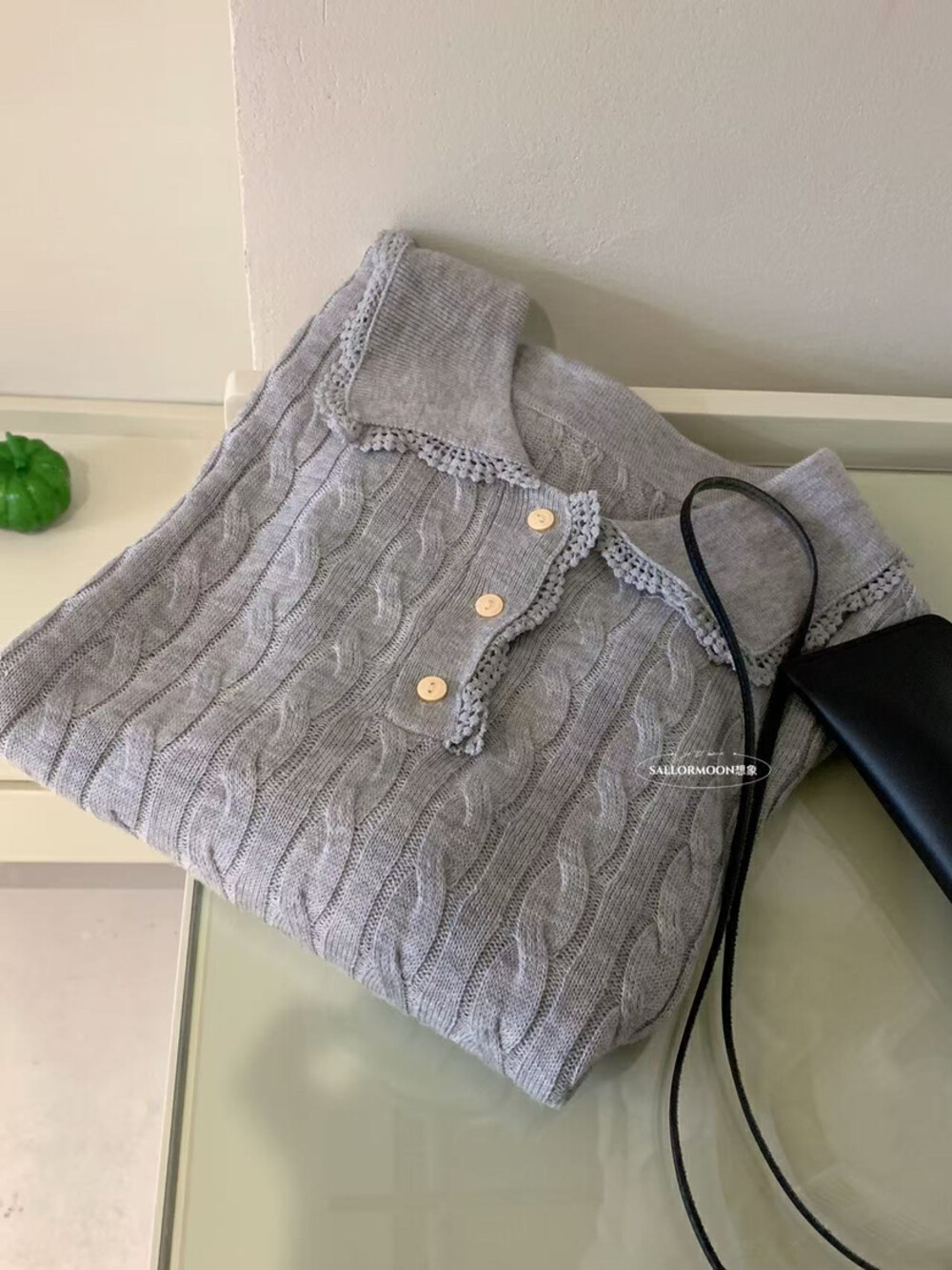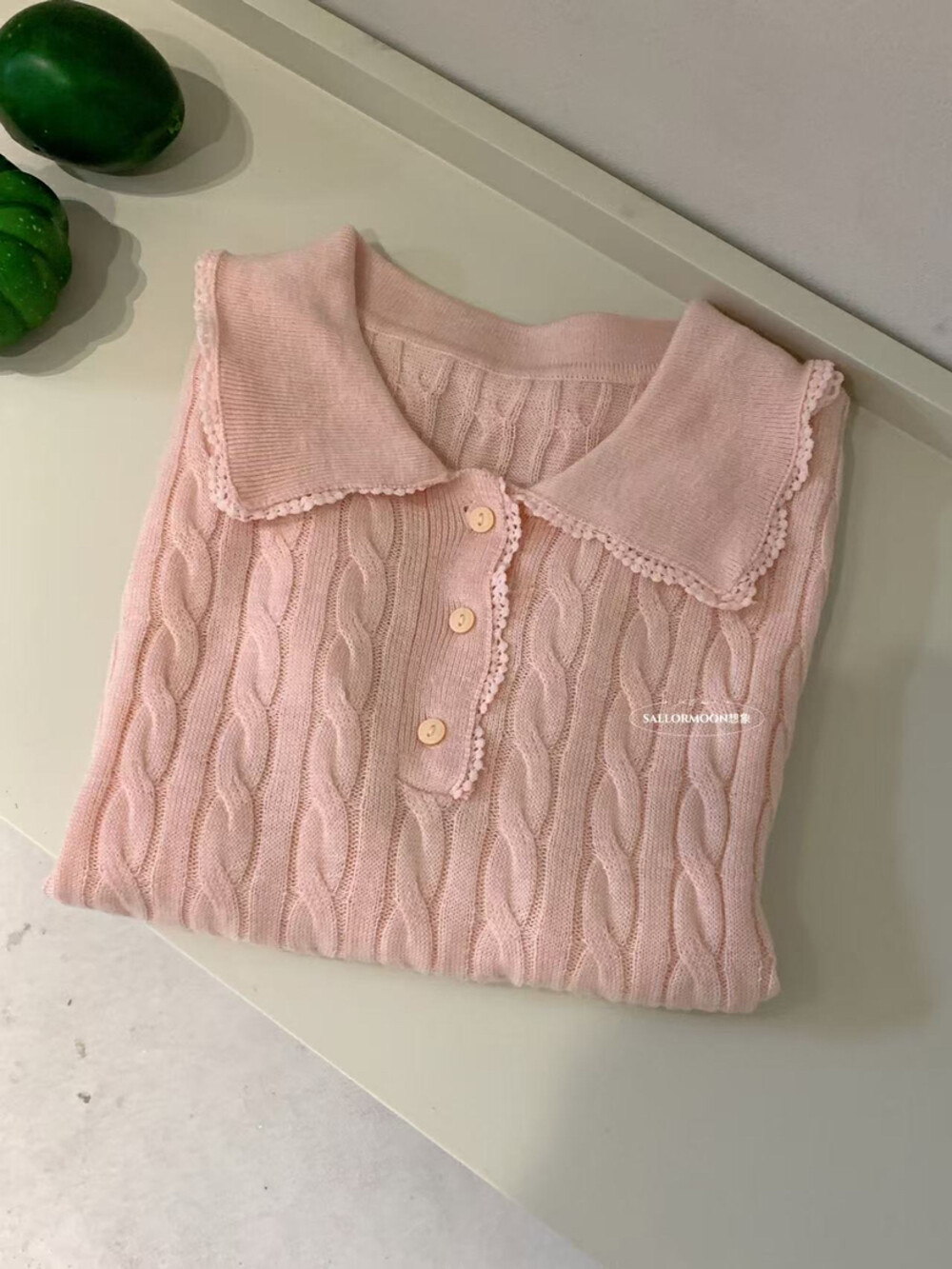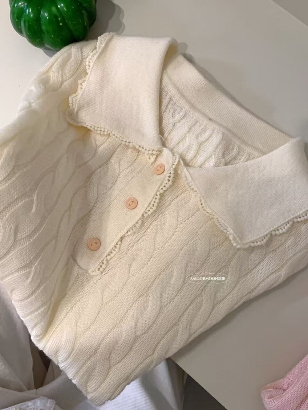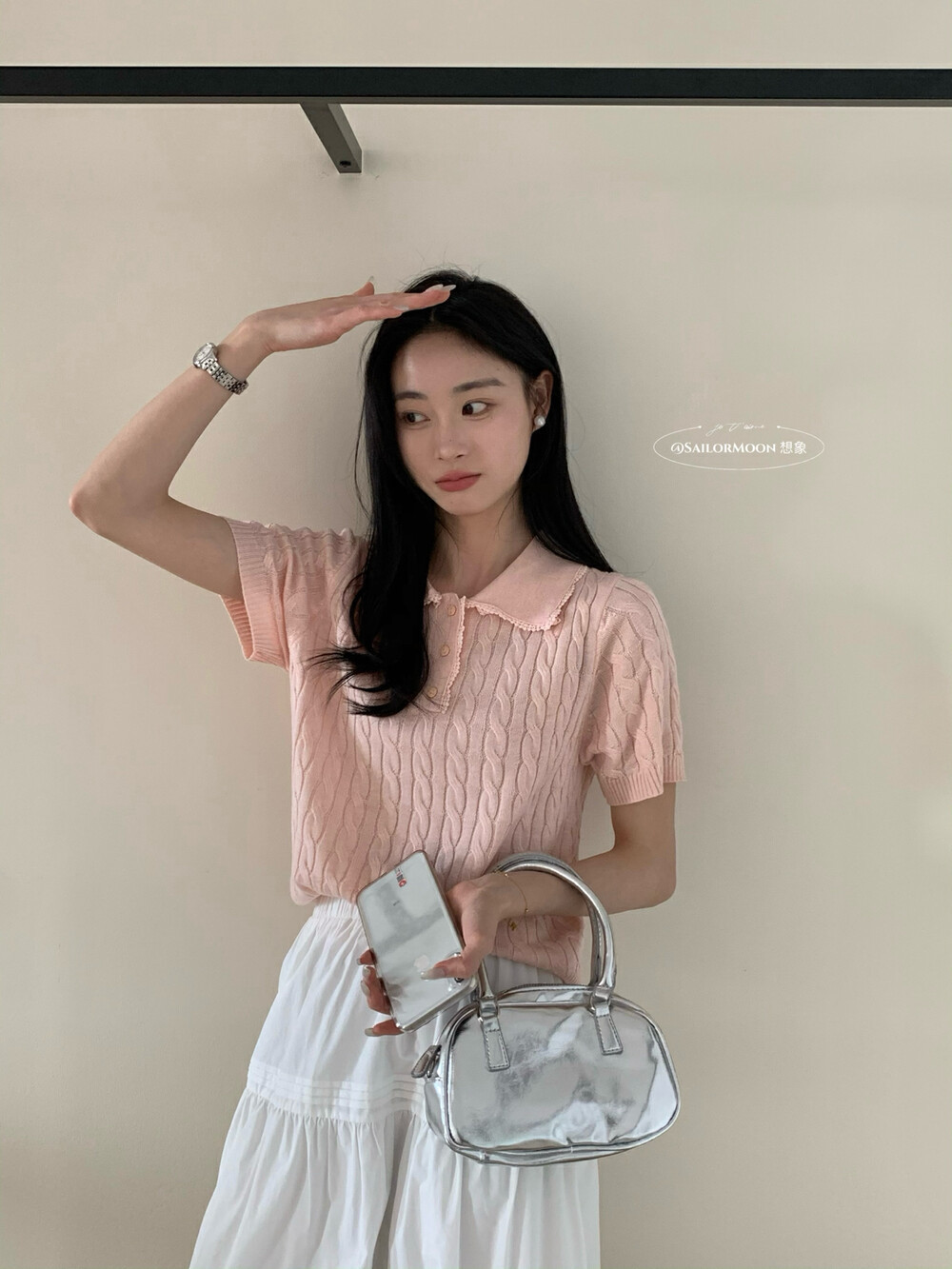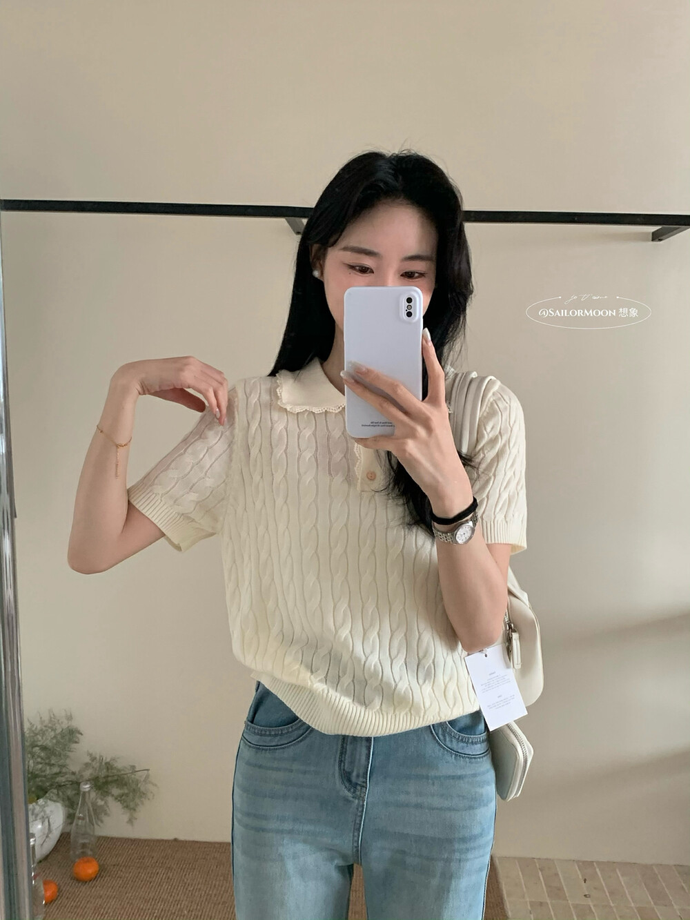 2025年夏季新款韩版设计感翻领蕾丝边拼接麻花针织百搭短袖上衣女