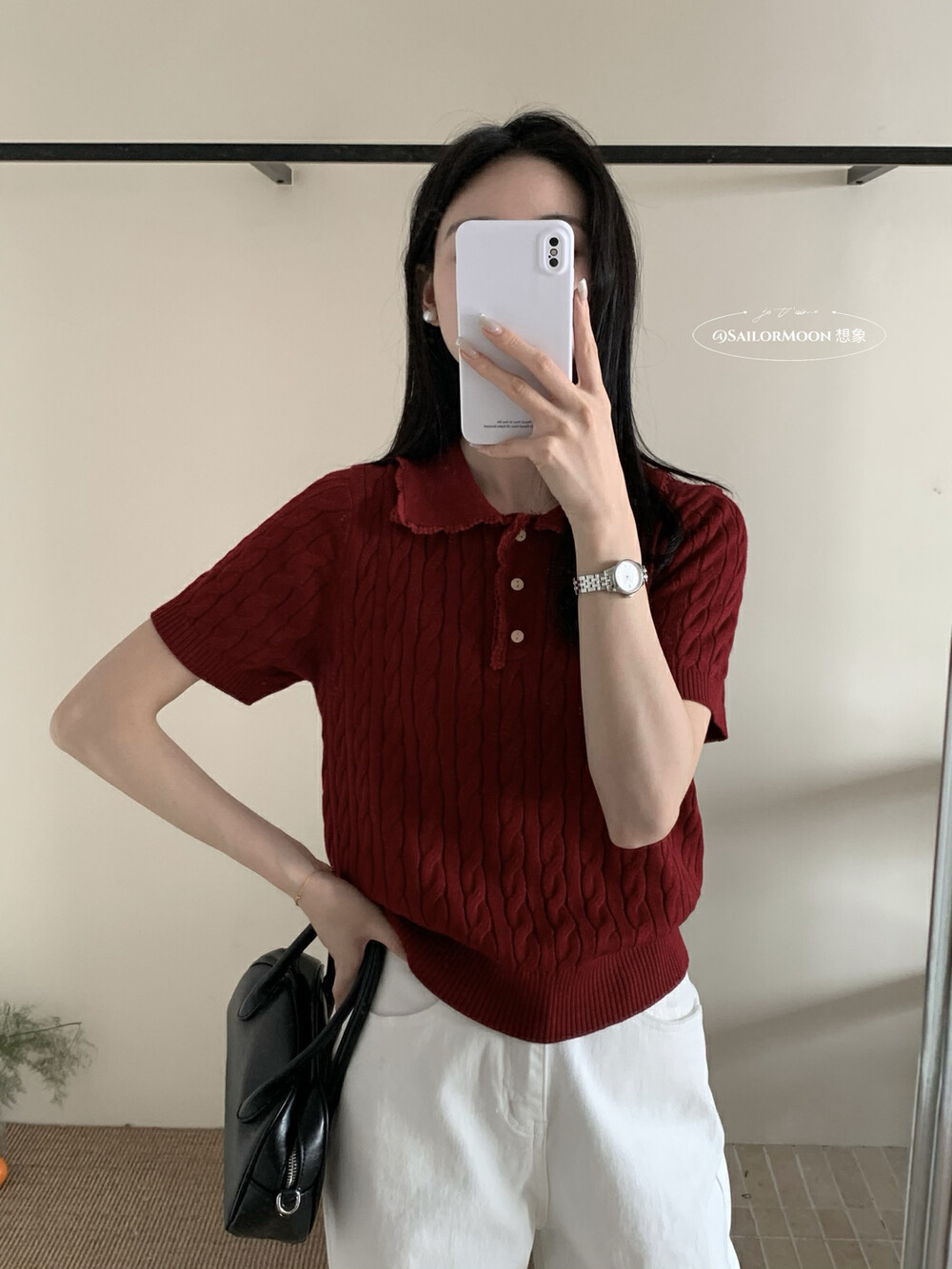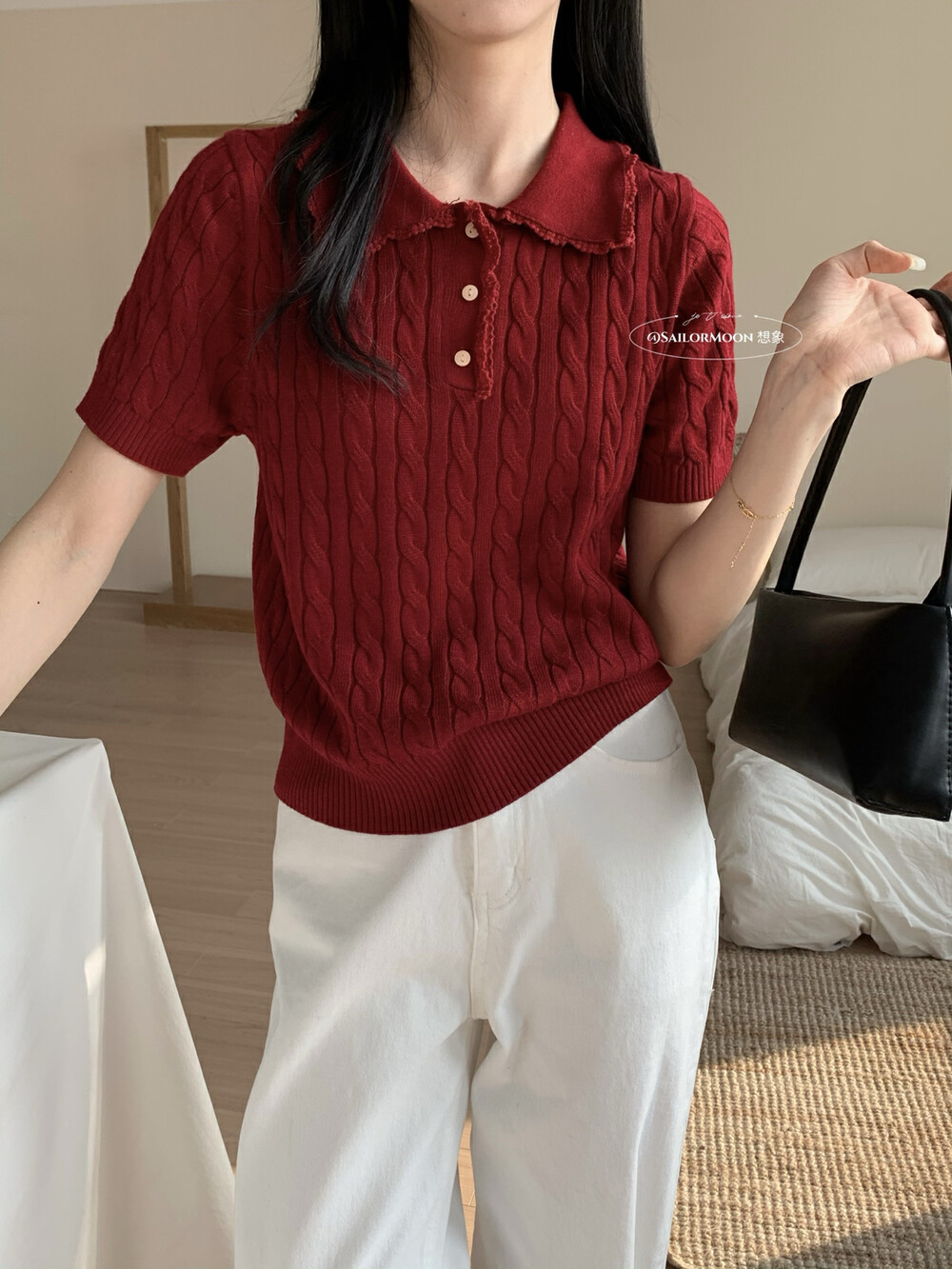红色刺绣麻花针织短袖T恤女夏季设计感排扣半开领正肩打底衫上衣