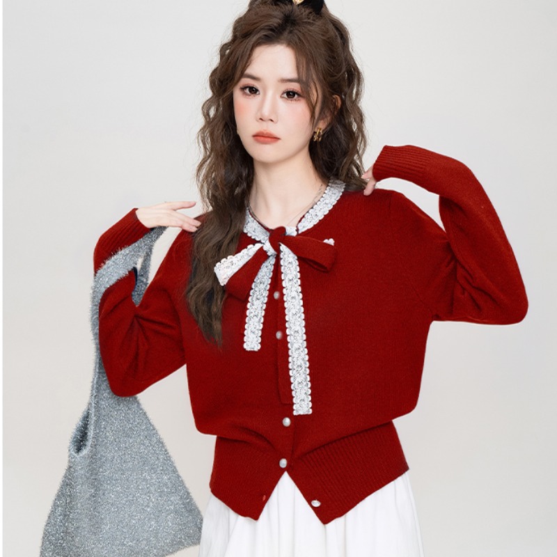 法式蕾丝蝴蝶结宽松长袖毛针织开衫上衣女秋季高级感内搭打底衫