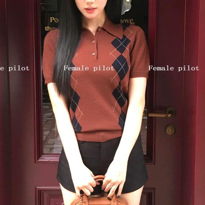 2025新款学院风休闲气质翻领短袖上衣女夏季百搭撞色菱格针织T恤