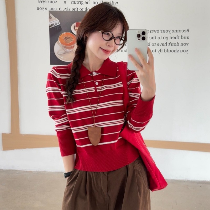 慵懒风红色翻领条纹长袖毛衣女秋季别致减龄显瘦新款上衣