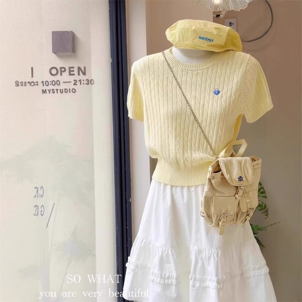 2025氷糸刺繍ツイストニット薄手半袖正肩tシャツ女子夏の小柄な上着