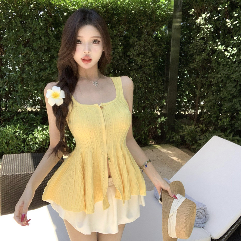気質カジュアルバレエスタイルビッグUネックプリーツスカートダブルジッパーデザインニットサスペンダートップ女性用