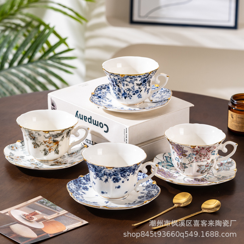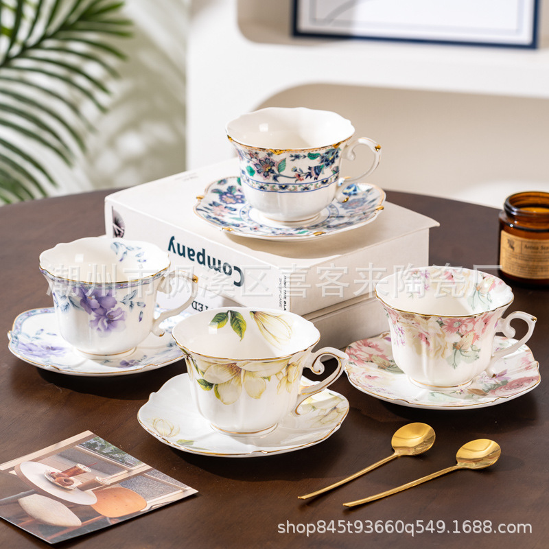 クロスボーダーライト高級セラミックコーヒーカップとソーサー小花柄牧歌的なスタイルのアフタヌーンティー高価値ゴールド塗装ヨーロッパスタイルの絶妙なレトロ