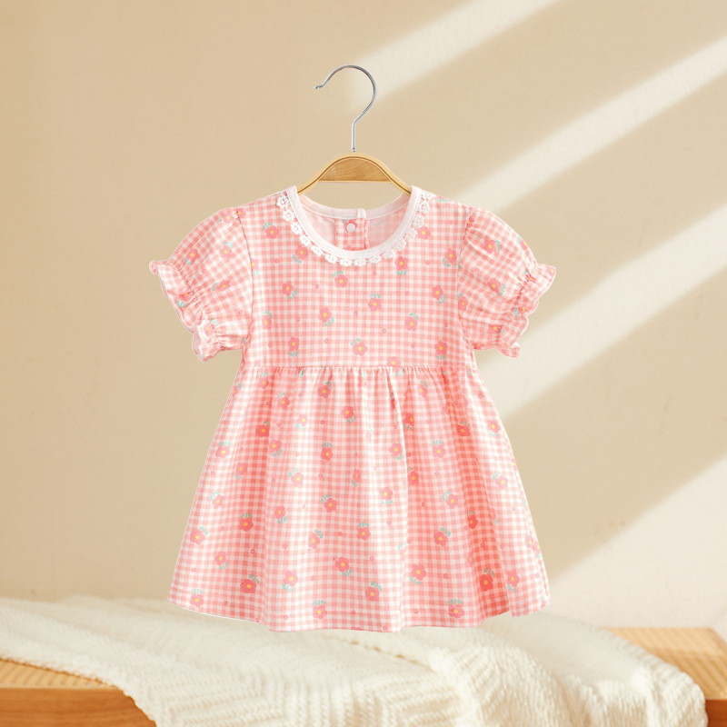 女の子スカート夏の新しい子供の綿半袖花柄ドレス女の赤ちゃんかわいいチェック柄プリントスカート