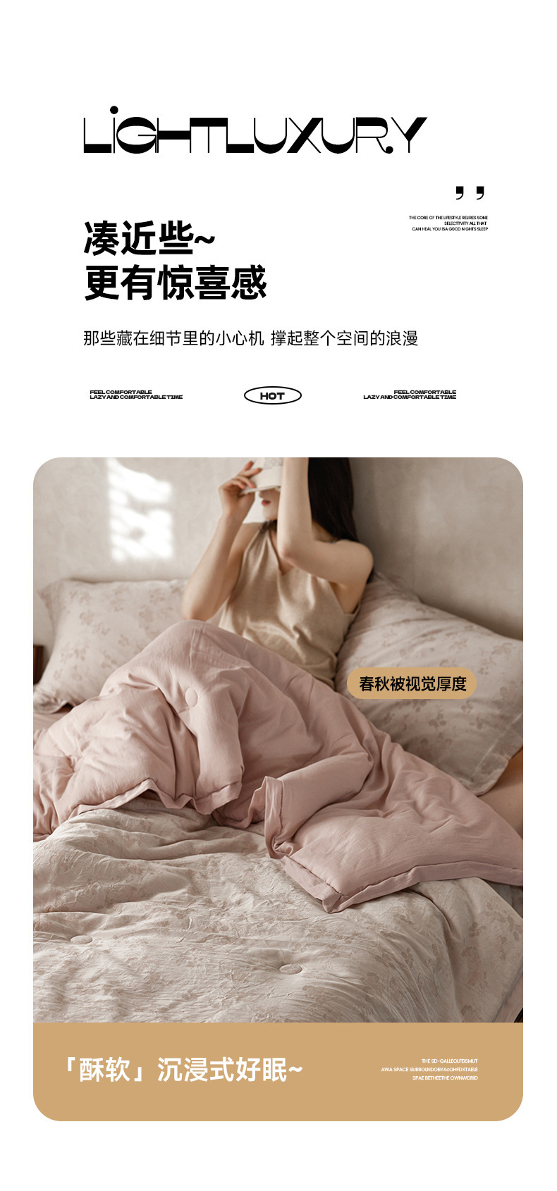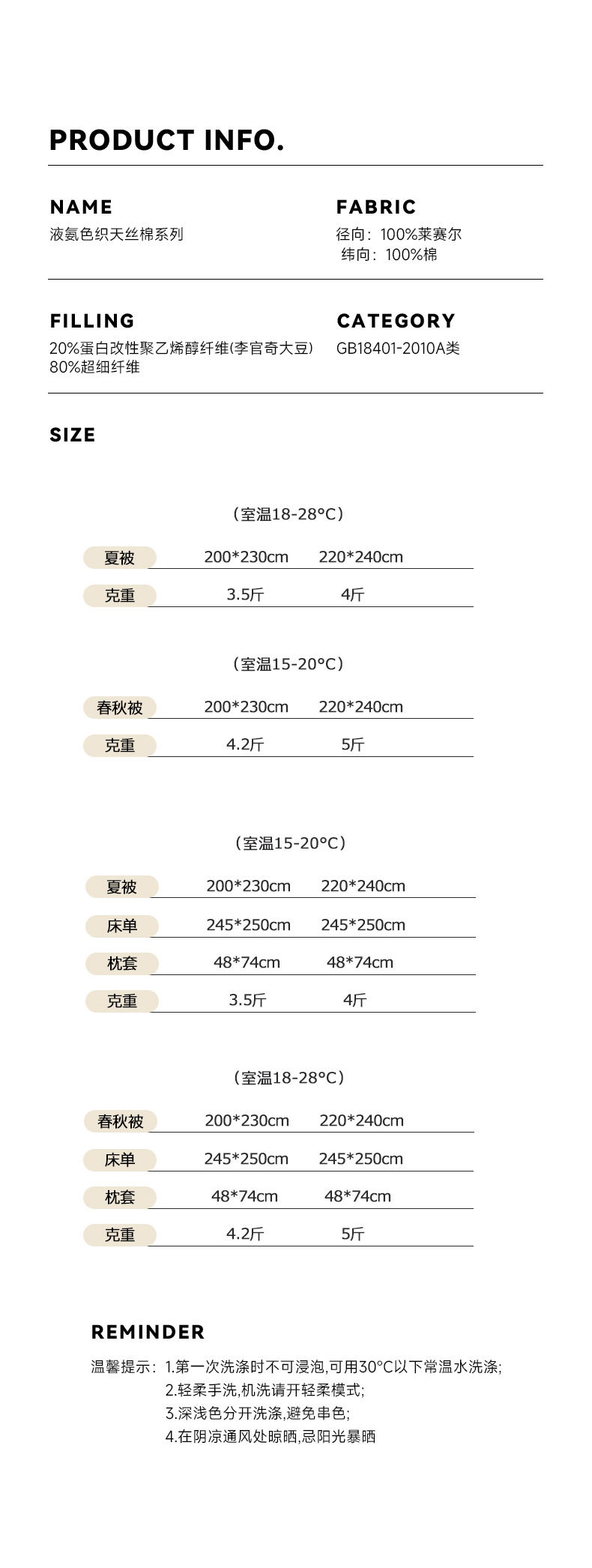 尺寸规格 单夏被200*230cm(约3.5斤),单夏被220*240cm(约4斤),春秋被200*230cm(约4.2斤),春秋被220*240cm(约5斤),标准夏被床单款四件套:夏被200*230cm床单245*250cm枕套48*74cm一对,加大夏被床单款四件套:夏被220*240cm床单245*250cm枕套48*74cm一对,标准春秋被床单款四件套:春秋被200*230cm床单245*250cm枕套48*74cm一对,加大春秋被床单款四件套:春秋被220*240cm床单245*250cm枕套48*74cm一对
