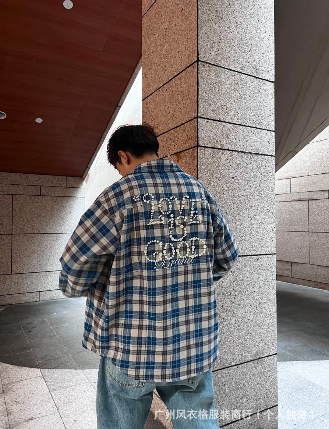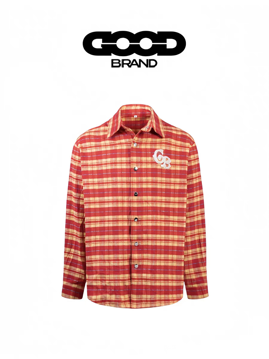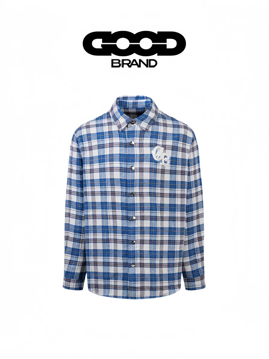 GOODBRANDアメリカのレトロな格子シャツ男女の青い格子の上着の春の夏のストライプの真珠の格子のシャツ