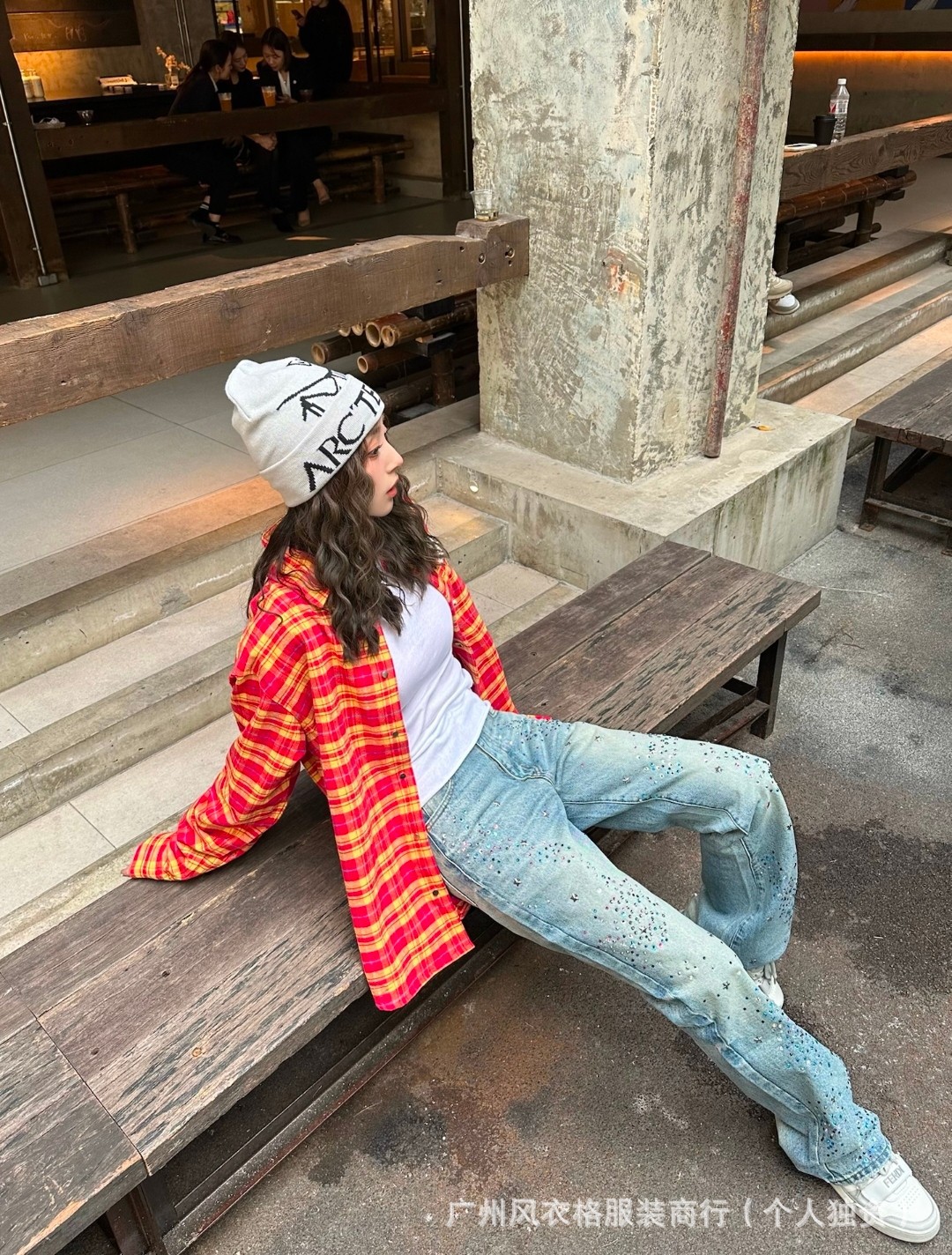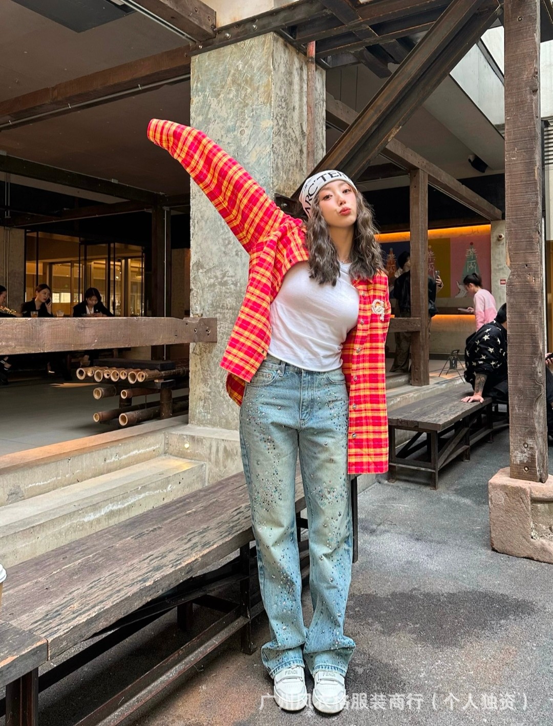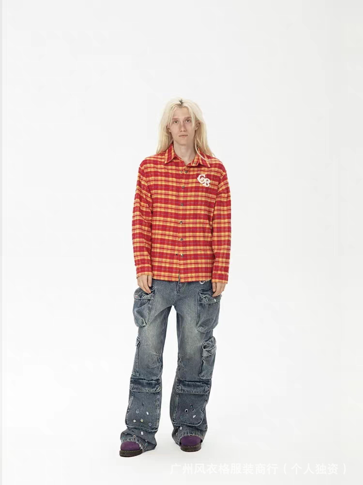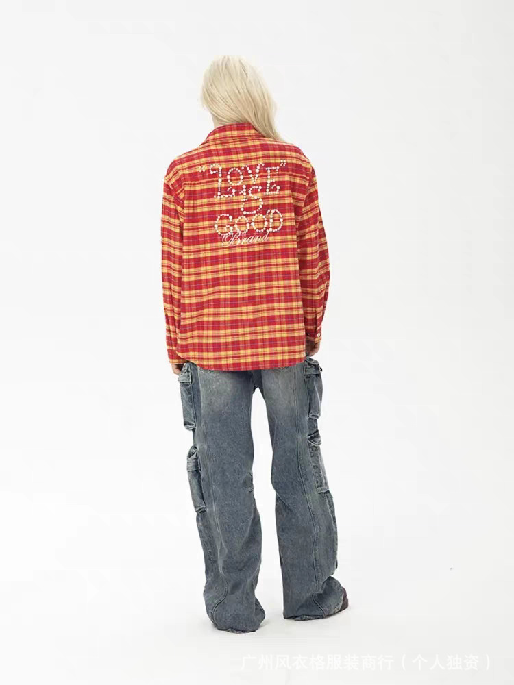 GOODBRANDアメリカのレトロな格子シャツ男女の青い格子の上着の春の夏のストライプの真珠の格子のシャツ