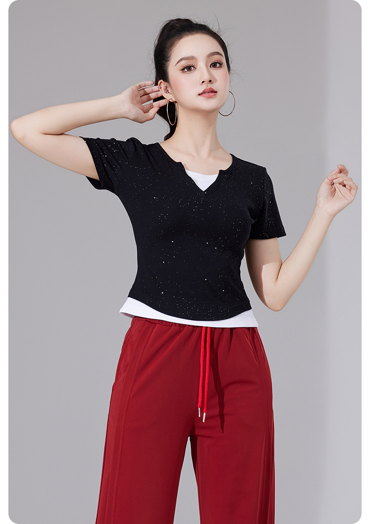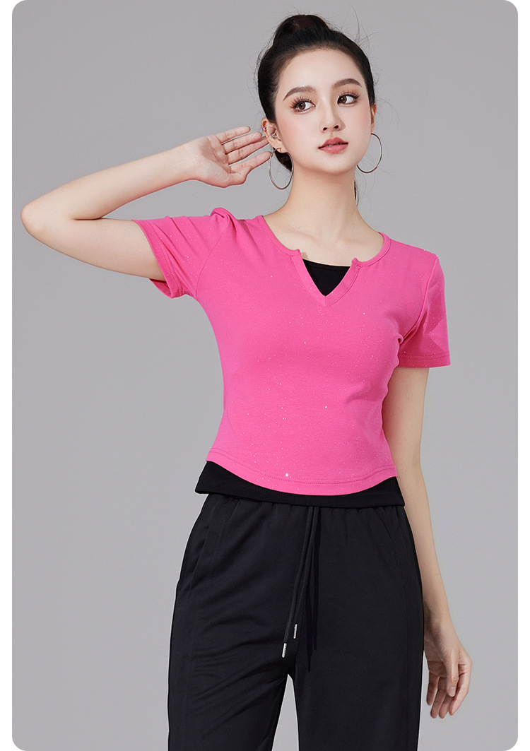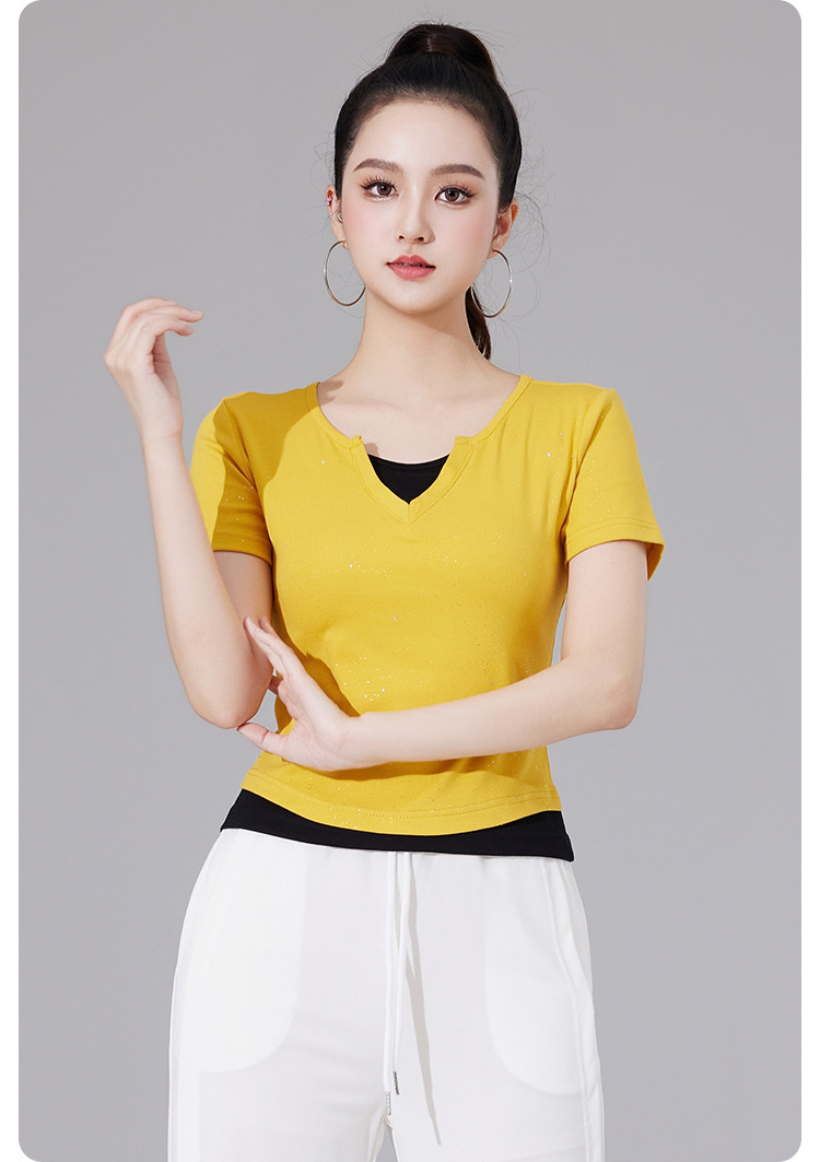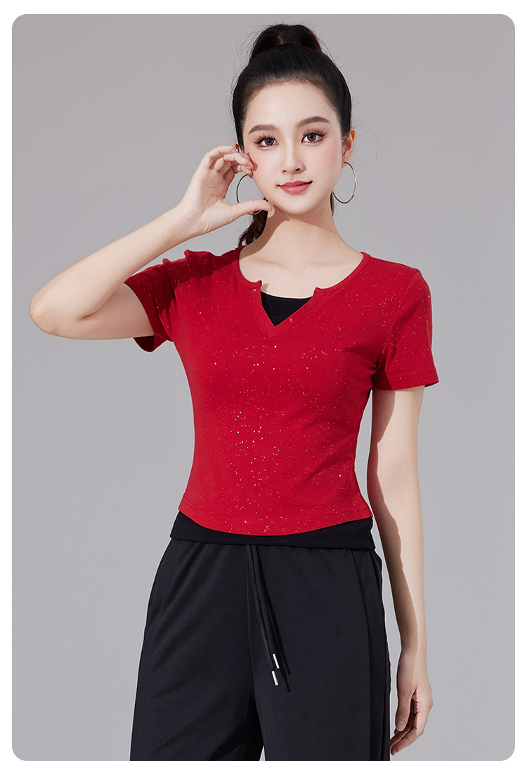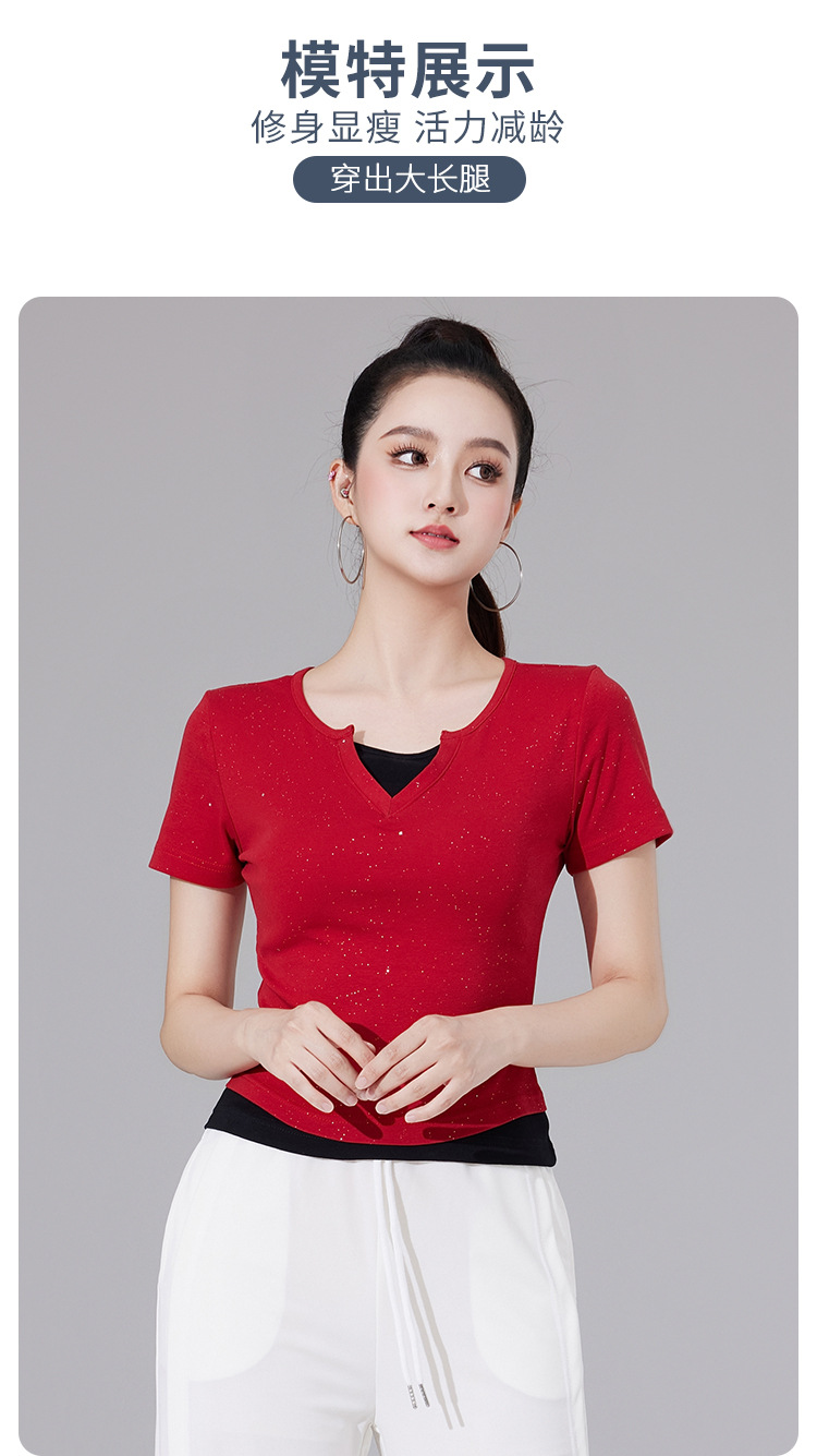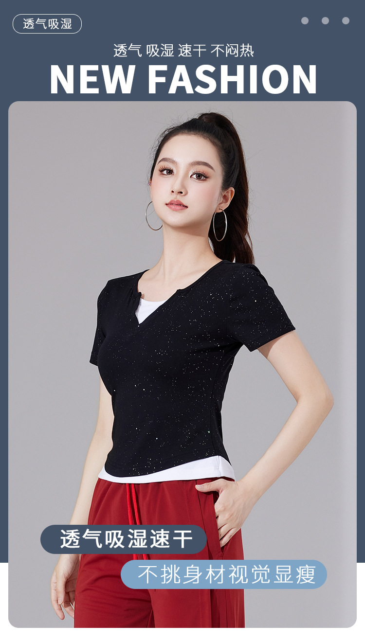 モムダ春夏広場舞小vネック上着女性運動健康体操ダンス半袖tシャツファッションダンス服