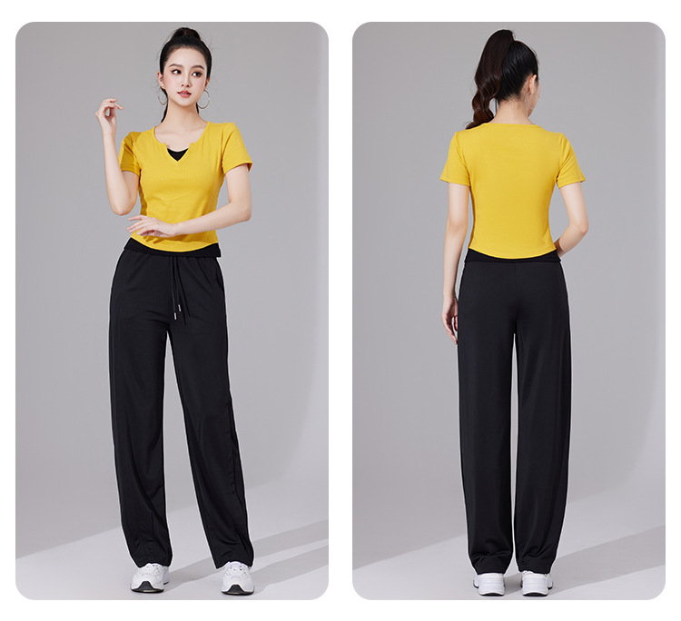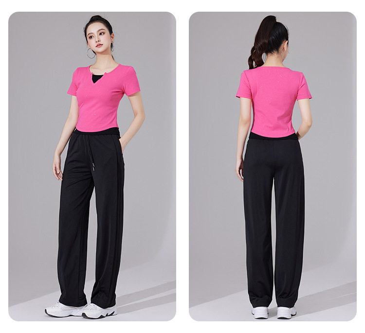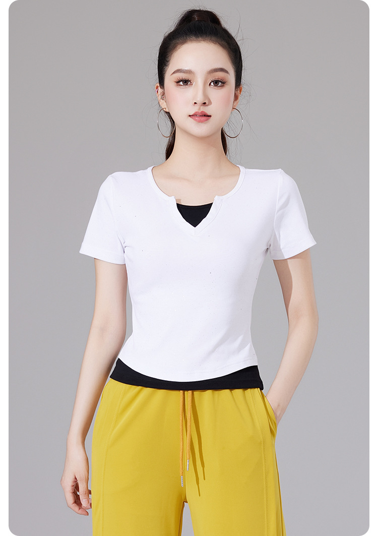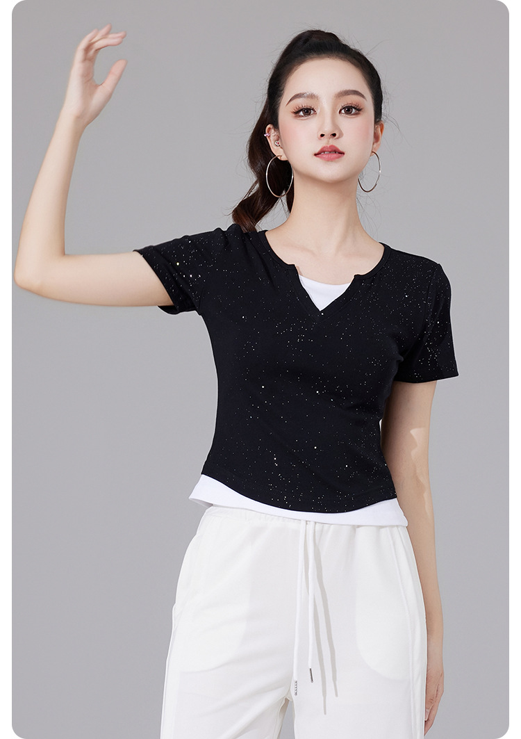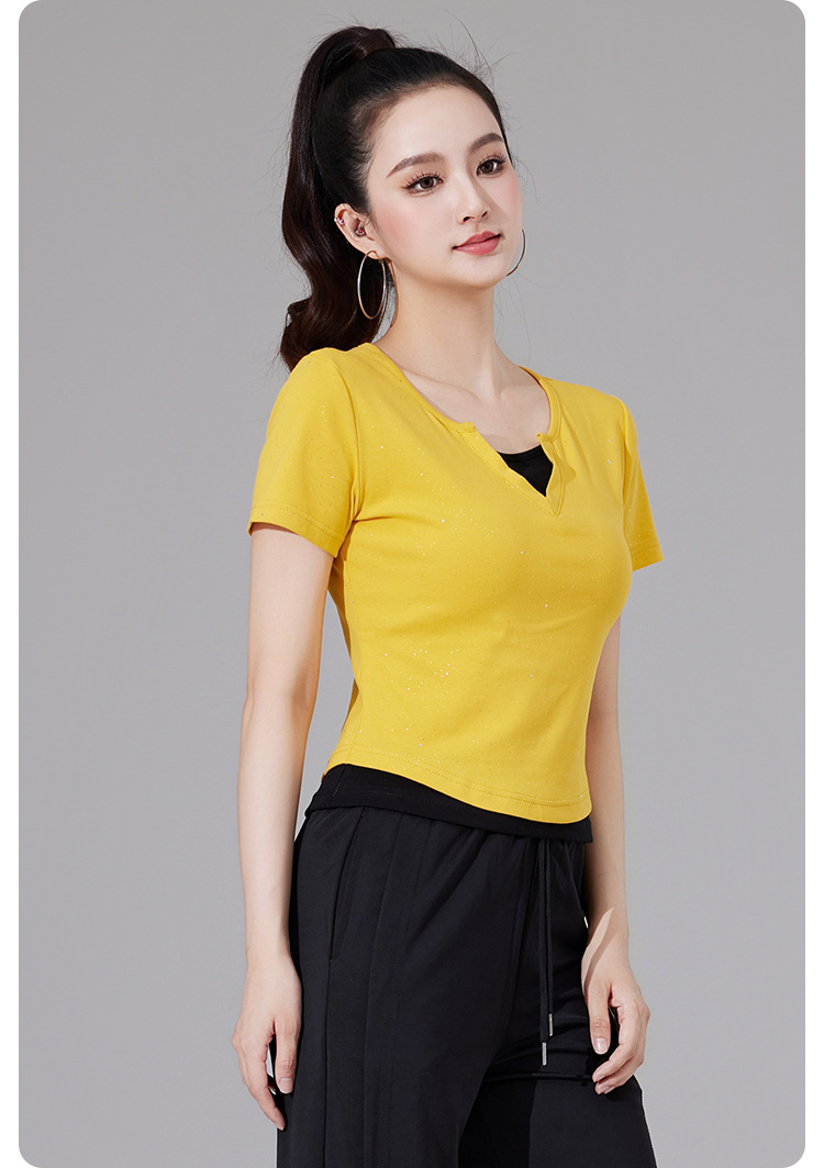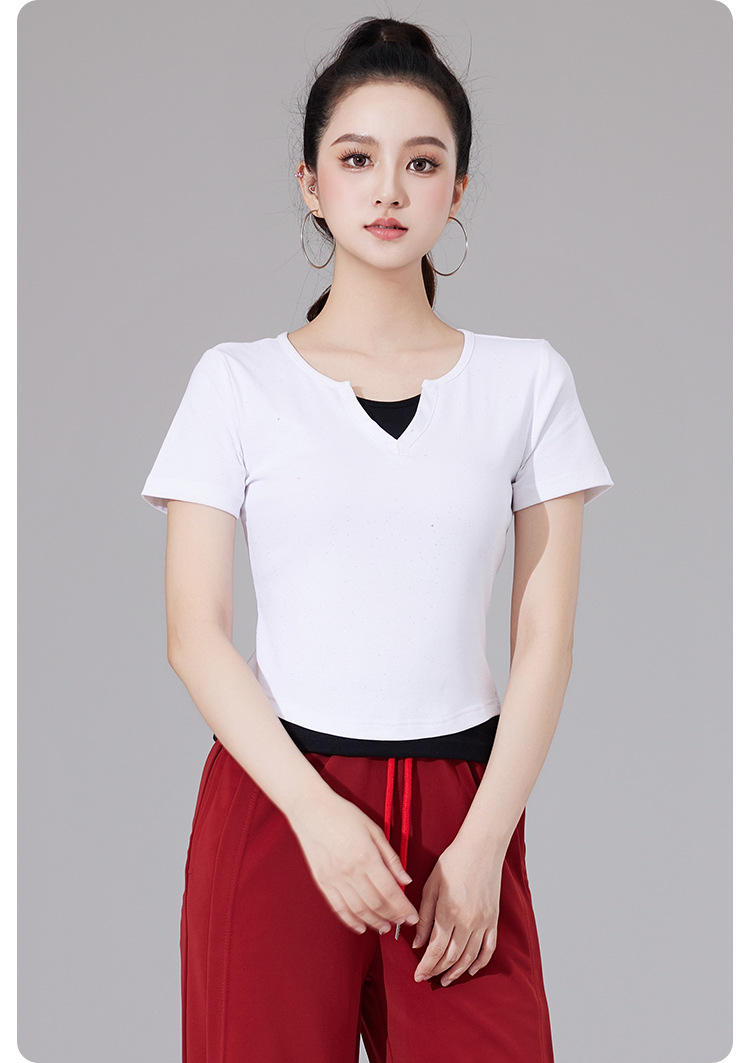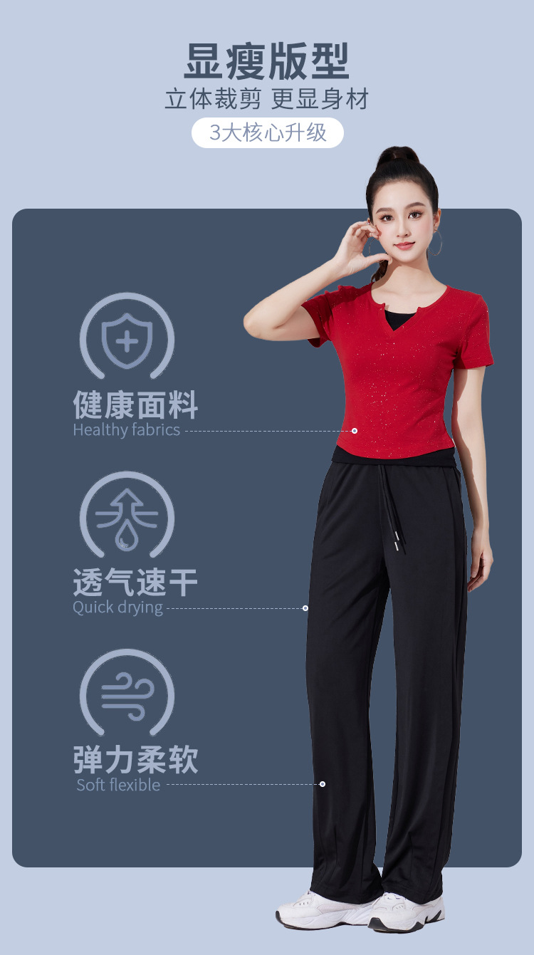 モムダ春夏広場舞小vネック上着女性運動健康体操ダンス半袖tシャツファッションダンス服