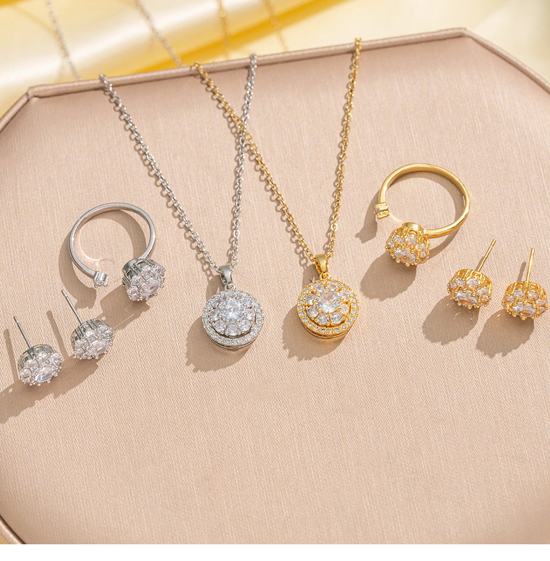韩版轻奢高品质四叶花套装项链耳钉女镶嵌锆石满钻流行百搭锁骨链
