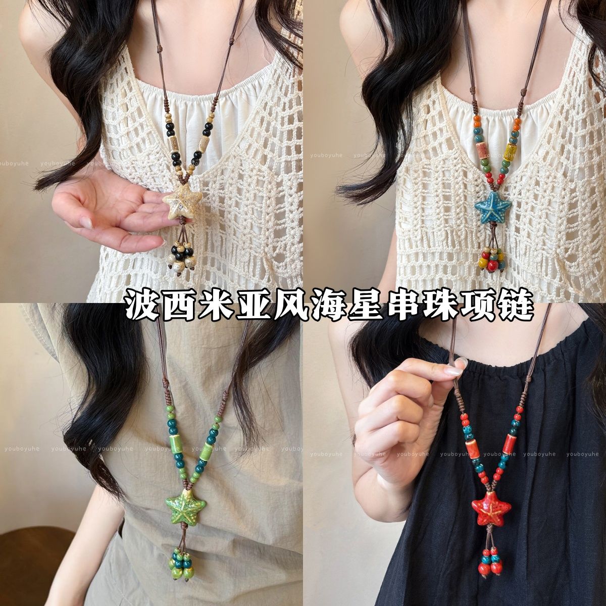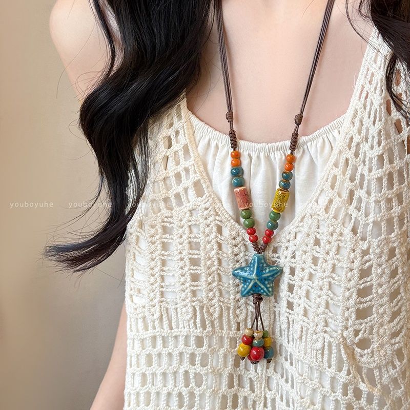 ボヘミアン陶磁器カラービーズ海星ネックレス女性レトロ民族風編み紐ロングスウェットチェーンアクセサリー