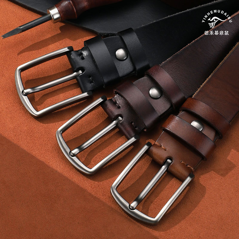 【偽一損十】純銅ベルト男真皮針ボタン青年中年ズボン帯頭層純牛革ベルト男