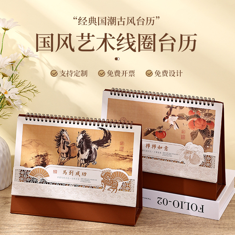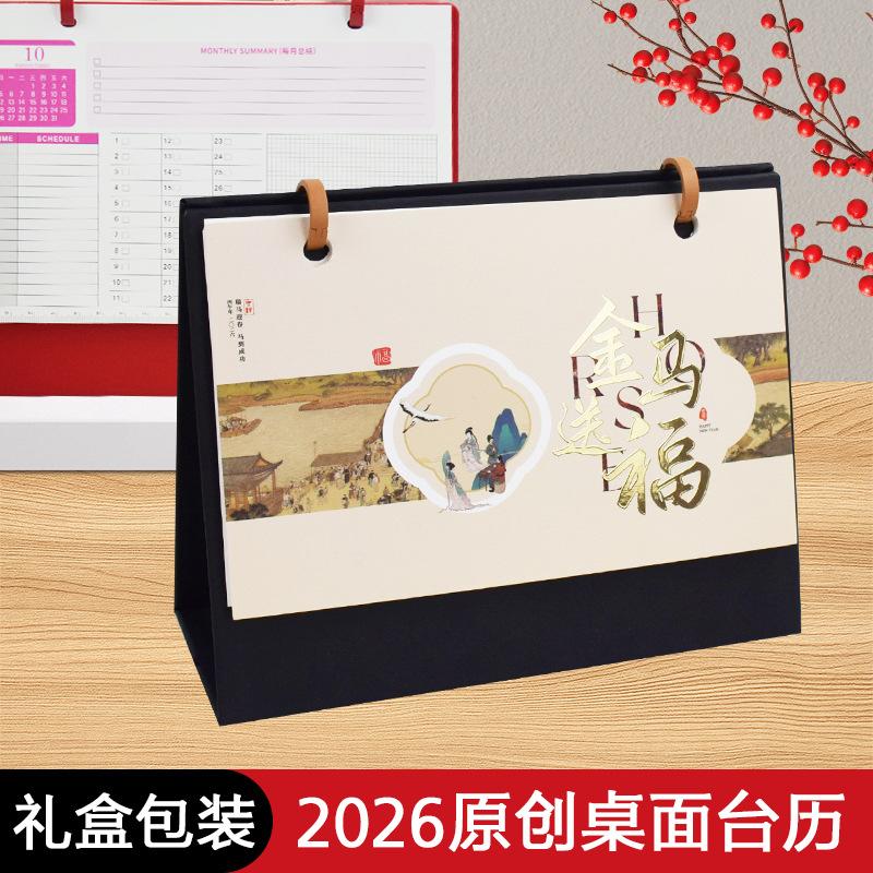 2026年 国風千里江山 デスクトップクリエイティブ装飾カレンダー メモ帳 ロゴ印刷 金箔加工 バインダー式卓上カレンダー