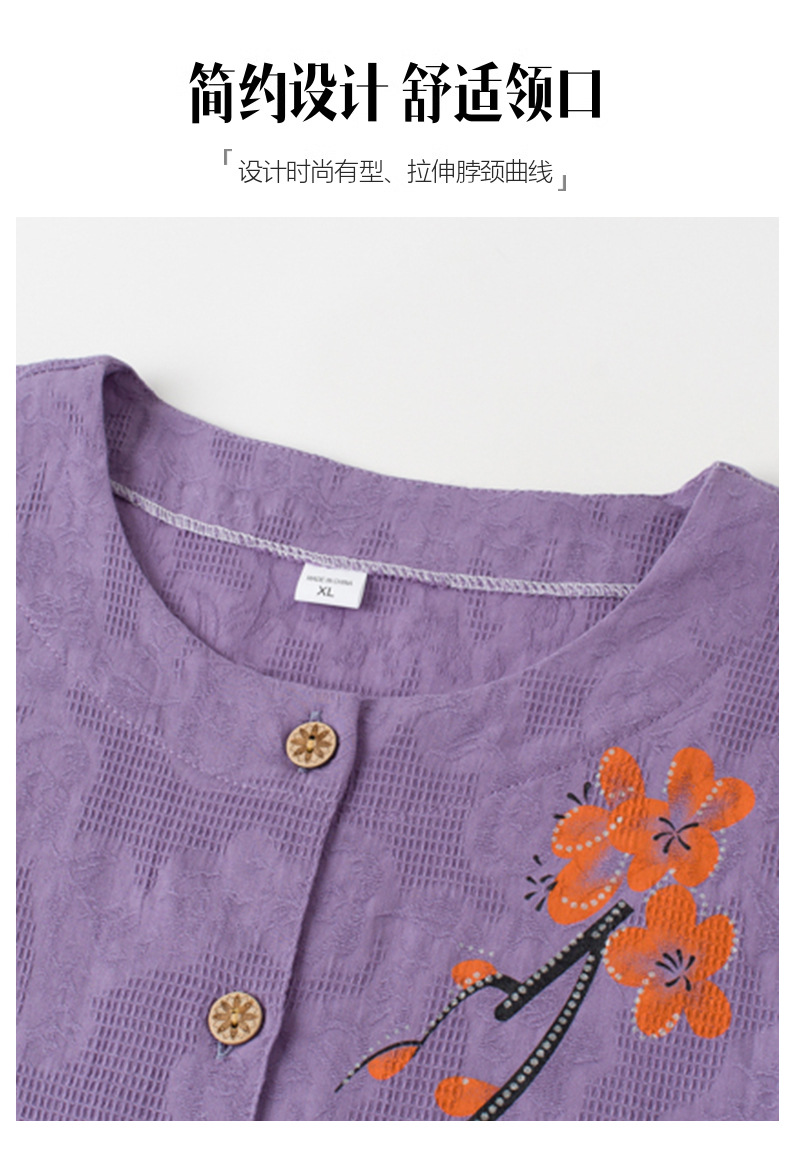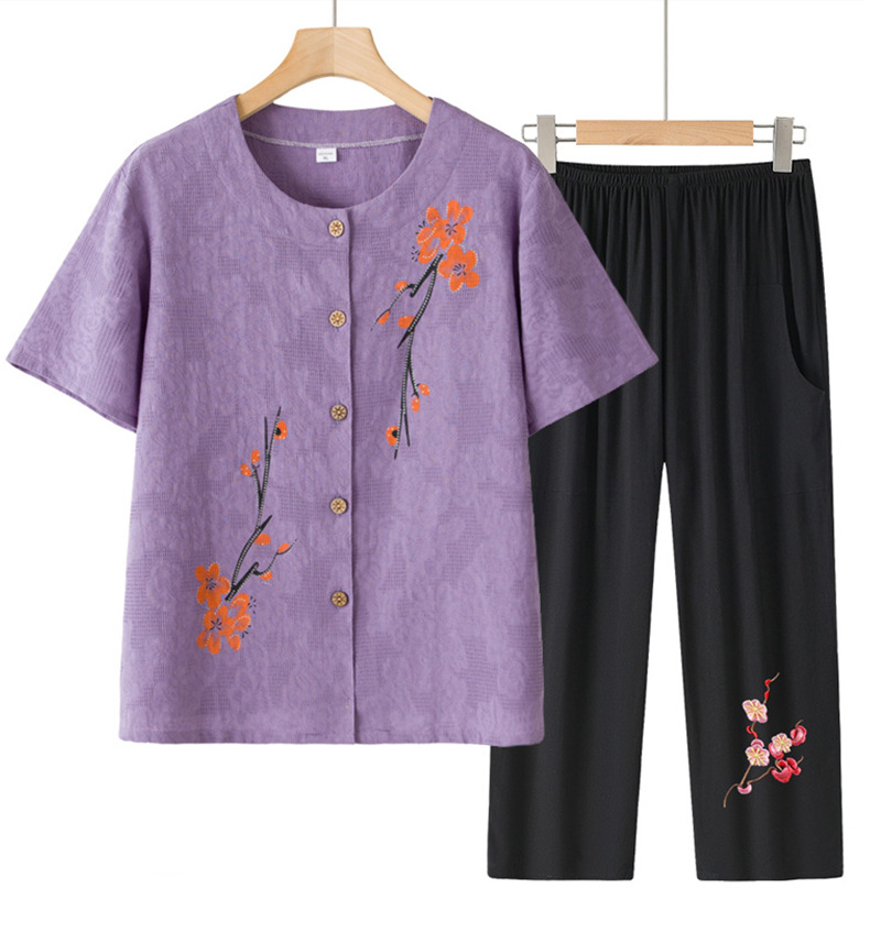 中高年女性シャツ、母親服、夏用ツーピースセット、おばあちゃん服、おばあちゃん半袖刺繍綿スーツ