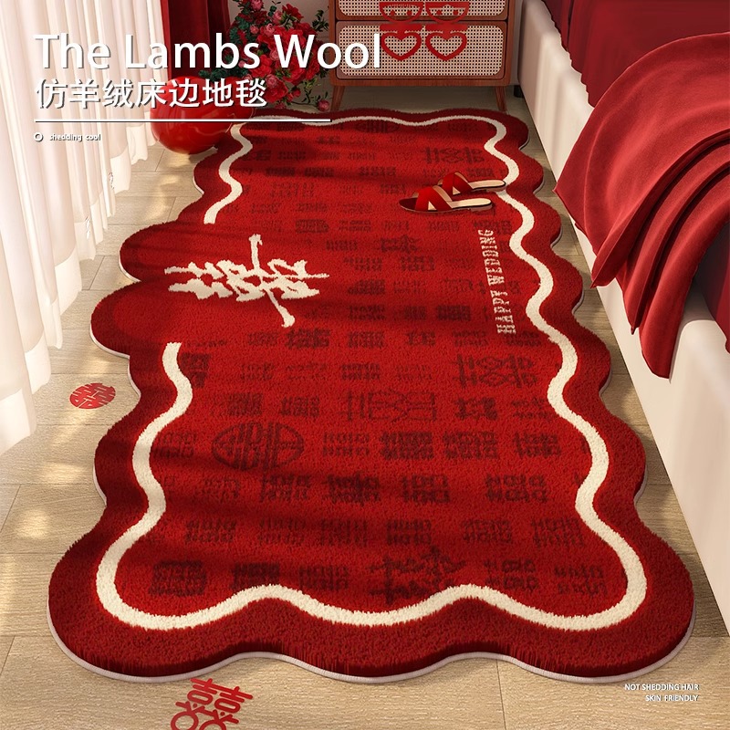 結婚式のハッピーな言葉の豪華なカーペット、赤いお祝いの厚みのあるクールなベッドサイドブランケット、結婚式の部屋の装飾、汚れ防止、耐摩耗性、滑り止めマット