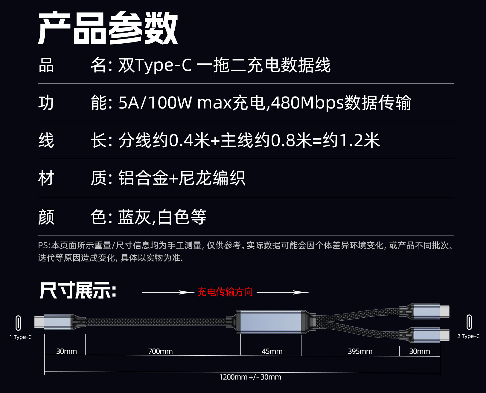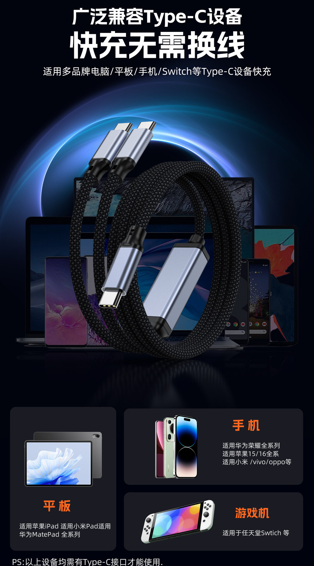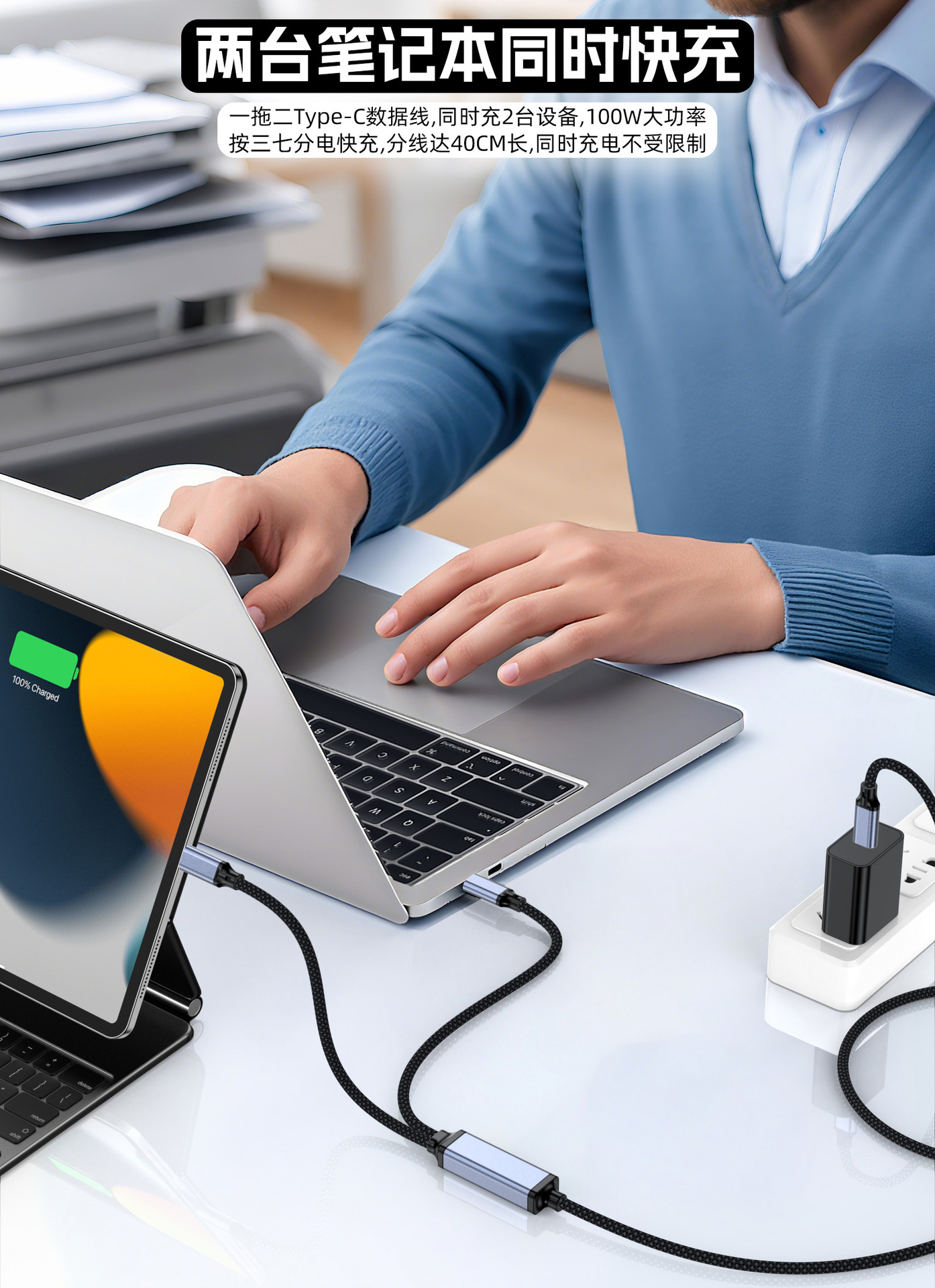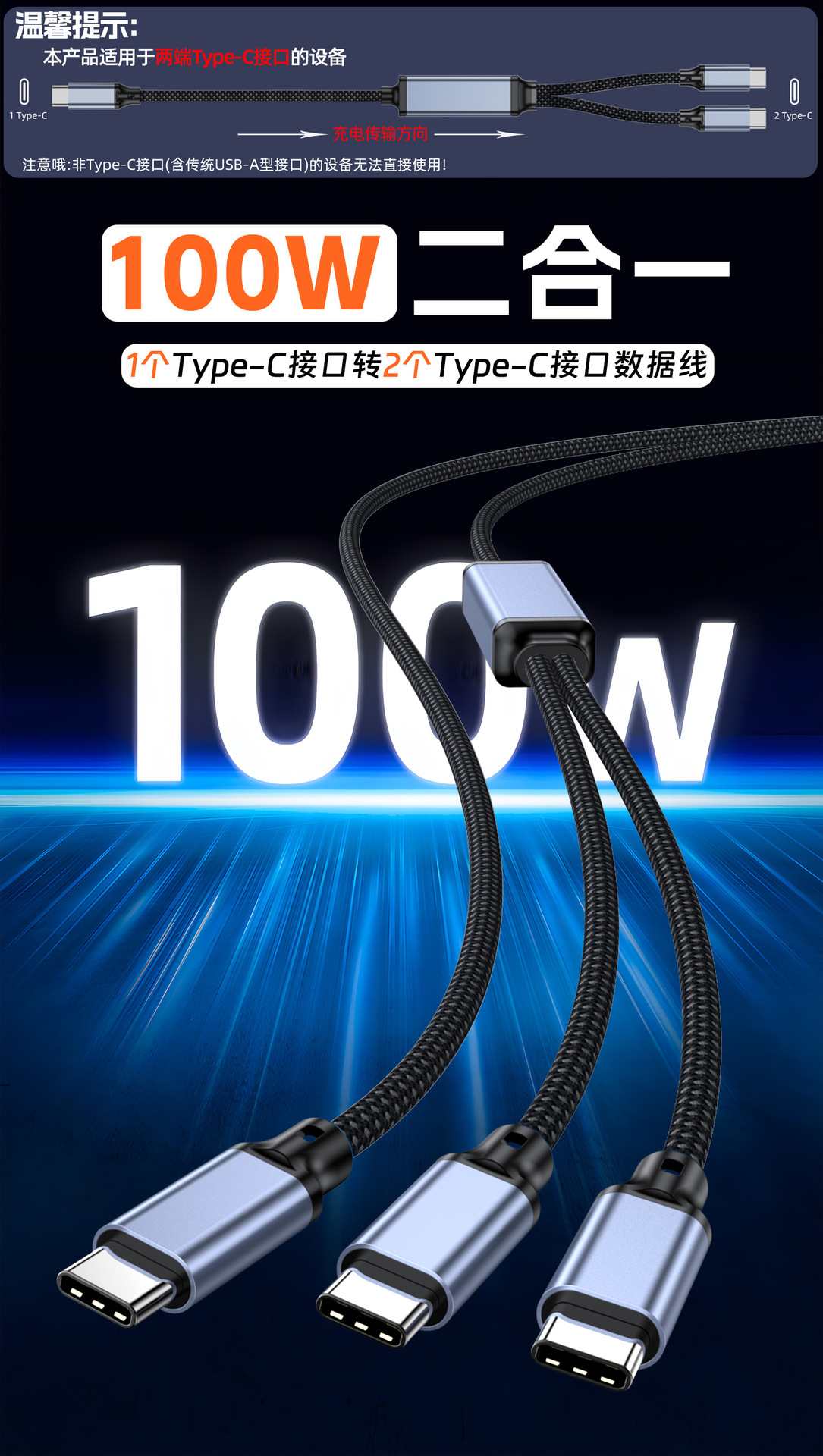 PD100W type-c数据线二合一C-C5A 20v快充手机连电脑一拖二数据线