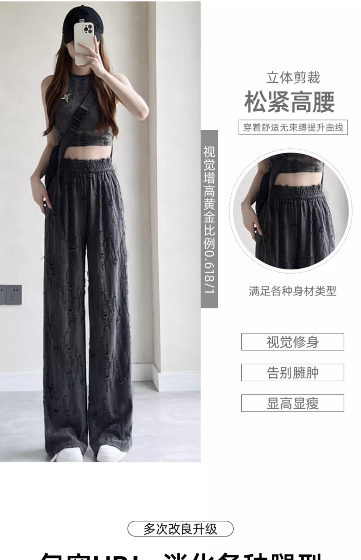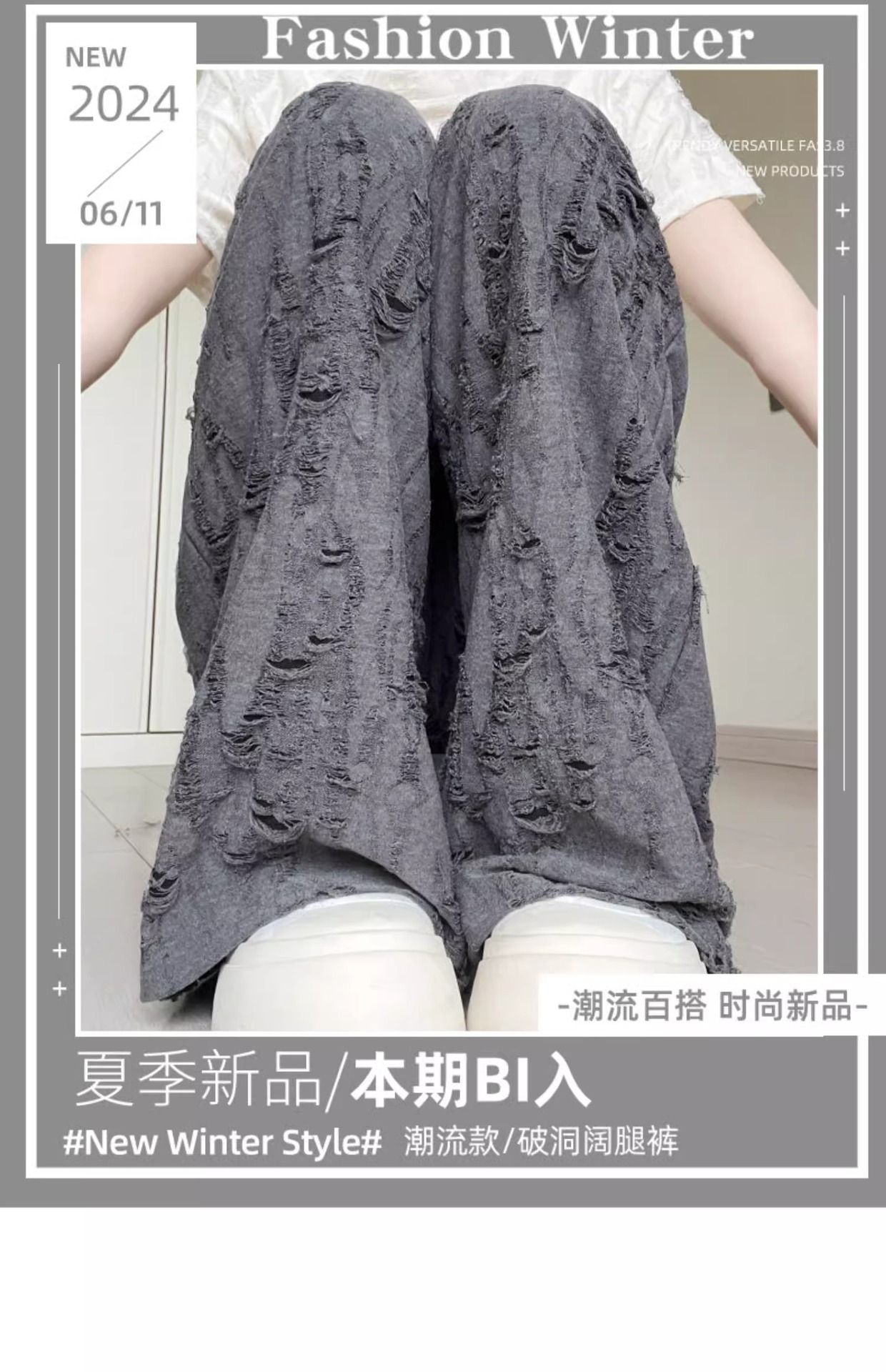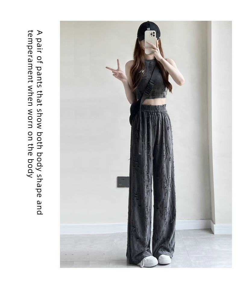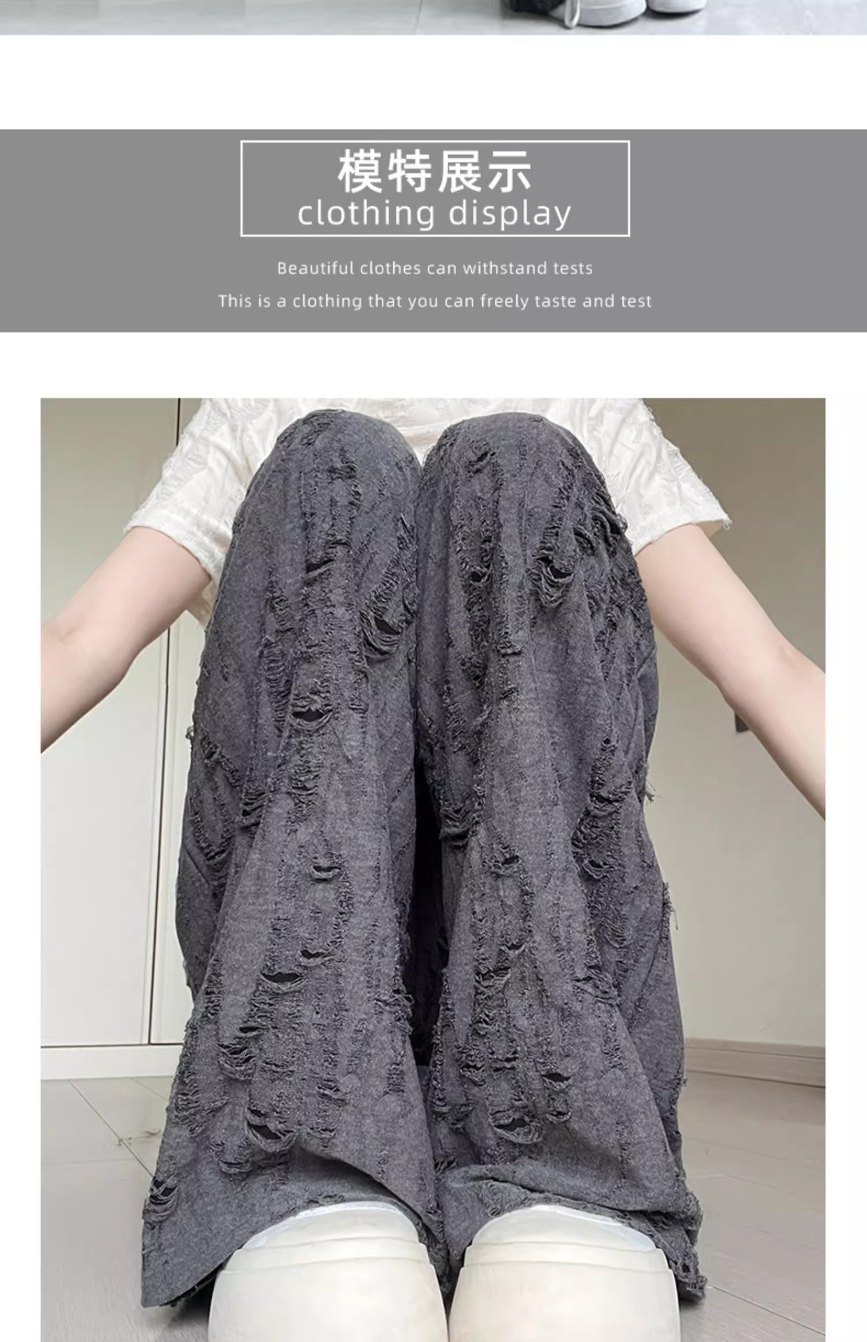グレーの破れたズボンの子供の夏の薄いタイプの高腰の垂れ下がった感じの小さい大衆の設計感のまっすぐな筒は地面の小さい背の広腿のズボンを引きずっています。
