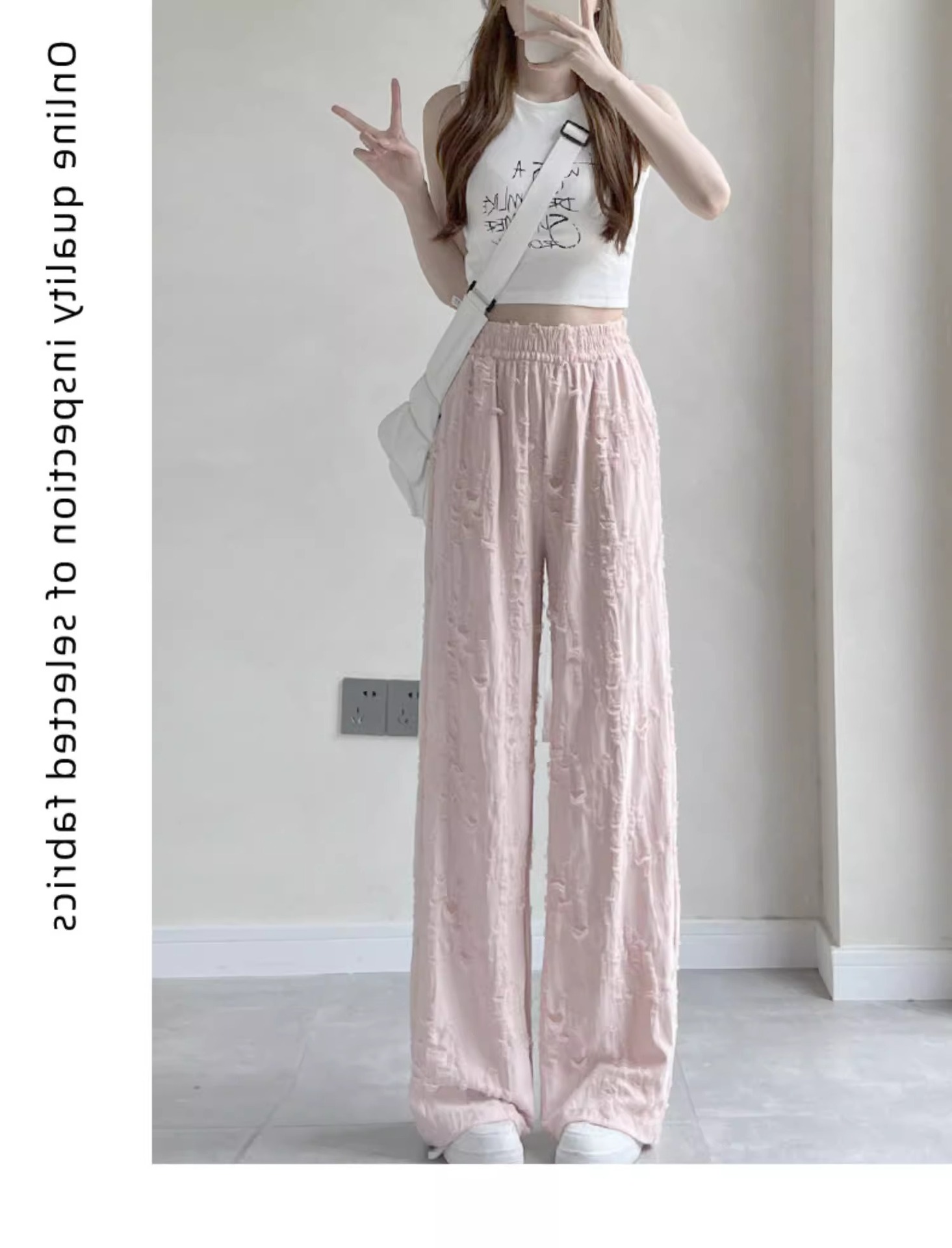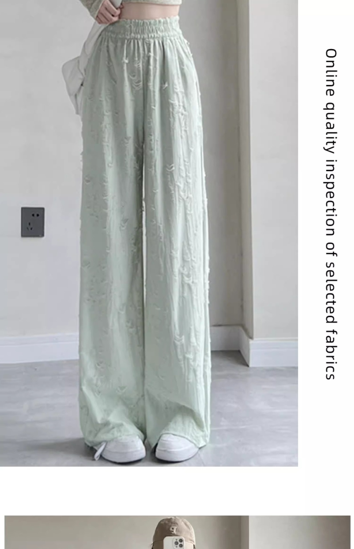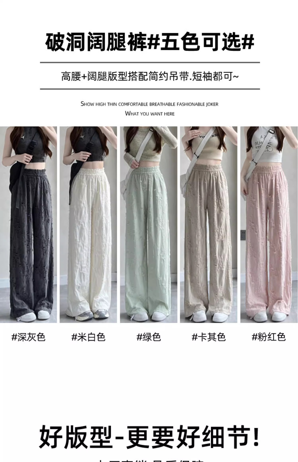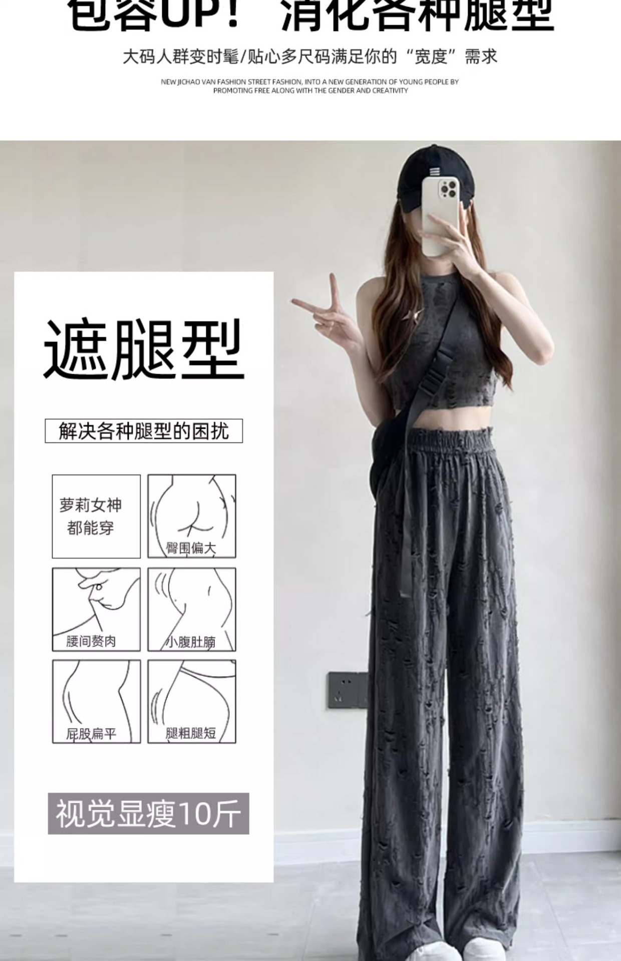 グレーの破れたズボンの子供の夏の薄いタイプの高腰の垂れ下がった感じの小さい大衆の設計感のまっすぐな筒は地面の小さい背の広腿のズボンを引きずっています。
