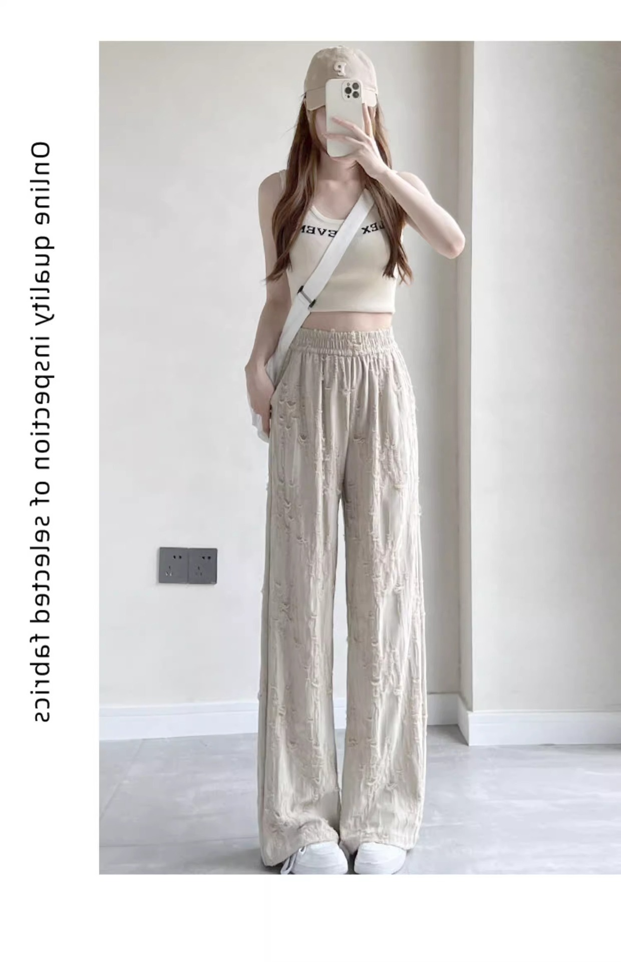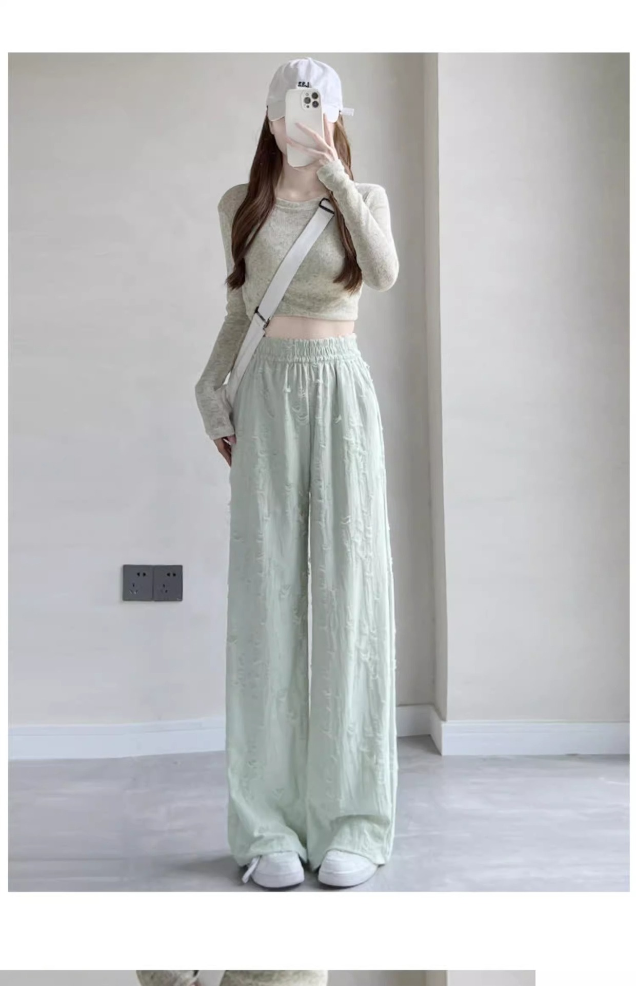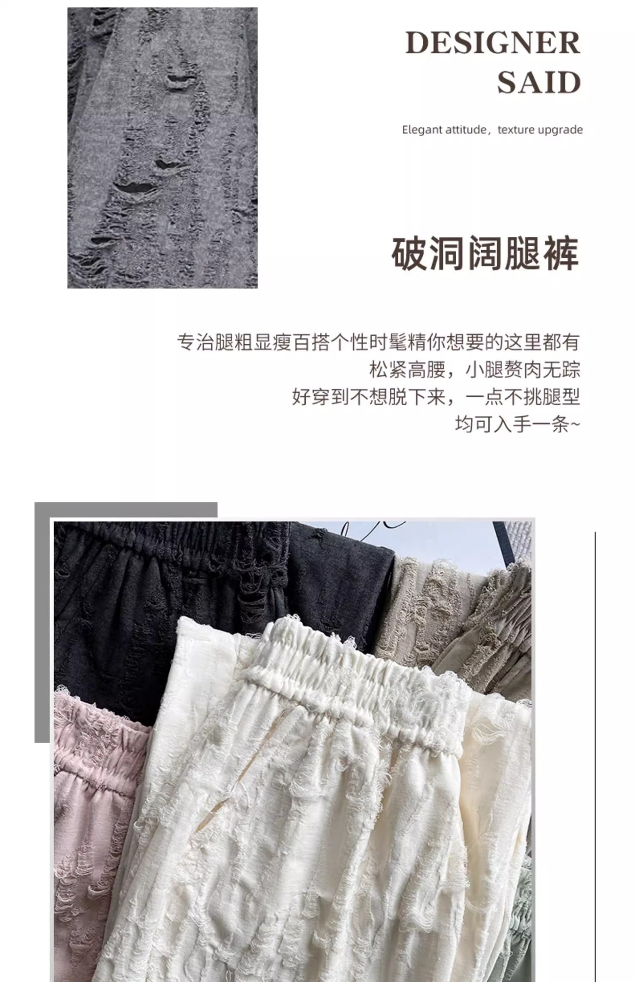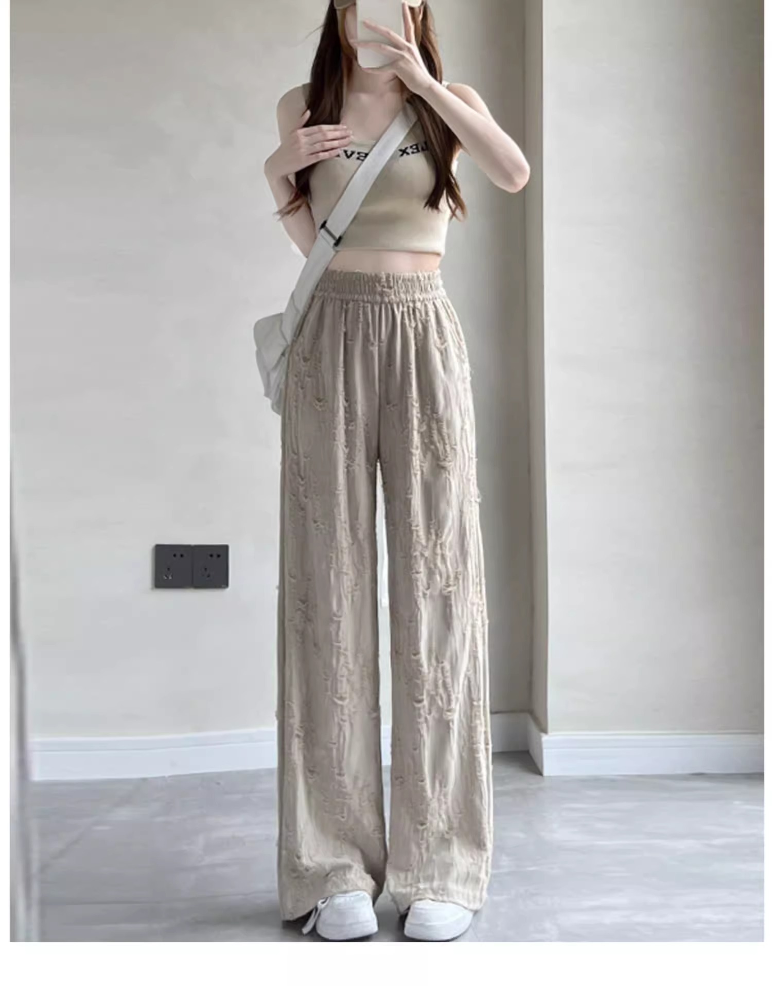 グレーの破れたズボンの子供の夏の薄いタイプの高腰の垂れ下がった感じの小さい大衆の設計感のまっすぐな筒は地面の小さい背の広腿のズボンを引きずっています。