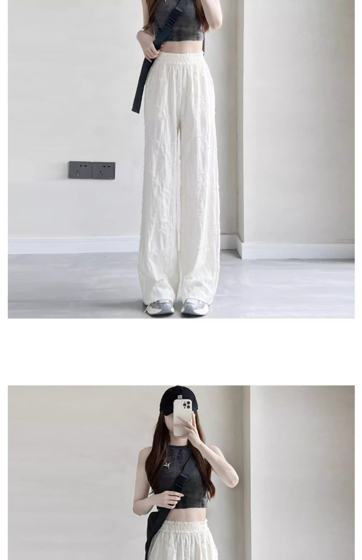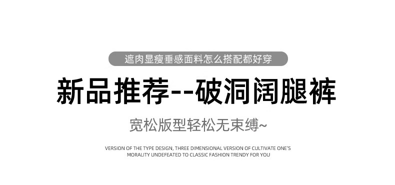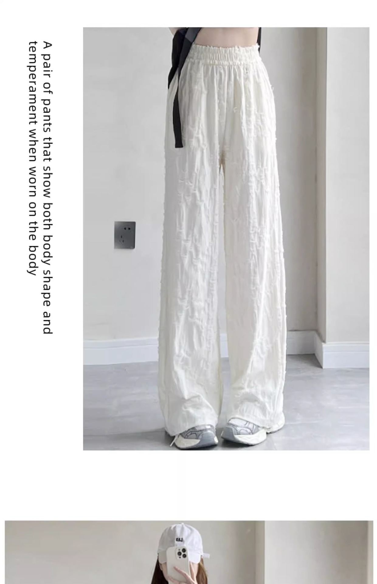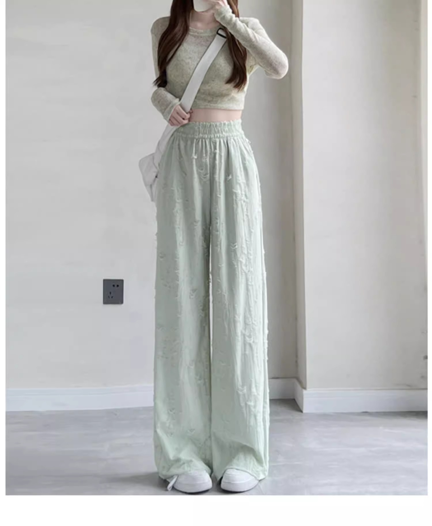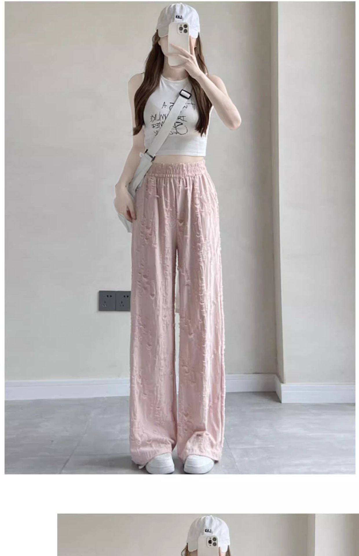 グレーの破れたズボンの子供の夏の薄いタイプの高腰の垂れ下がった感じの小さい大衆の設計感のまっすぐな筒は地面の小さい背の広腿のズボンを引きずっています。
