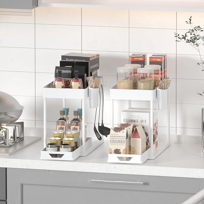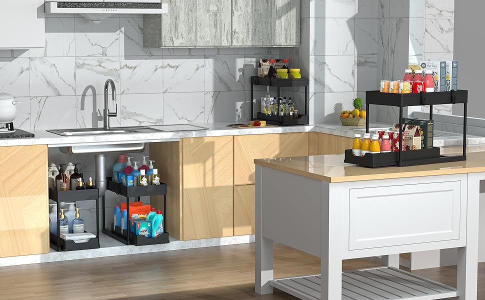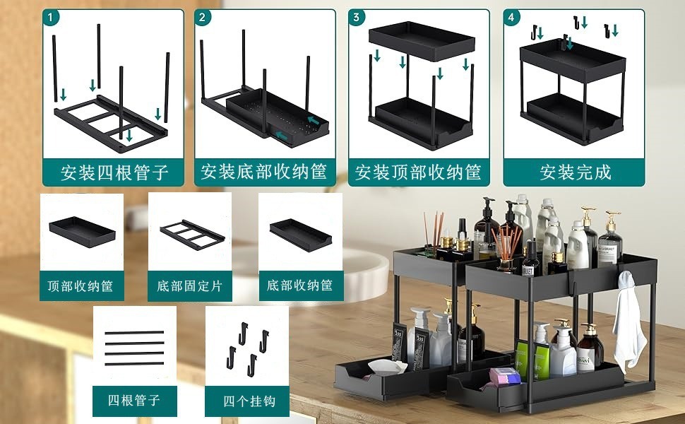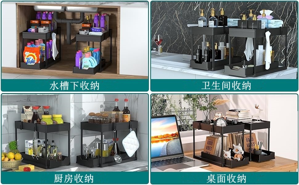 亚马逊双层抽拉置物架厨房台面推拉式调料收纳架橱柜下水槽置物架