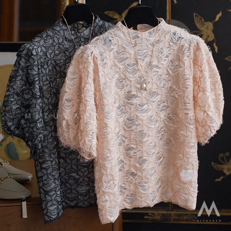 軽くて豪華な高級感のウールのニットの透かし彫りのフックの花の小さいシャツの女性の夏2025新型の泡の袖の半袖のtシャツの上着