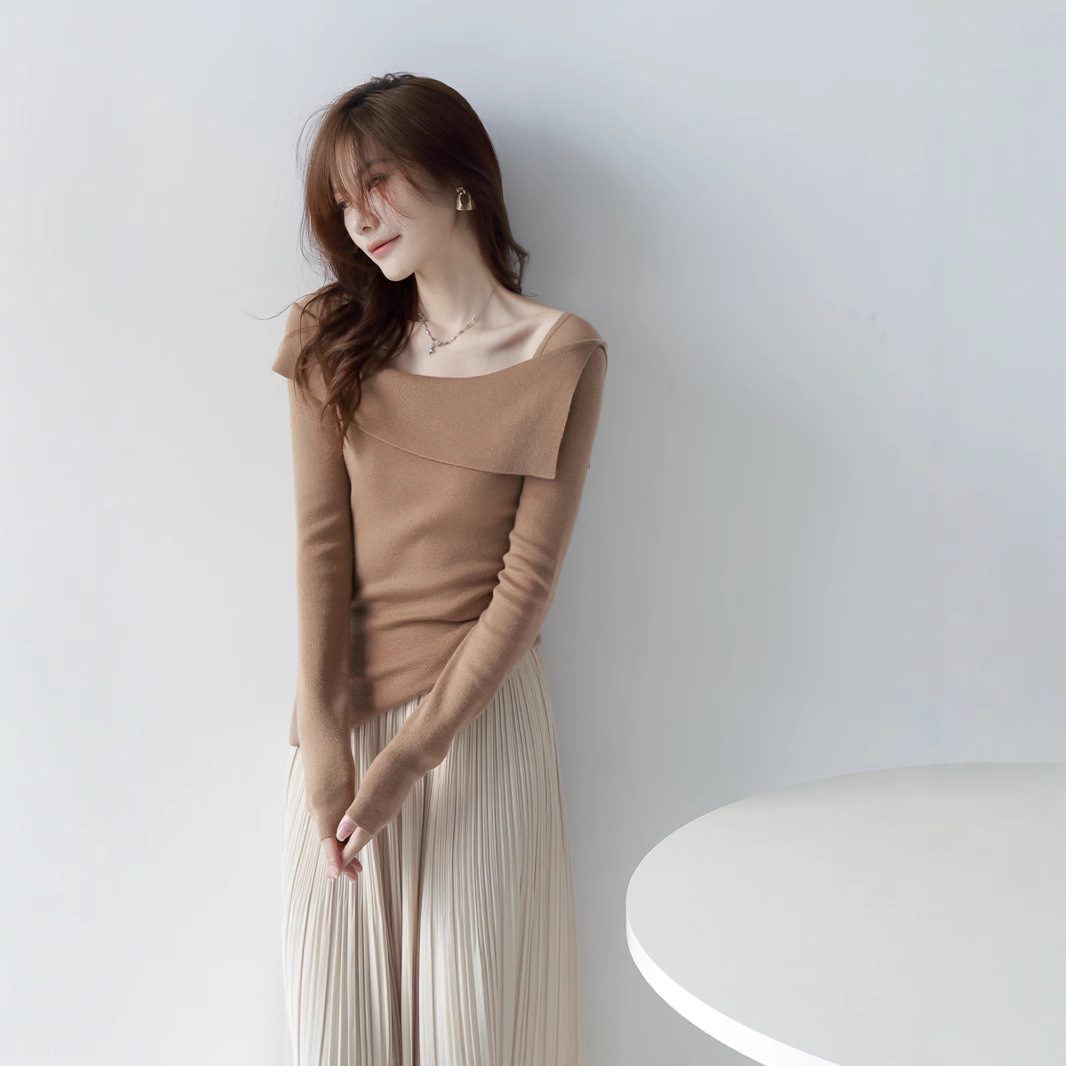 香港ミー服飾/2025秋冬婦人服ウールセーター秋の新作ワンショルダートップス女性長袖ニットセーター