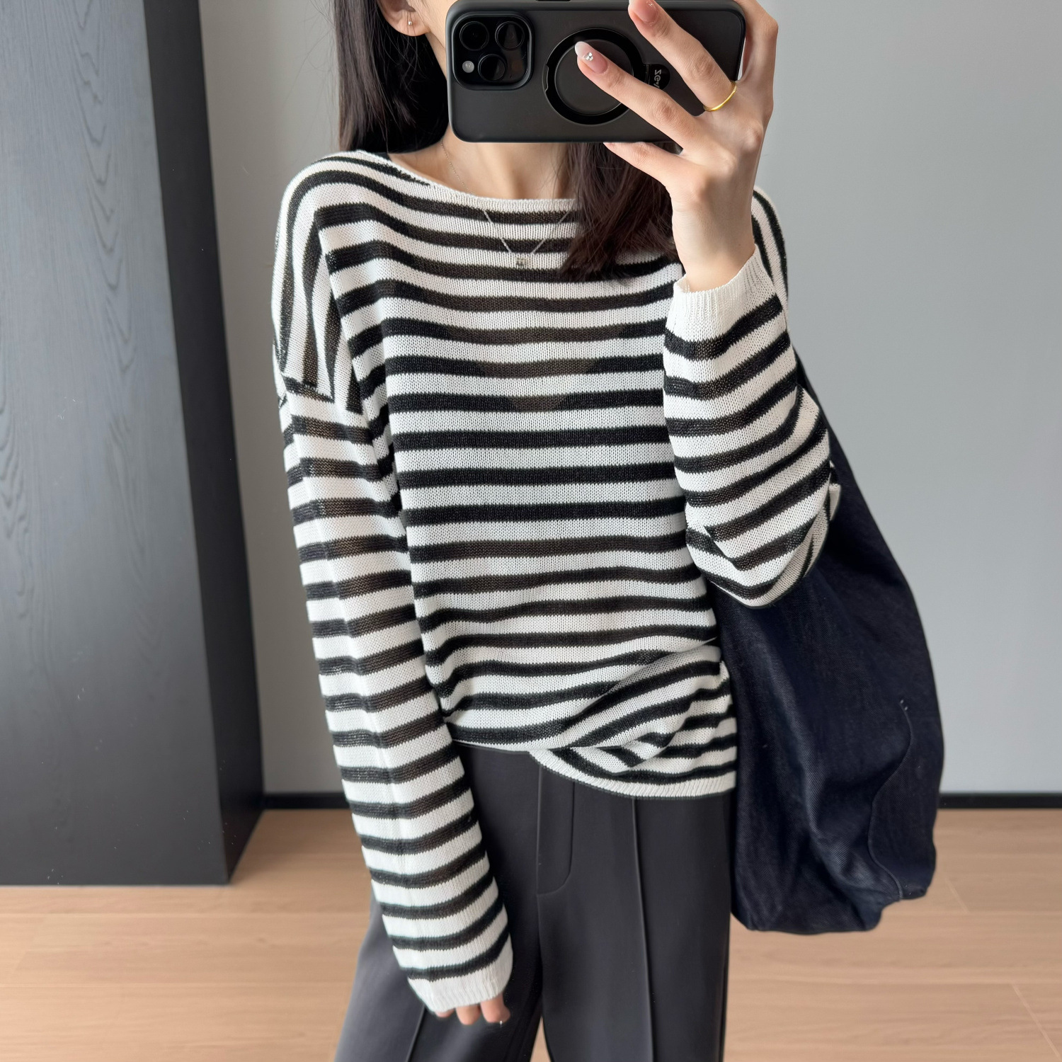 痩せて見える10斤 ~ 怠惰な風天糸一字丸襟薄い縞長袖亜麻ニット女2025新