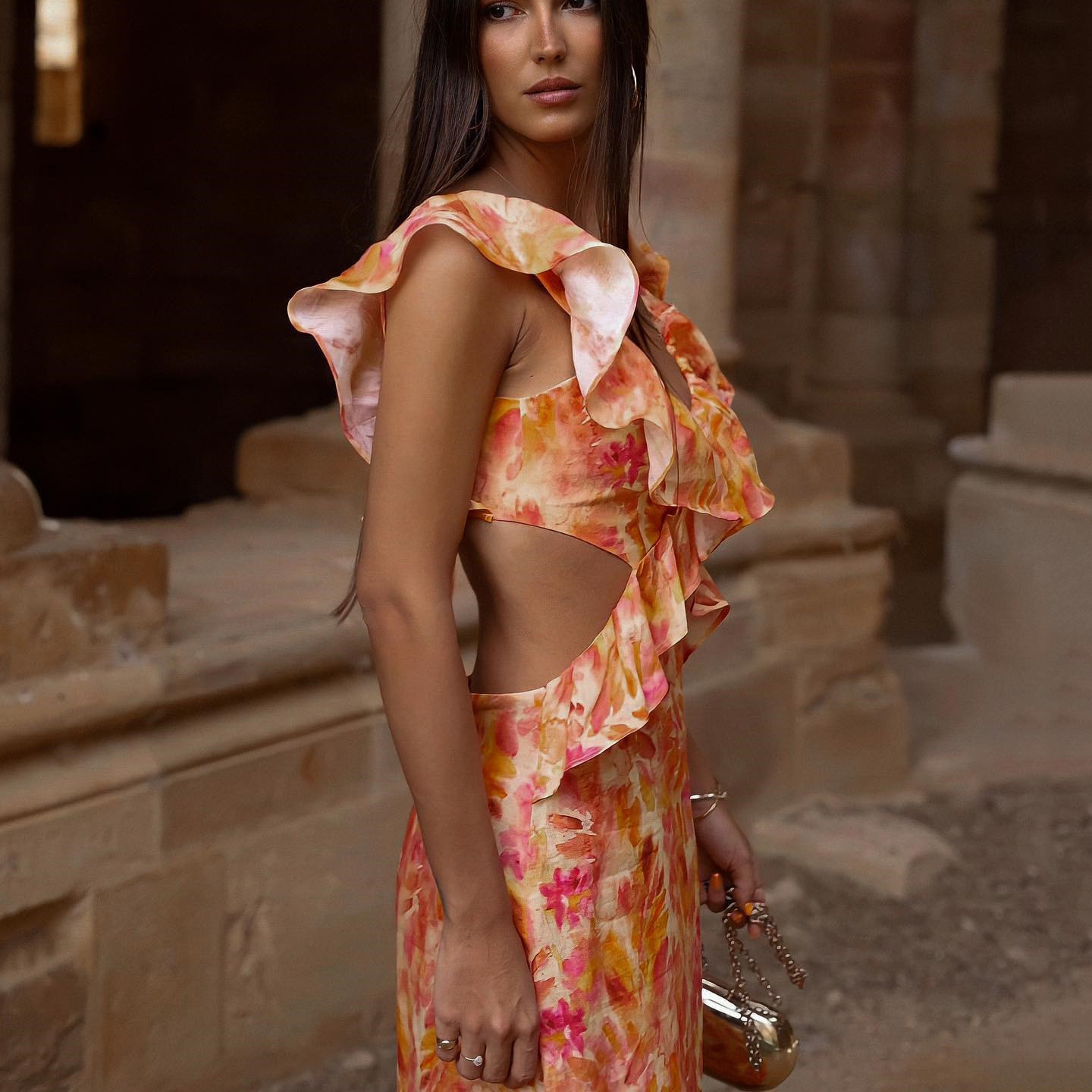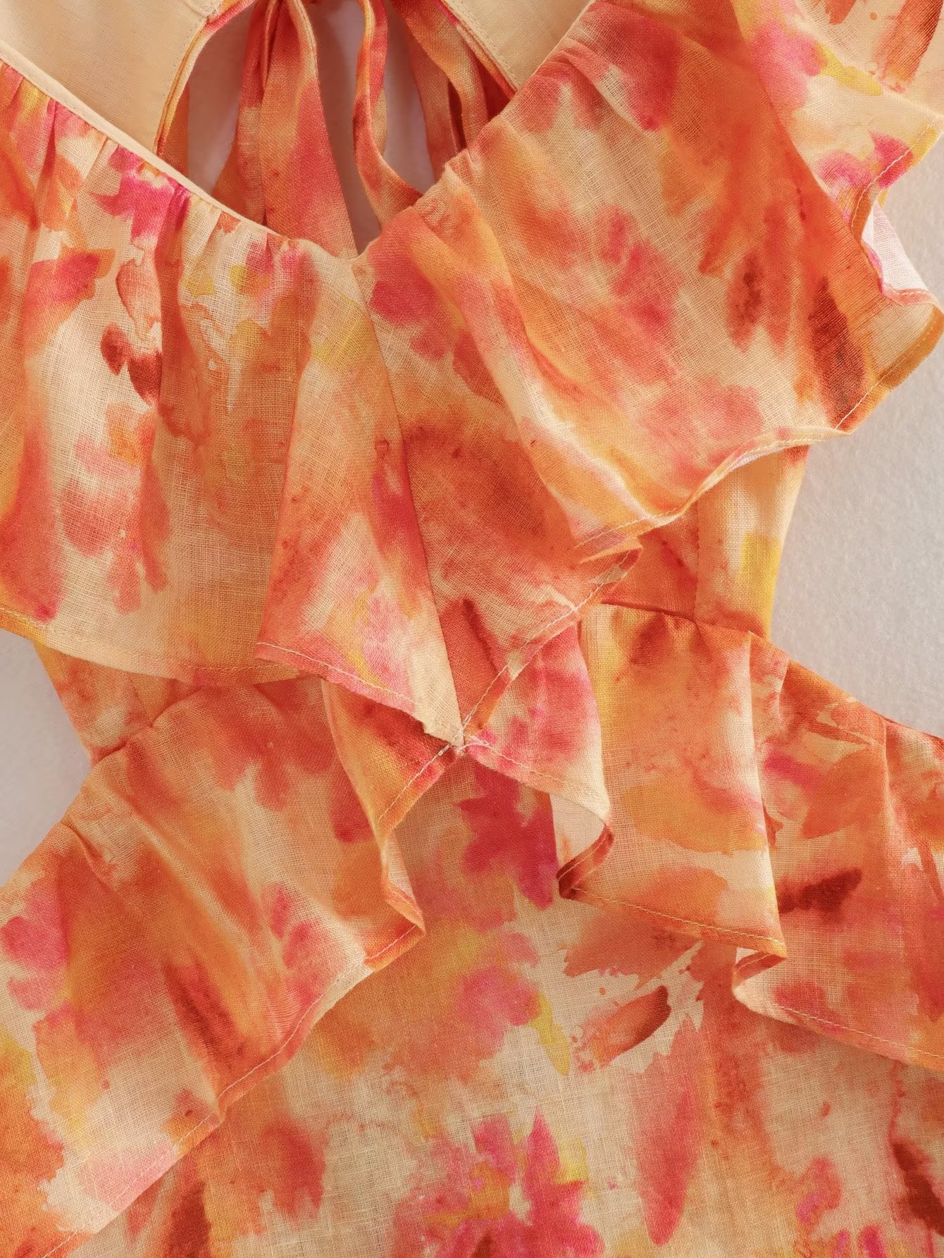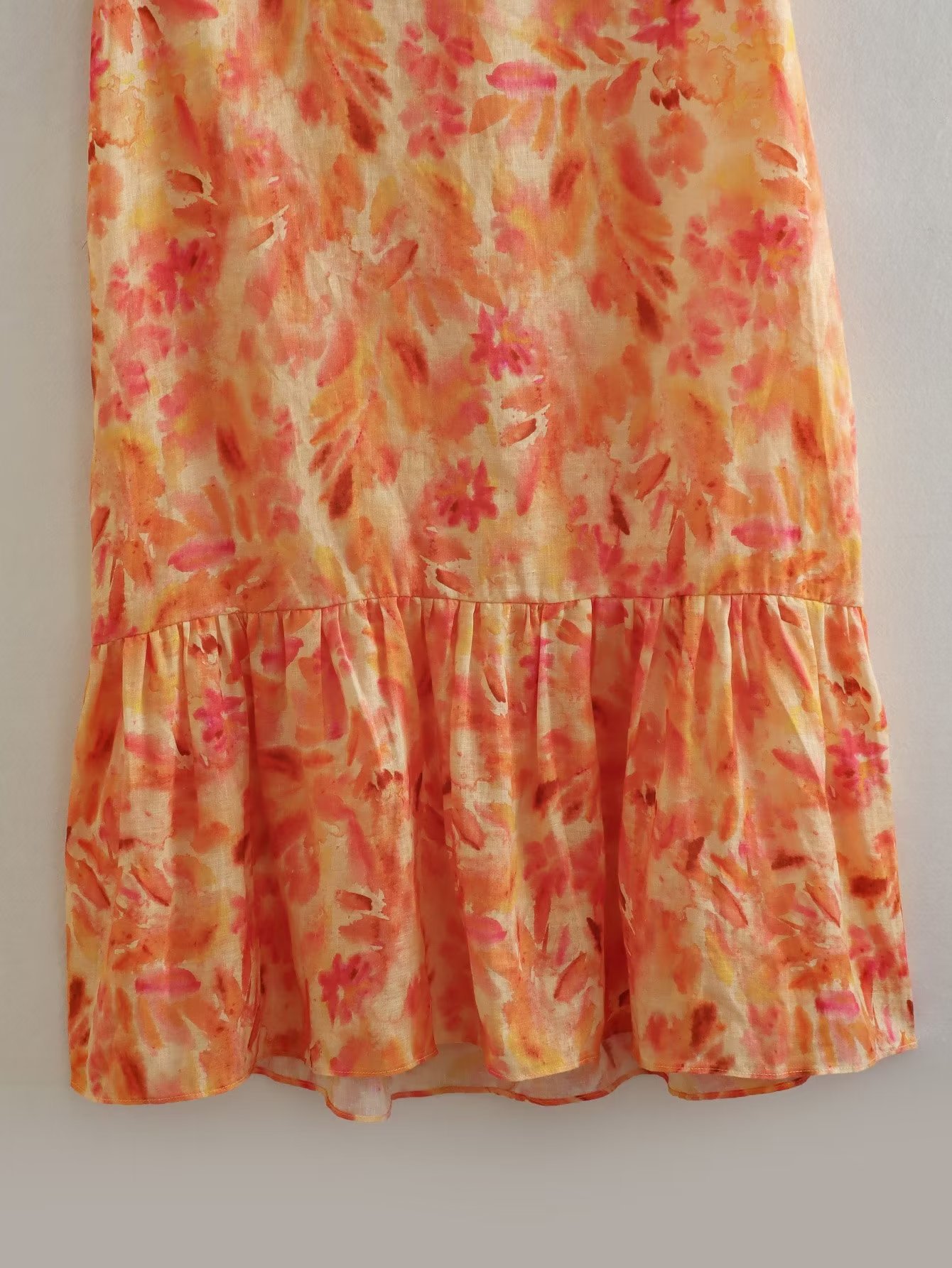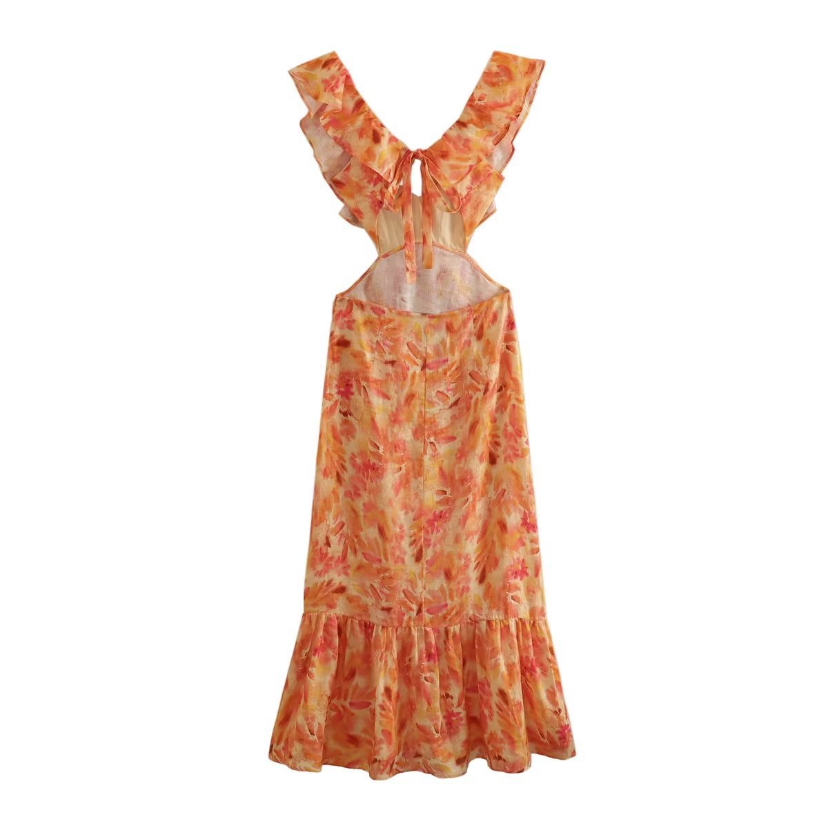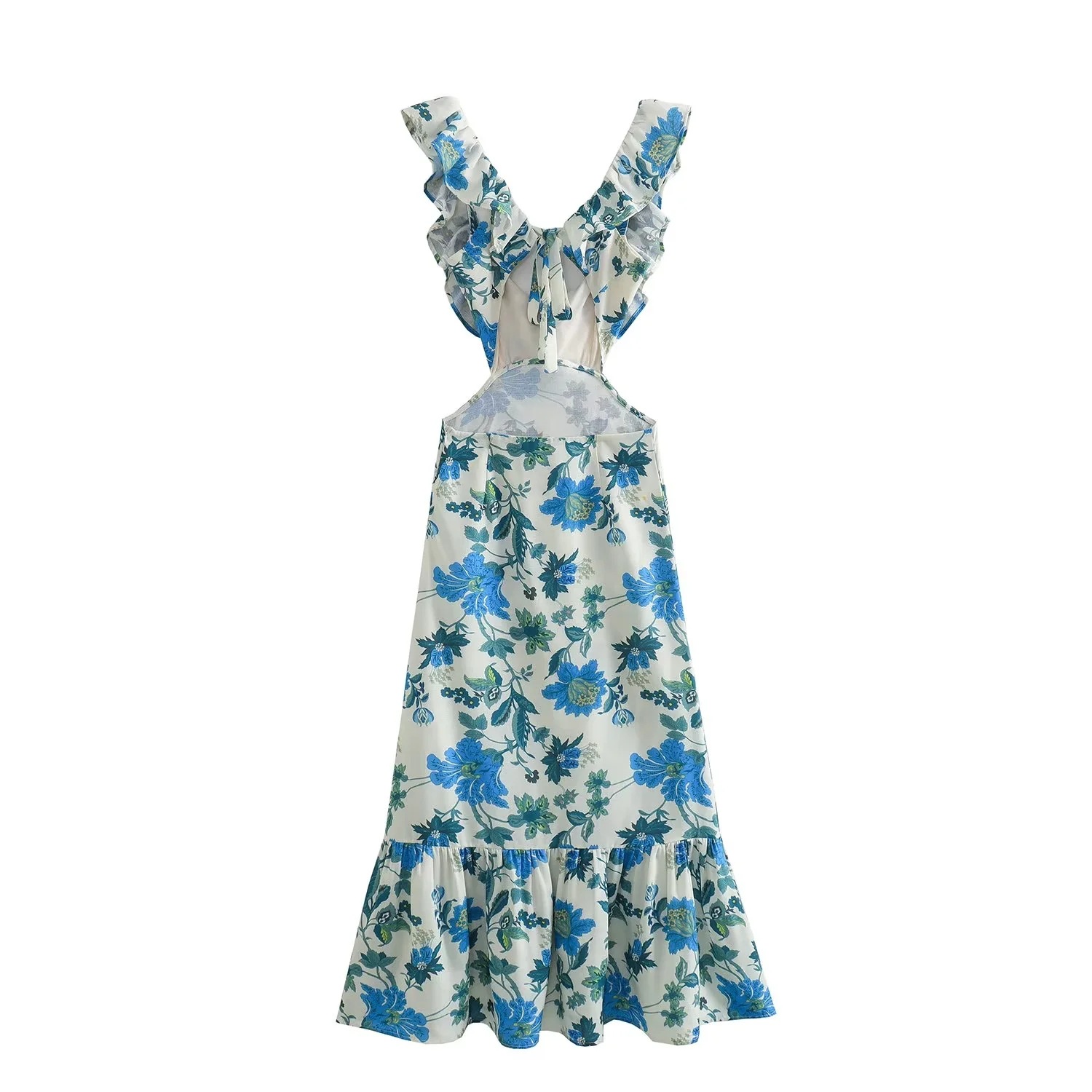 サスペンダードレス夏の新しいデザインニッチクロスフリルプリントロングドレス女性用