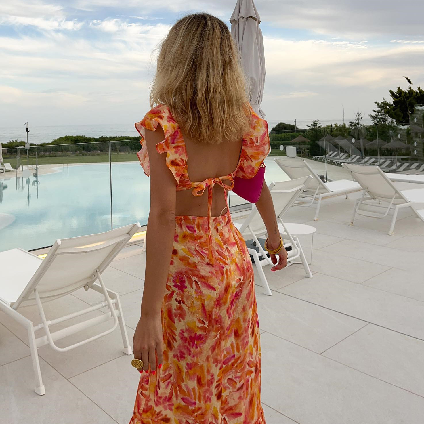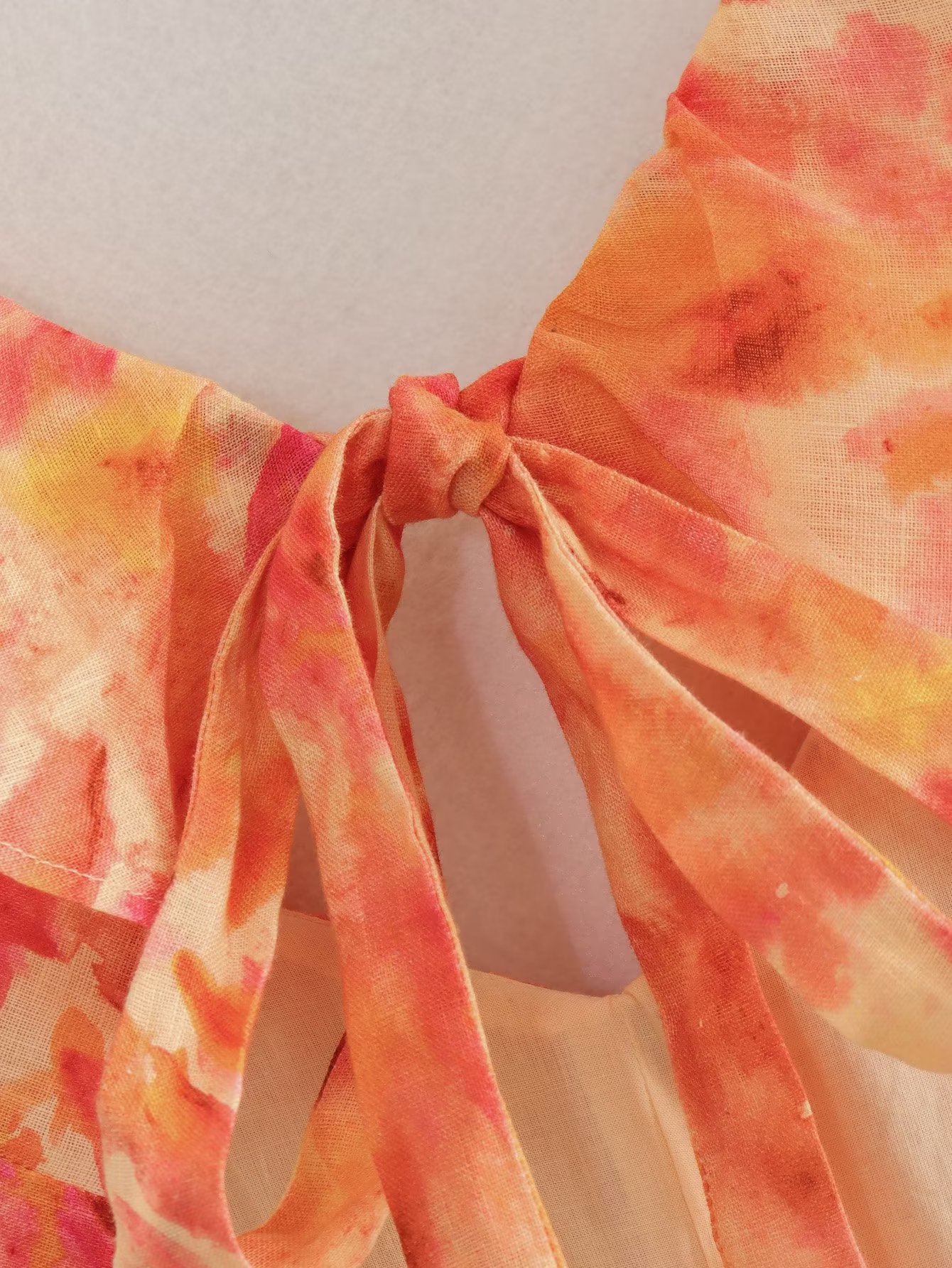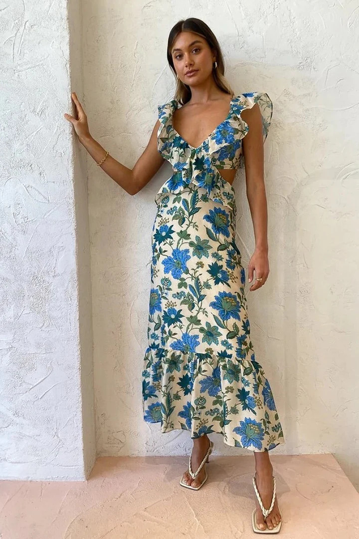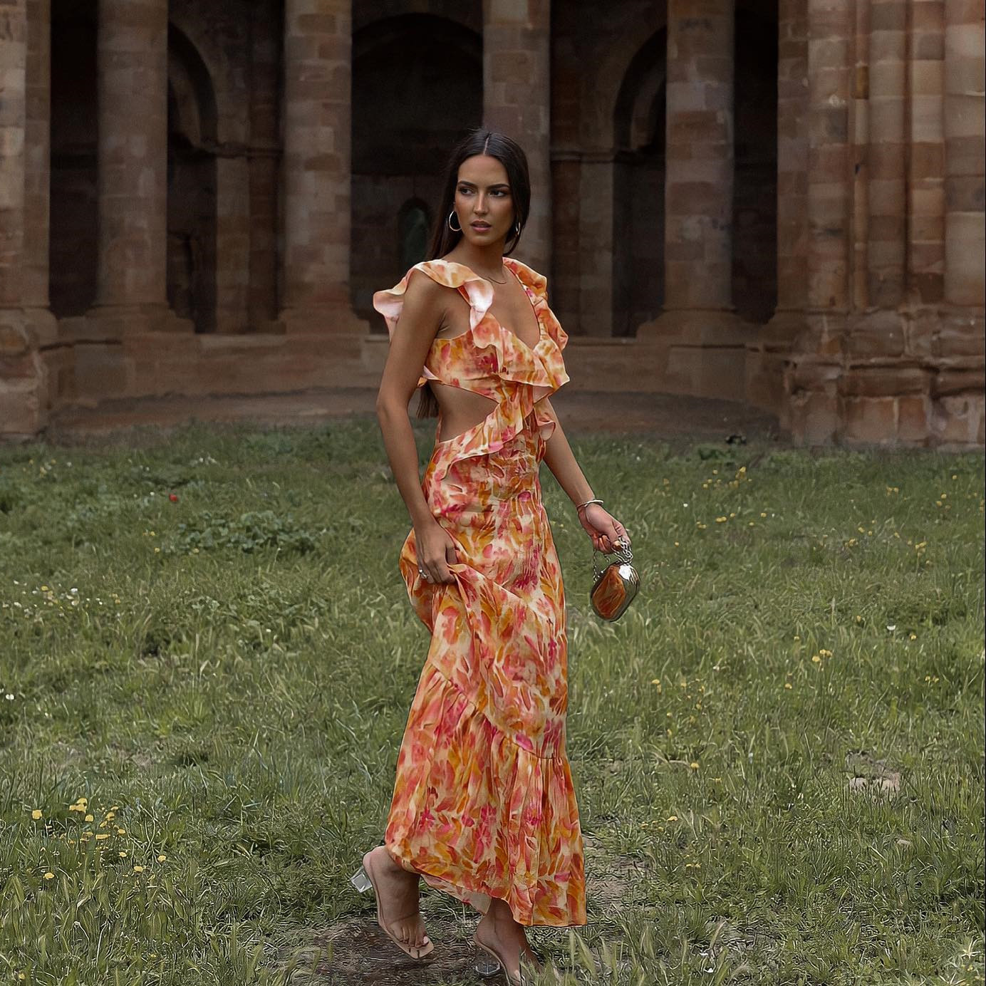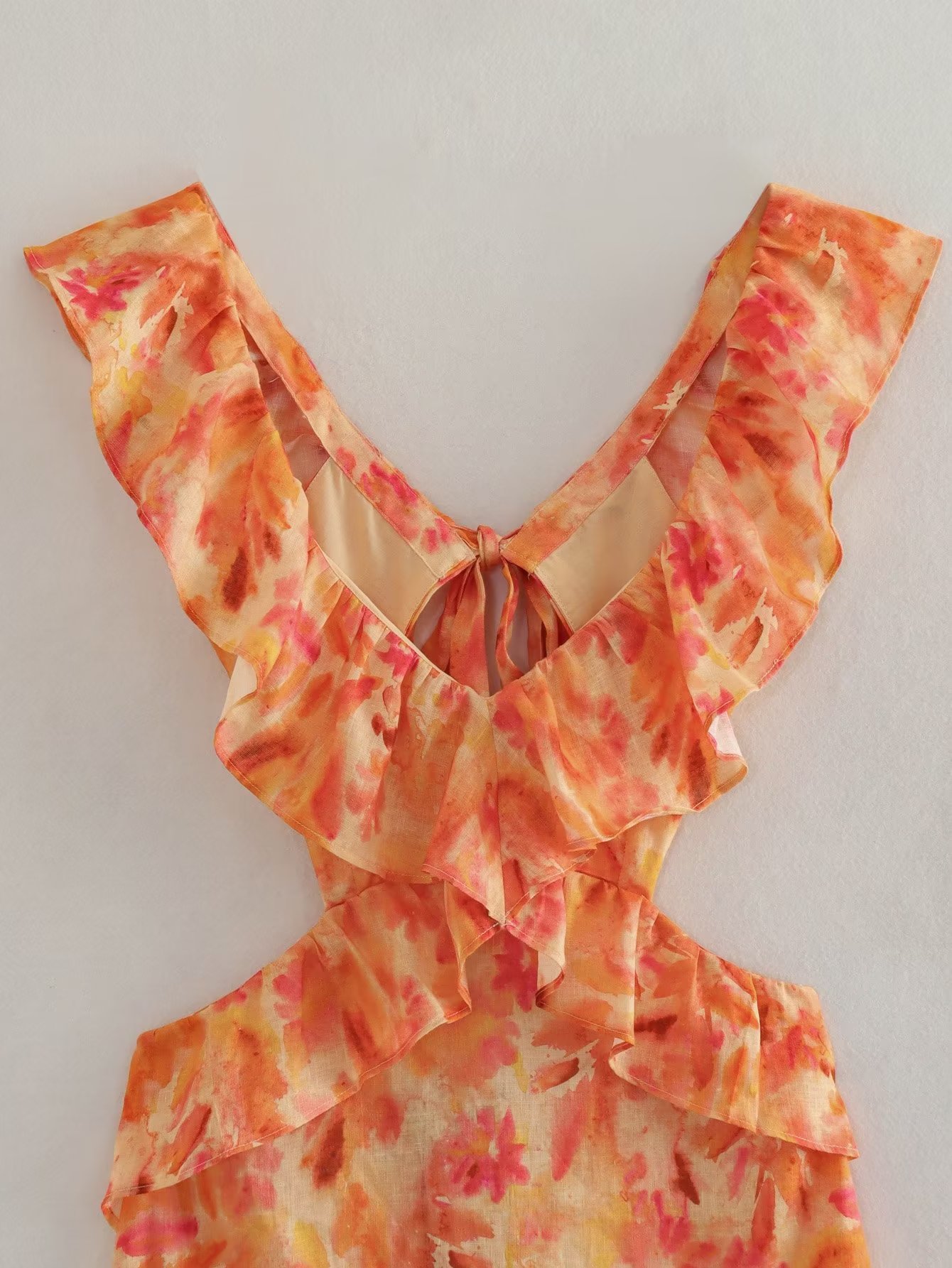 サスペンダードレス夏の新しいデザインニッチクロスフリルプリントロングドレス女性用