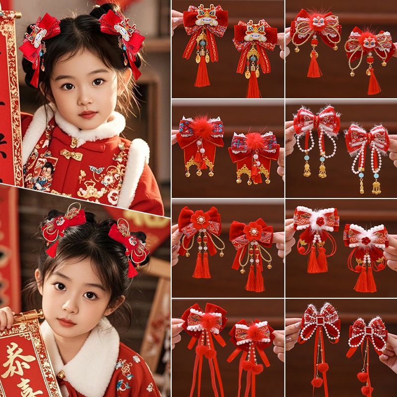 儿童新年发饰红色喜庆蝴蝶结对夹国风流苏毛球发卡小女孩发夹头饰