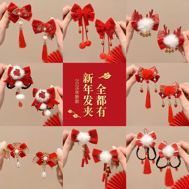 儿童新年发夹批发2026新款蝴蝶结流苏对夹古风可爱发卡鸭嘴夹发饰