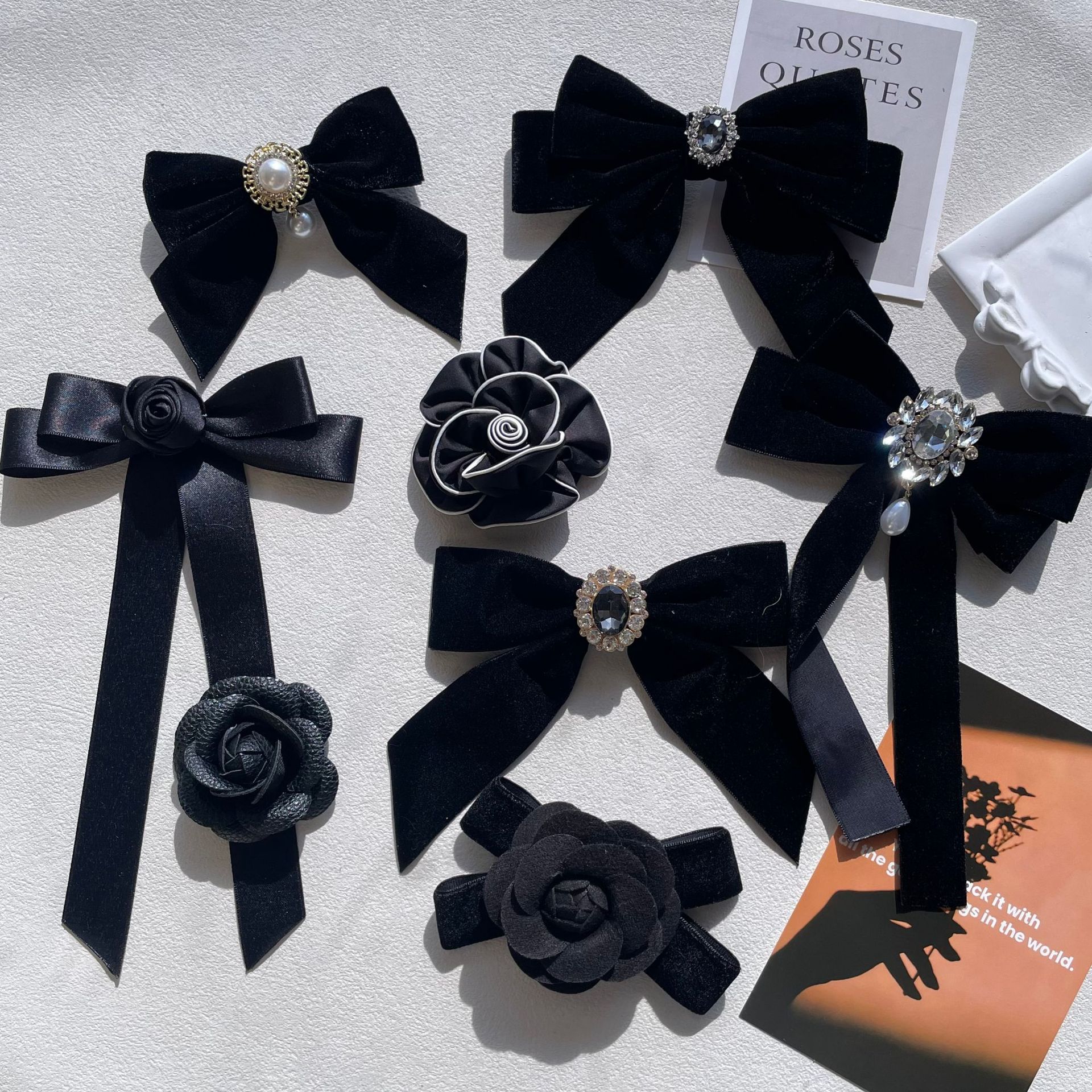 新款复古洛丽塔黑色丝绒蝴蝶结胸针领结女百搭学院风领花别针现货