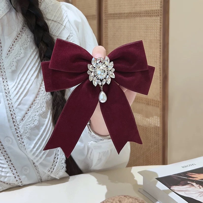 新款酒红天鹅绒小香风山茶花胸针蝴蝶结胸花别针百搭领结花女配饰