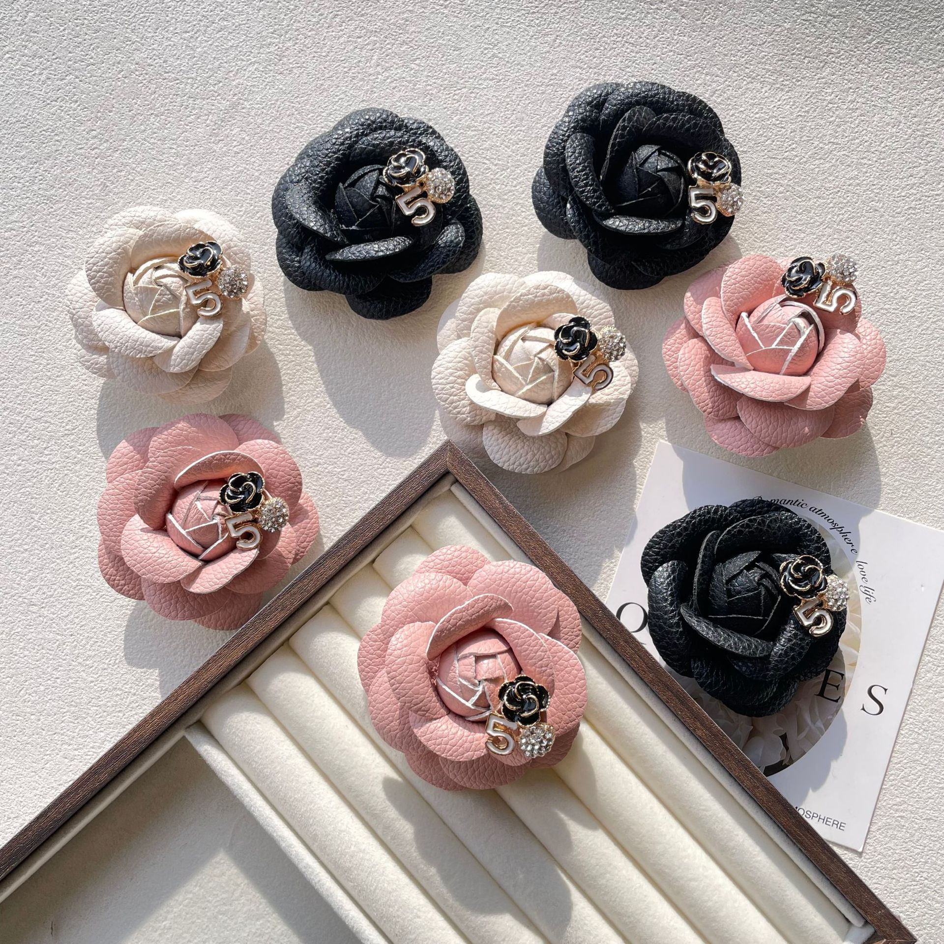 自制小香风带钻山茶花胸针法式复古别针装饰pu皮革衣服配饰现货