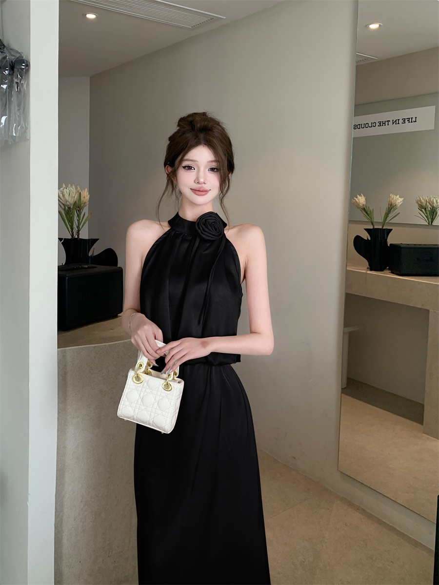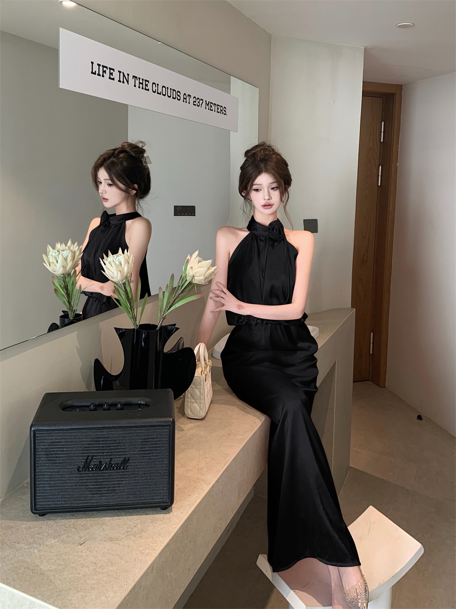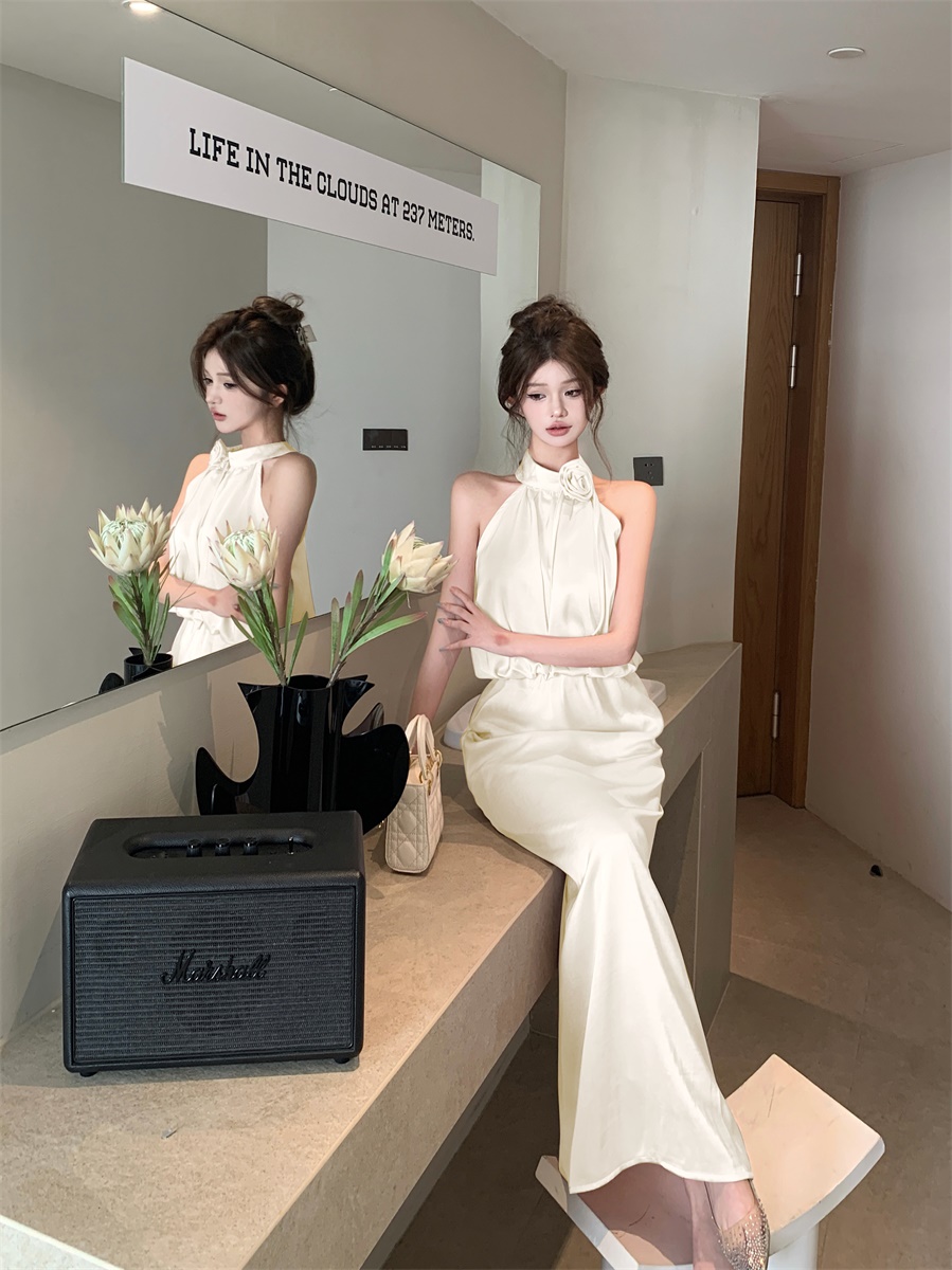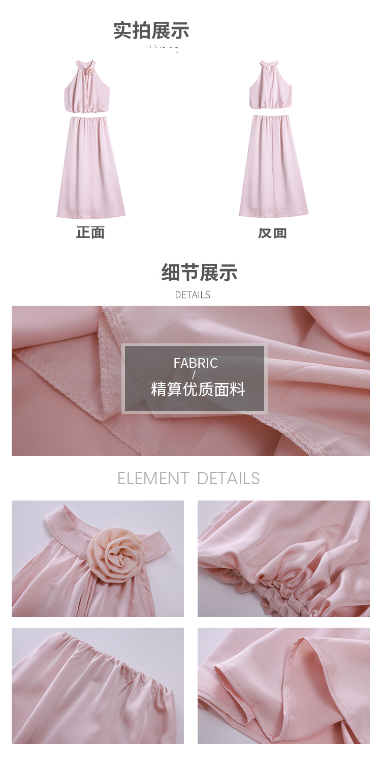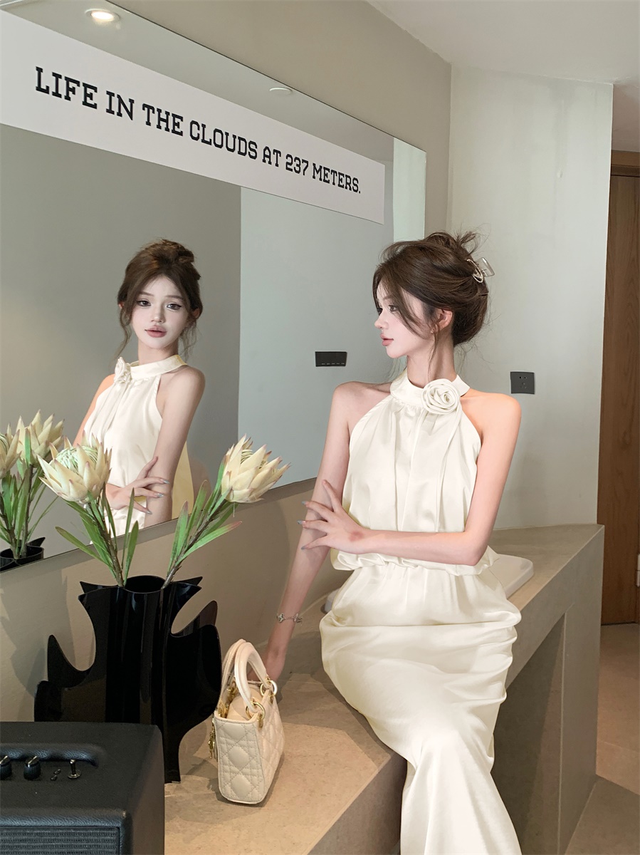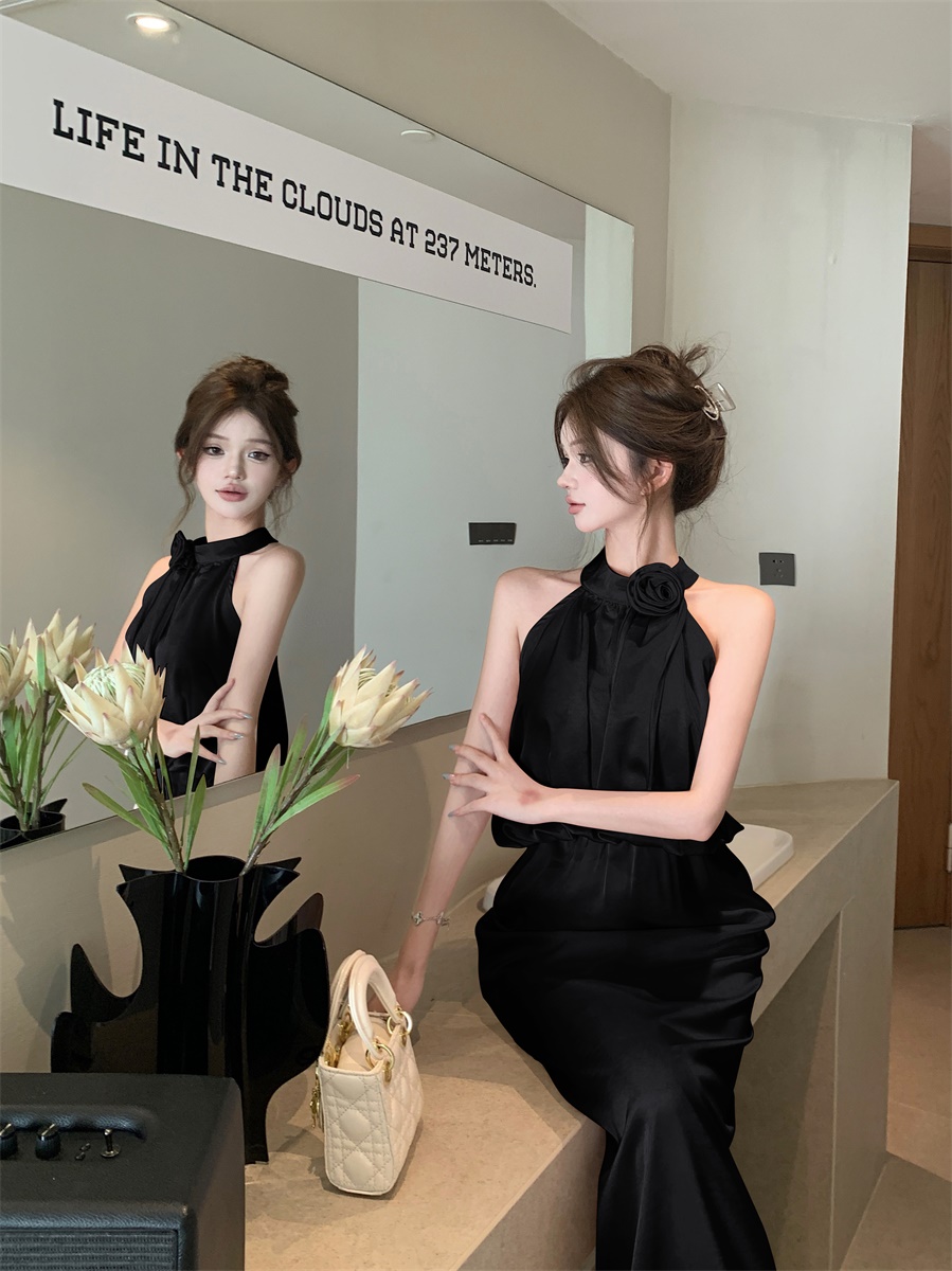 高级法式夏季套装立体花朵气质无袖背心缎面上衣高腰半身裙两件套