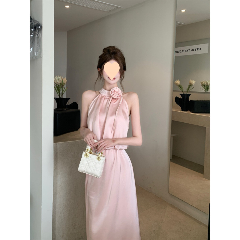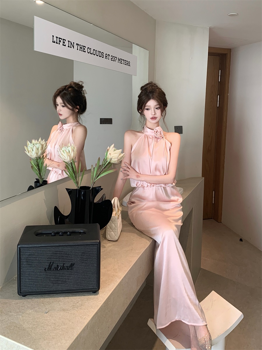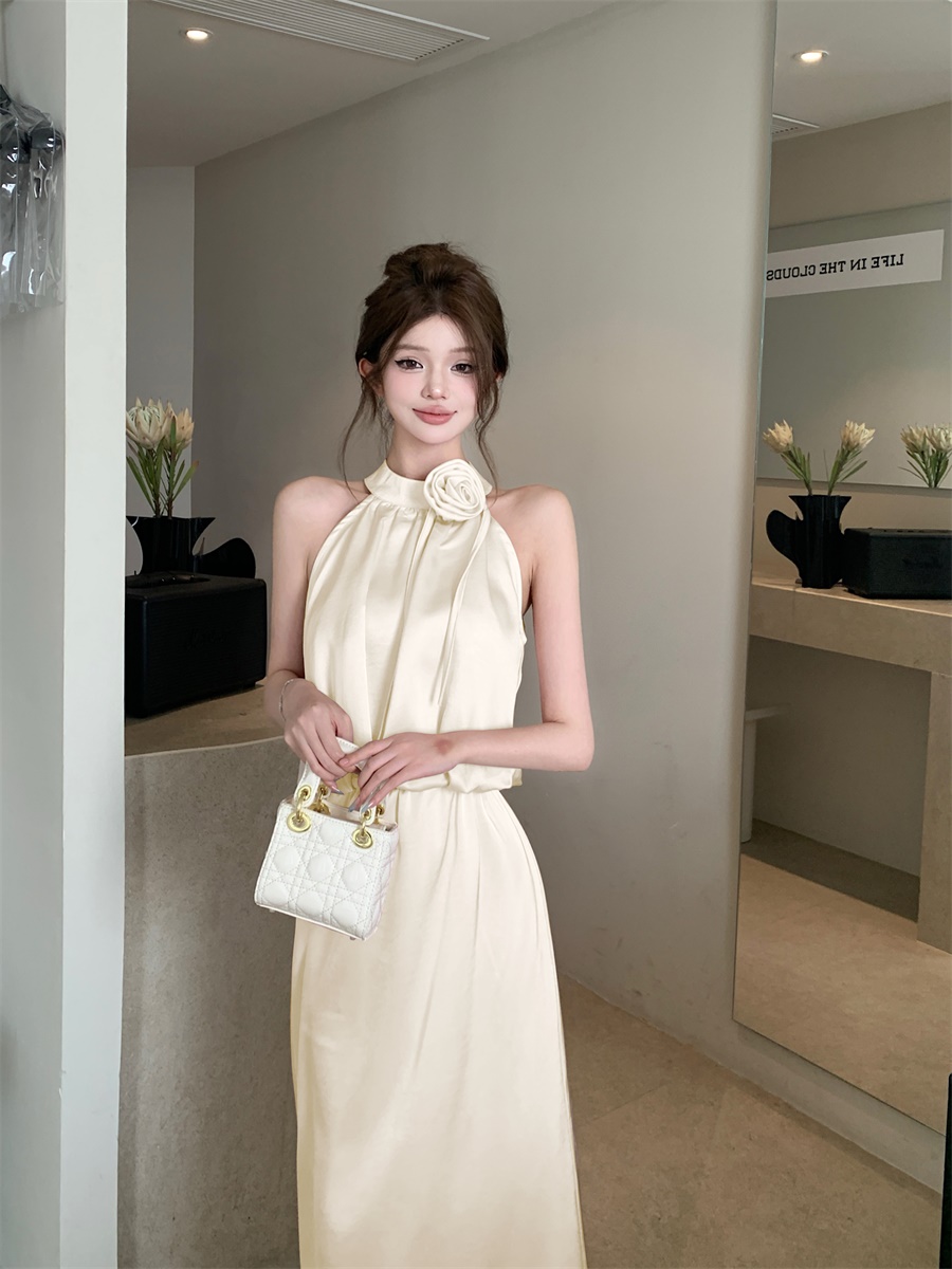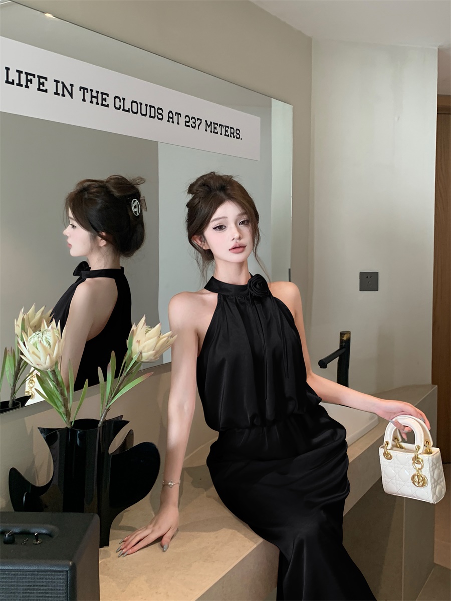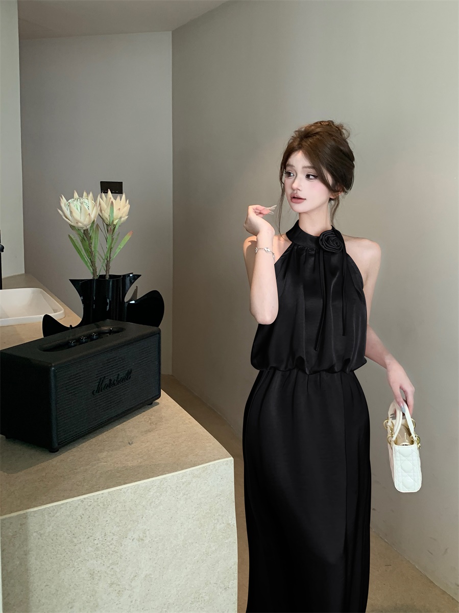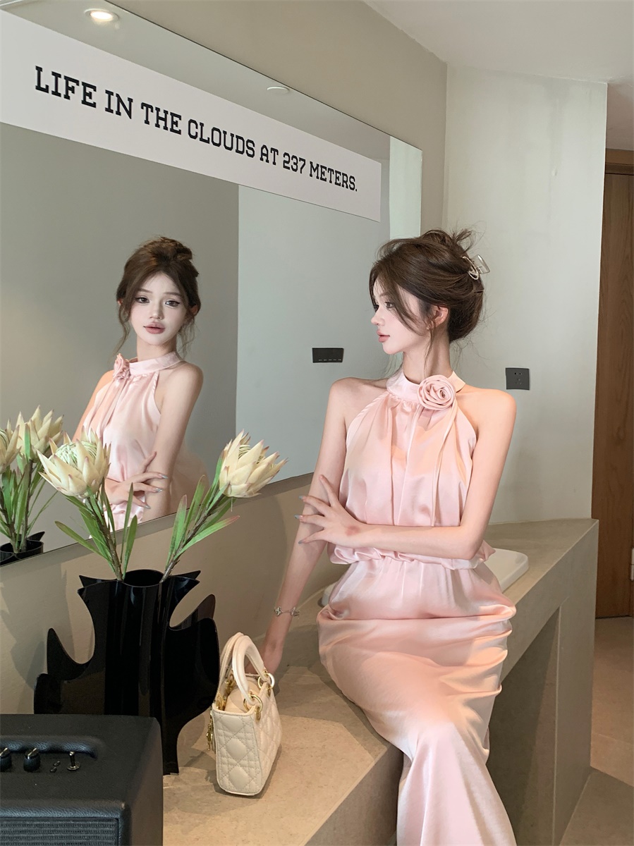 高级法式夏季套装立体花朵气质无袖背心缎面上衣高腰半身裙两件套