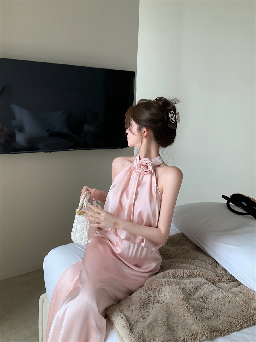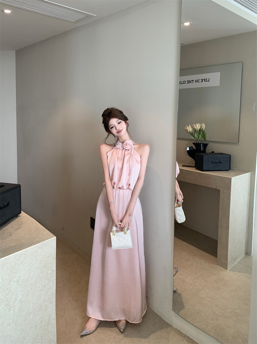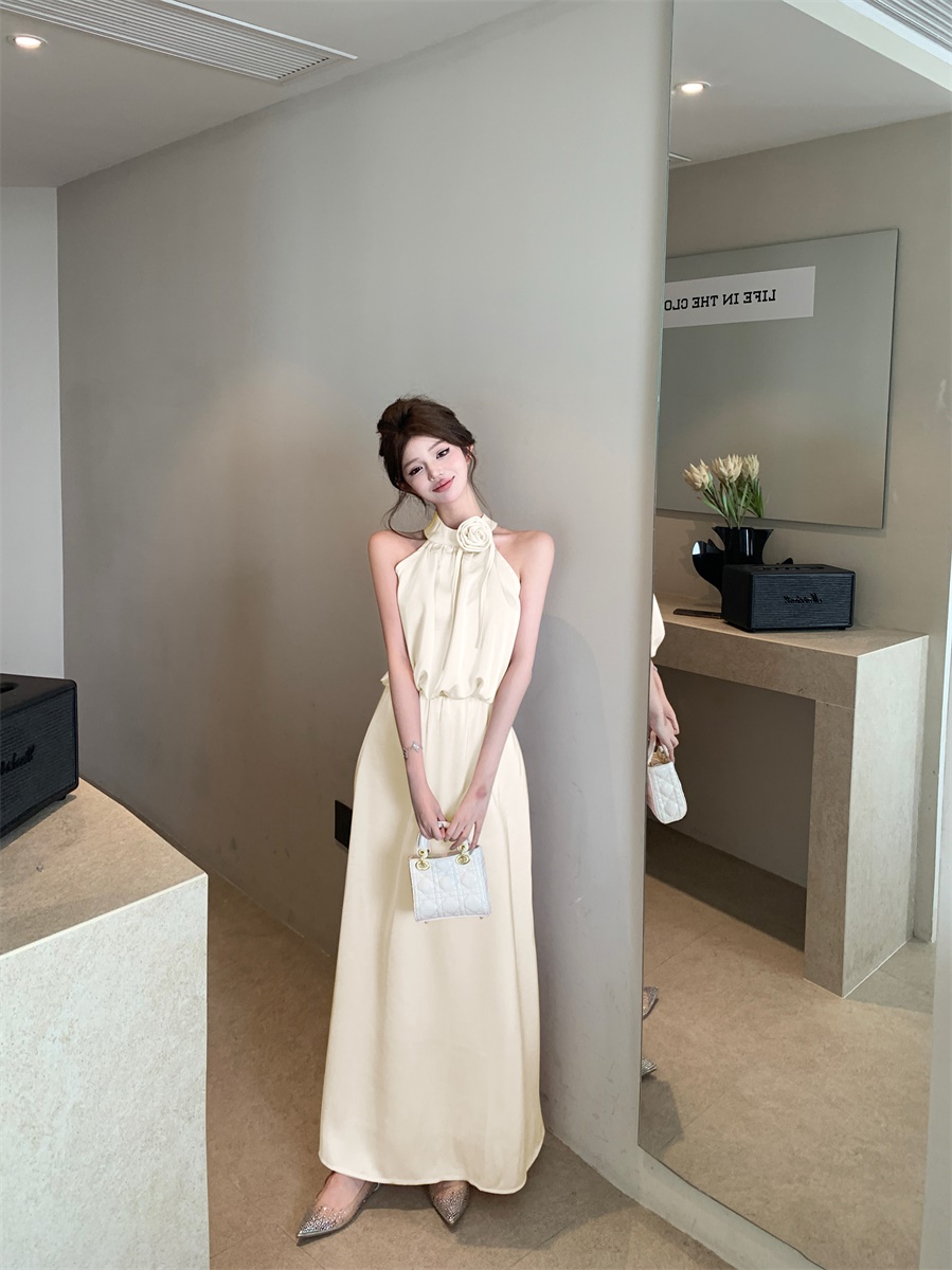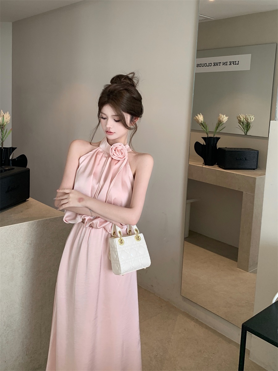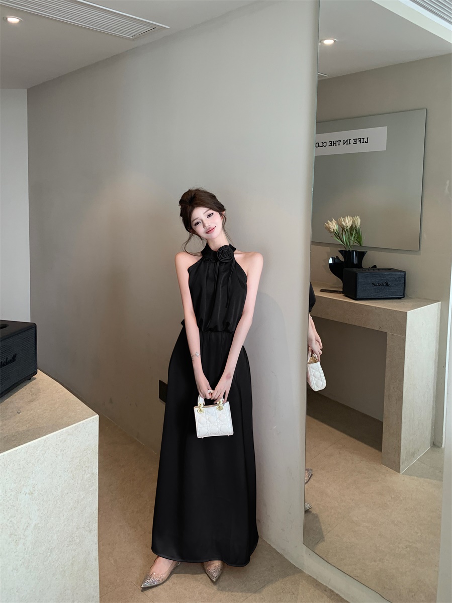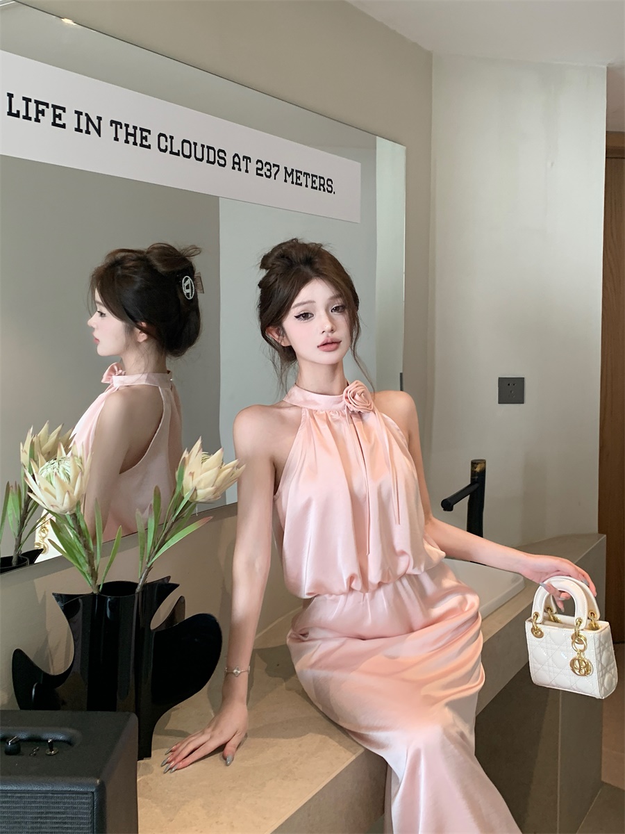高级法式夏季套装立体花朵气质无袖背心缎面上衣高腰半身裙两件套