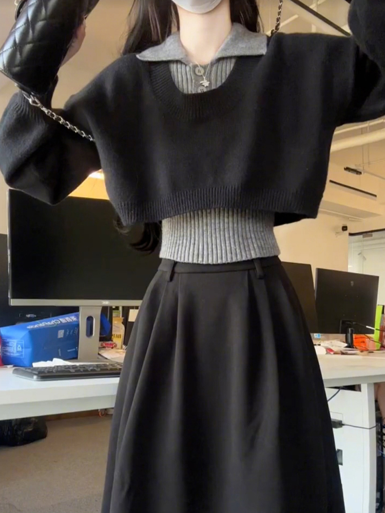 入冬穿搭一整套小个子香风黑色连衣裙女初秋季2025年新款两件套装